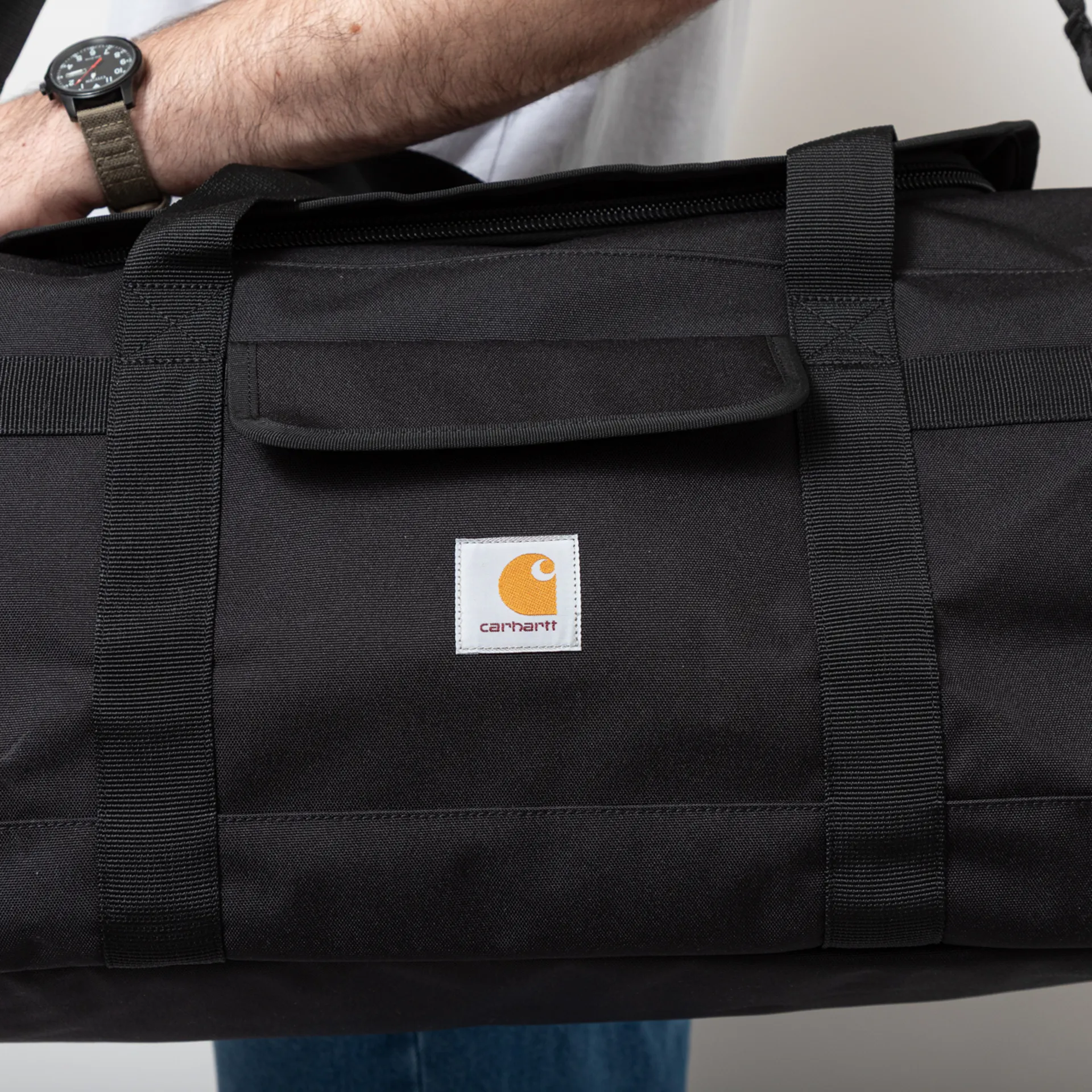 The Jack Duffle Bag from Carhartt WIP is constructed from water-repellent, recycled polyester canvas. It features a main compartment with a two-way zip closure, a front pocket with flap closure and an interior pocket with zip closure. The bag is unlined with binding at all seams for durability, with an adjustable shoulder strap and two carry handles. Finished off with the classic Carhartt WIP square label to the front.