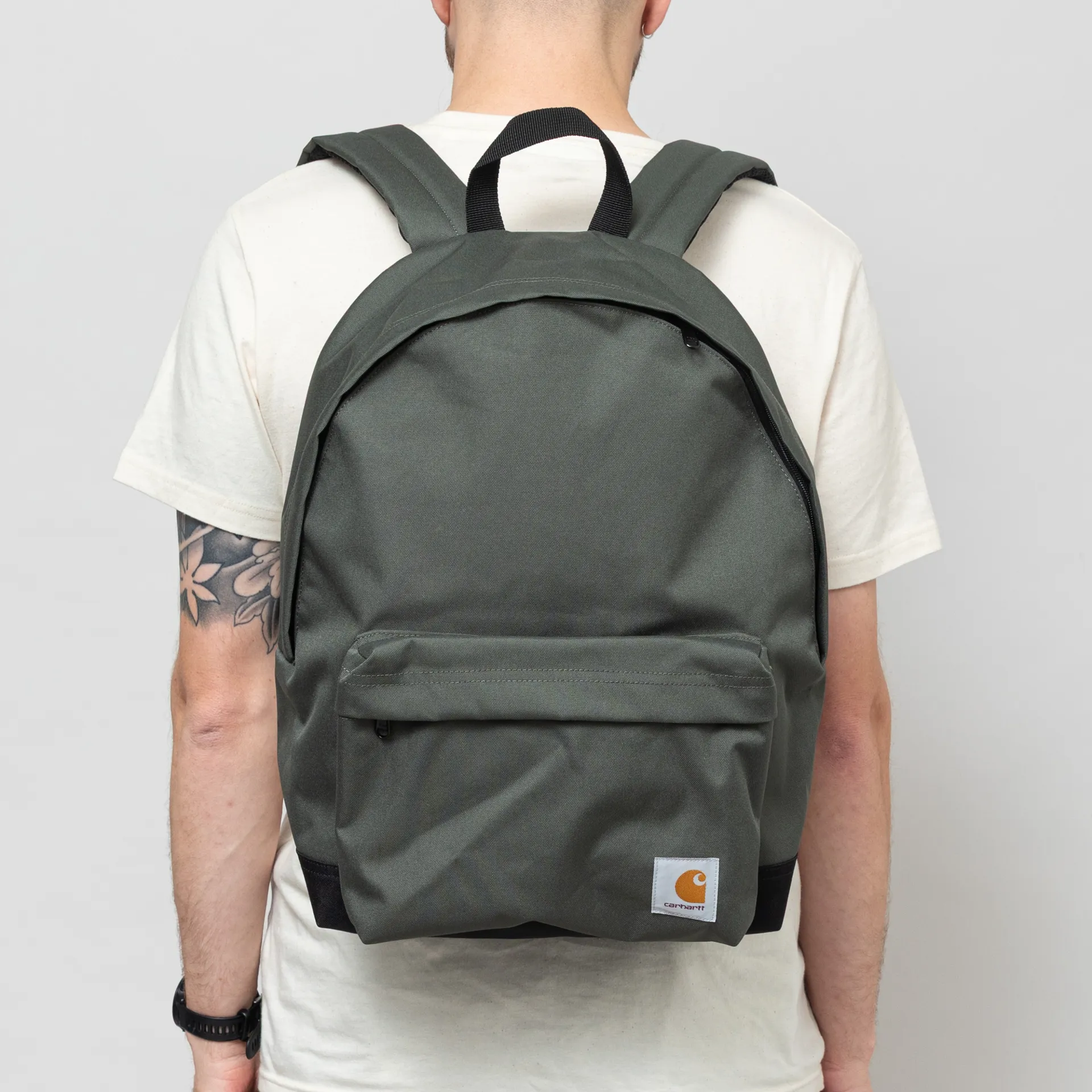 The Jake backpack from Carhartt WIP is constructed from water-repellent, recycled polyester canvas with a CORDURA base. It has a single main compartment, which houses a padded laptop pouch and a small mesh pocket. To the outside you'll find a zipped pocket, a padded back panel for comfort and adjustable shoulder straps. The design is complete with the classic Carhartt square label to the front.