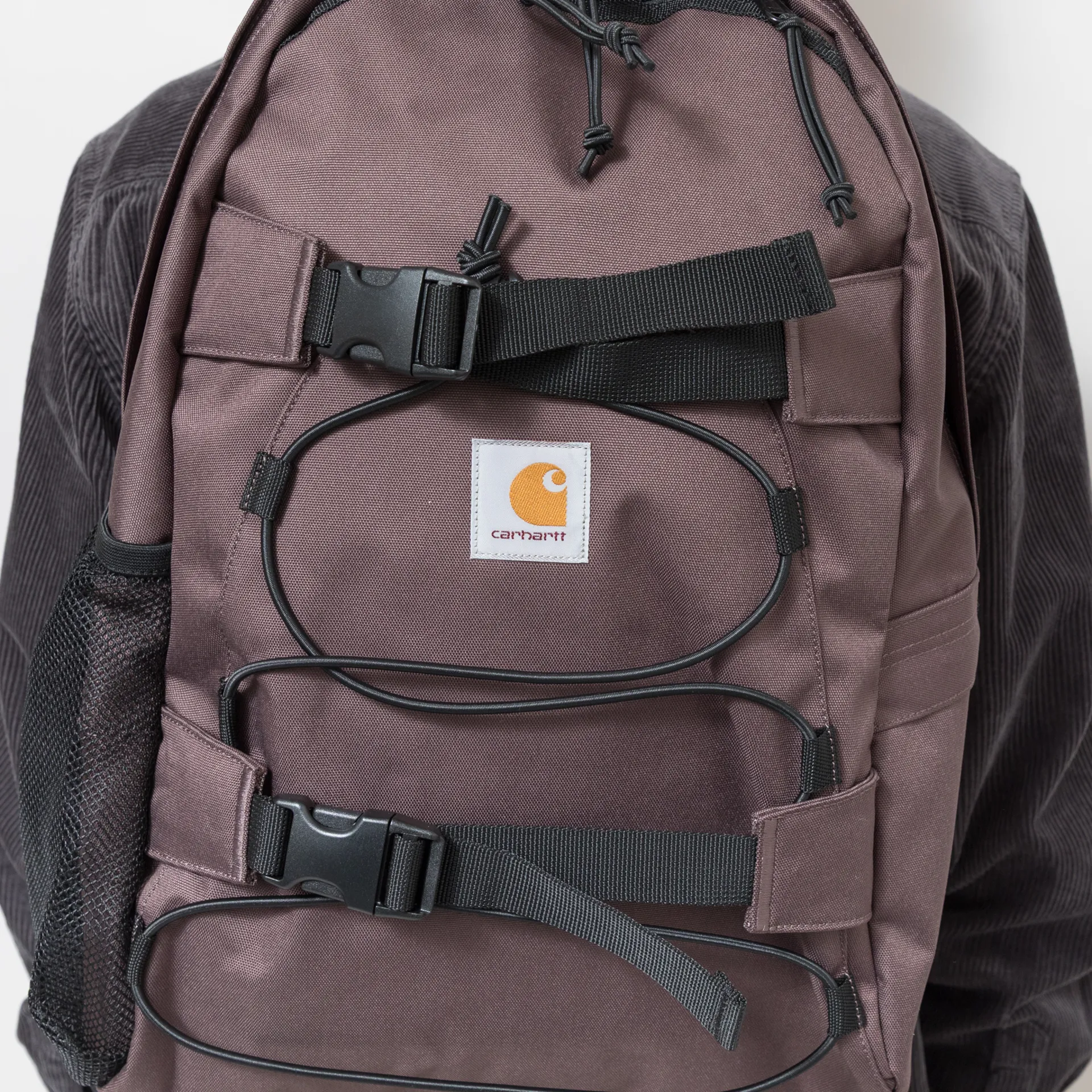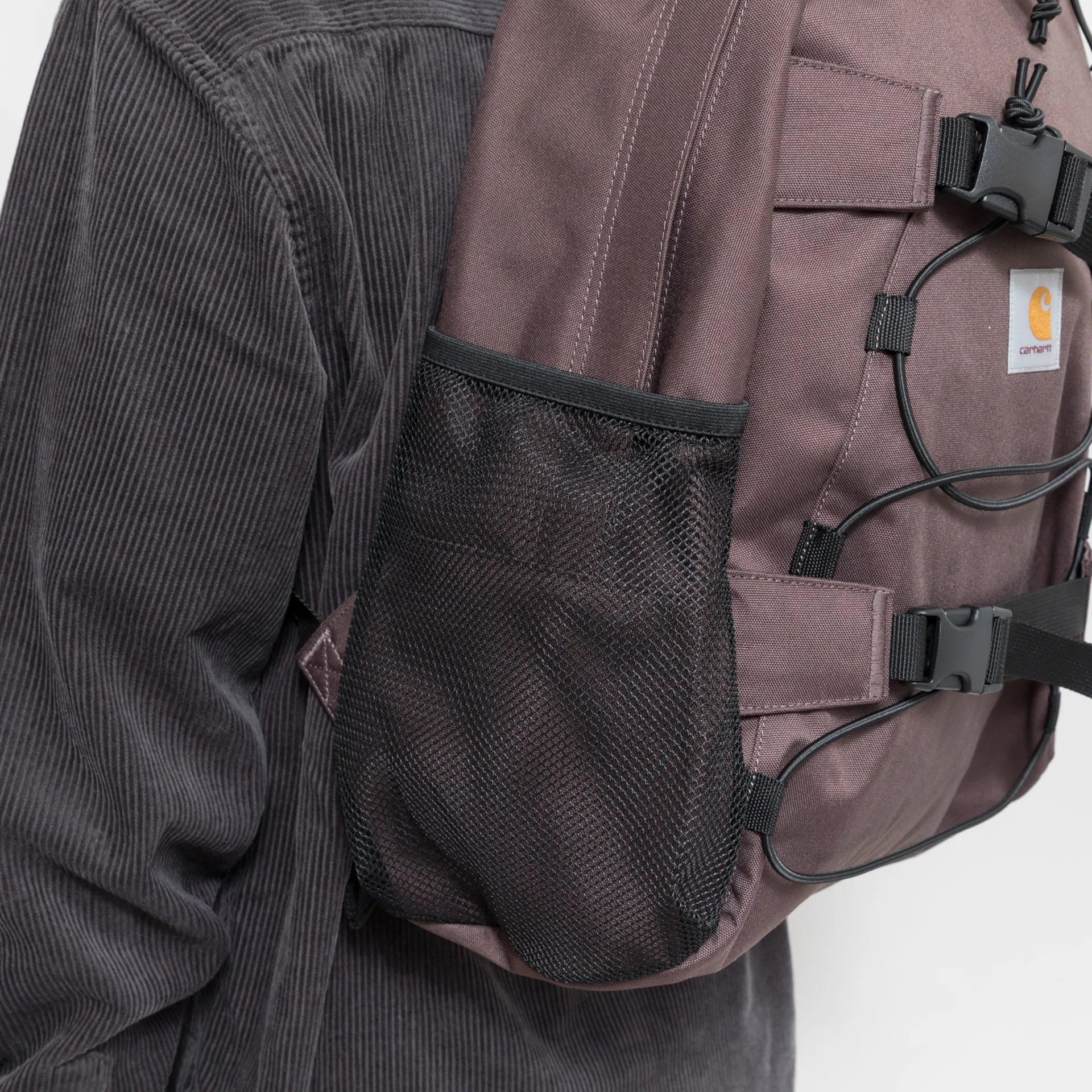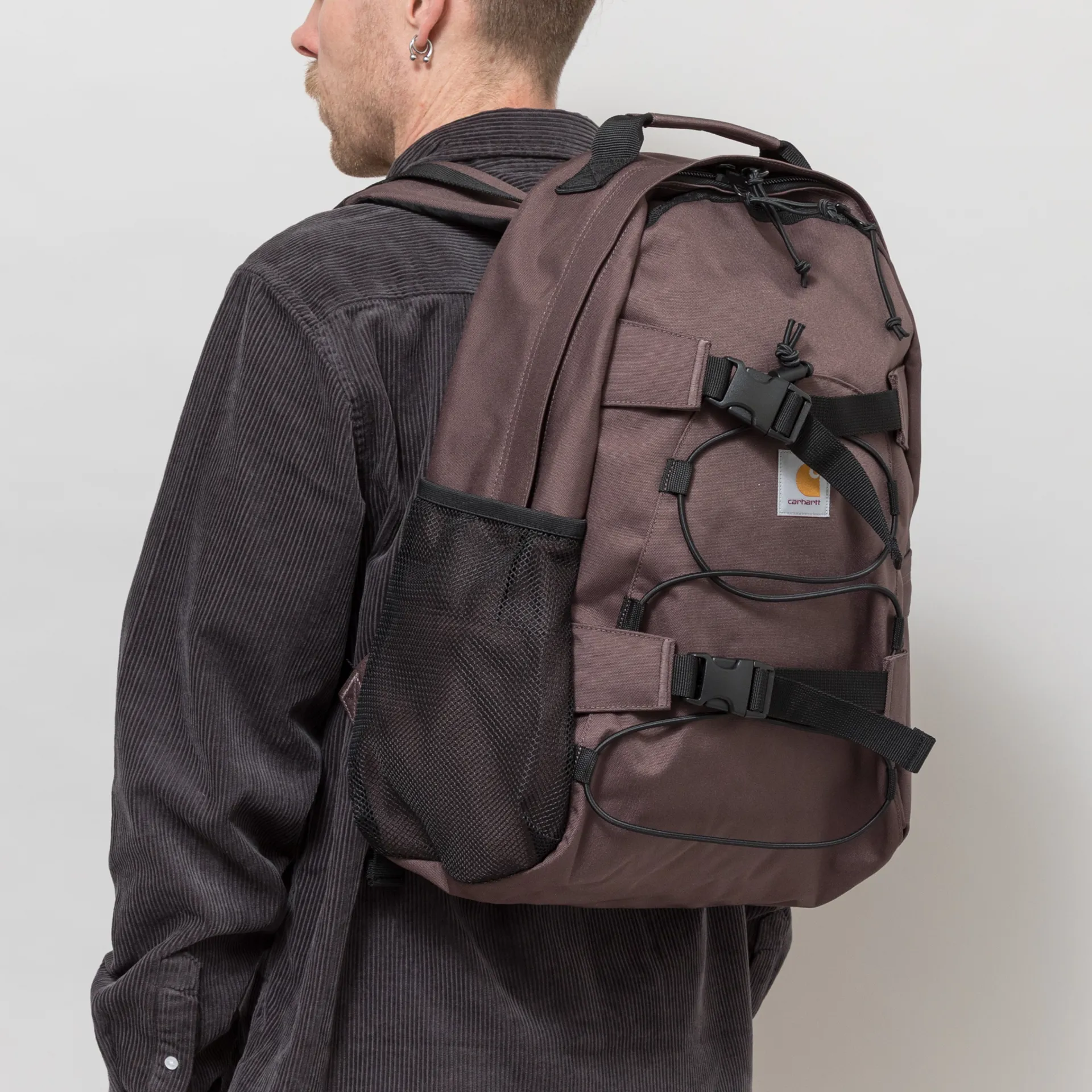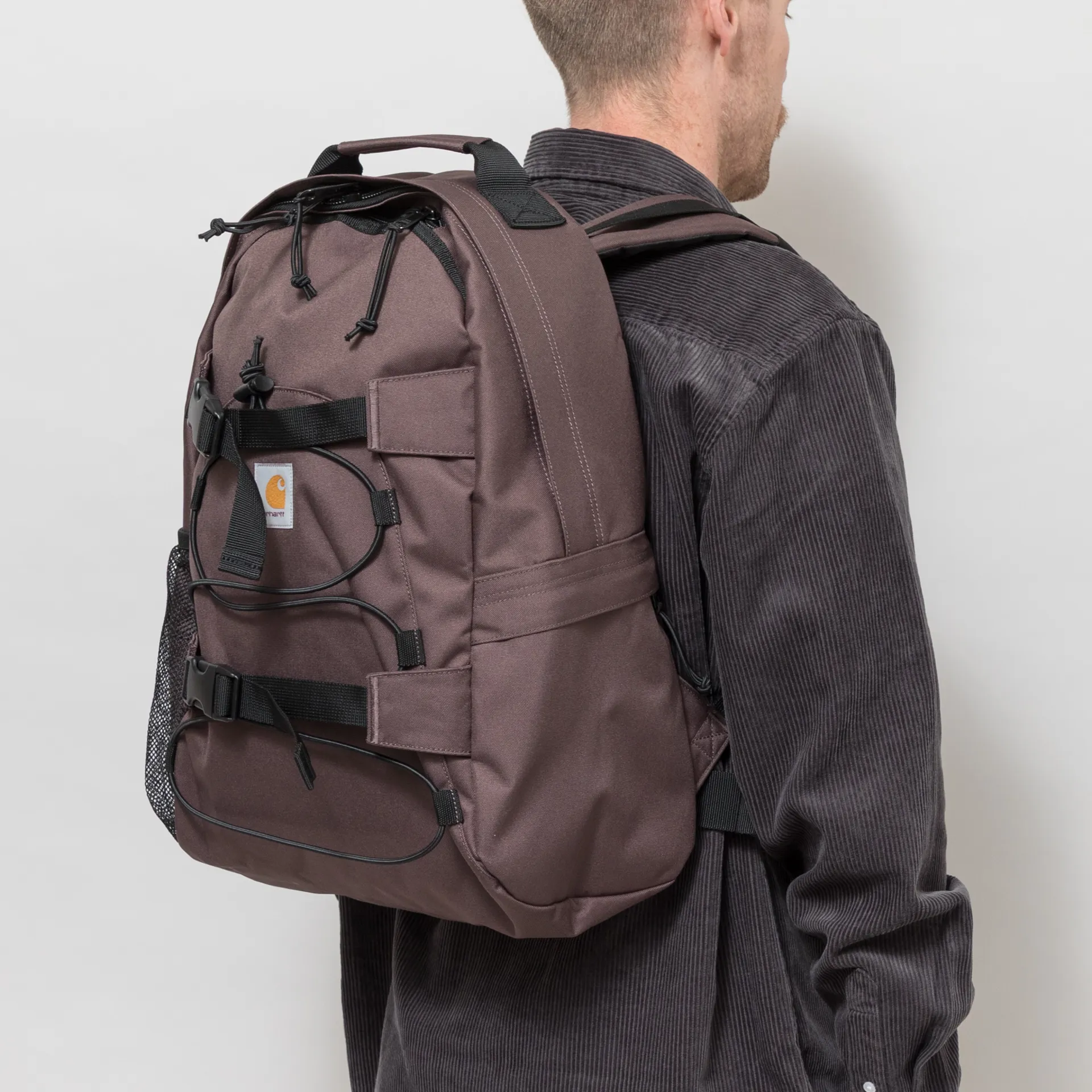 This unlined rucksack from Carhartt WIP is made from a water-repellent and durable recycled polyester canvas, featuring both mesh and zipped side pockets, the main compartment fastens with a two-way zip closure. It has a padded backboard and shoulder straps for a more cushioned feel, while buckles throughout and elastic board straps offer extra functionality.
