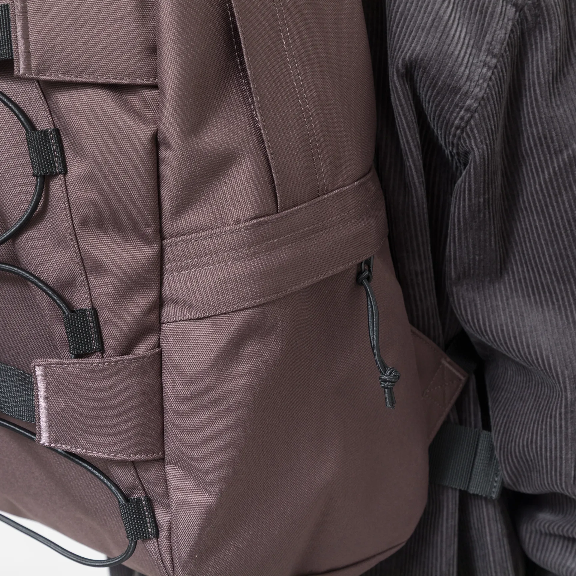 A rucksack from Carhartt WIP made from a waterproof and durable recycled polyester canvas, with a padded backboard and adjustable straps and bungee cord to the front.