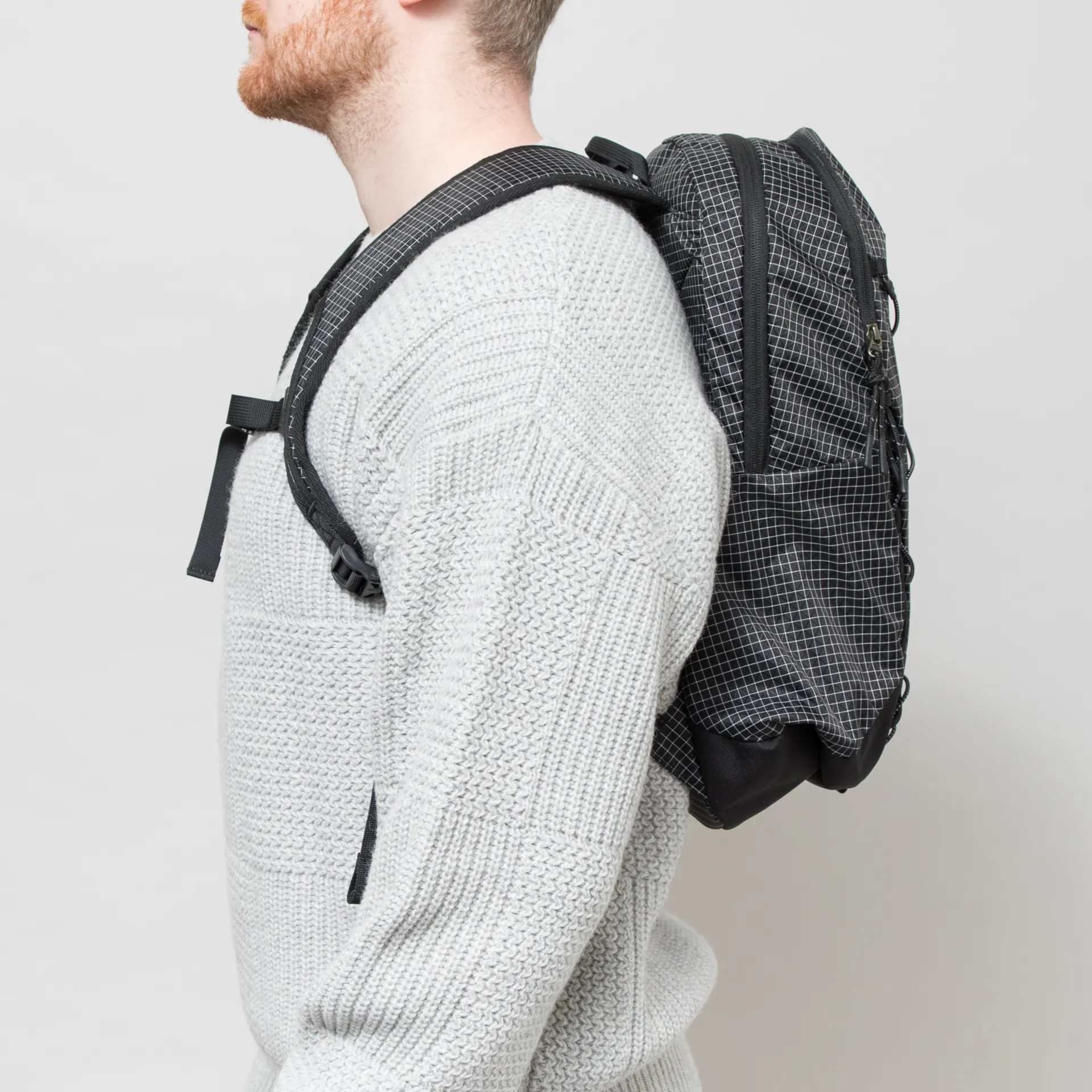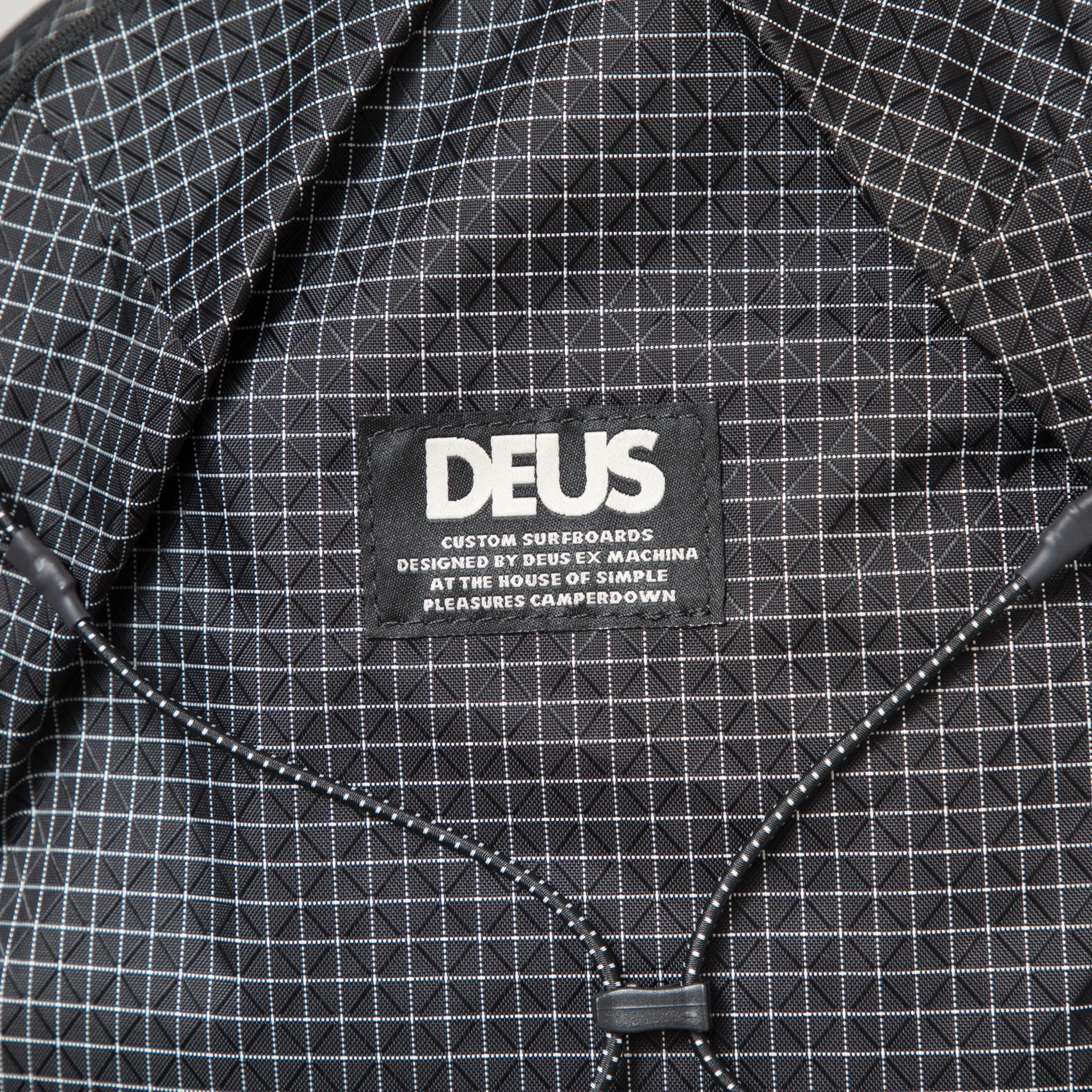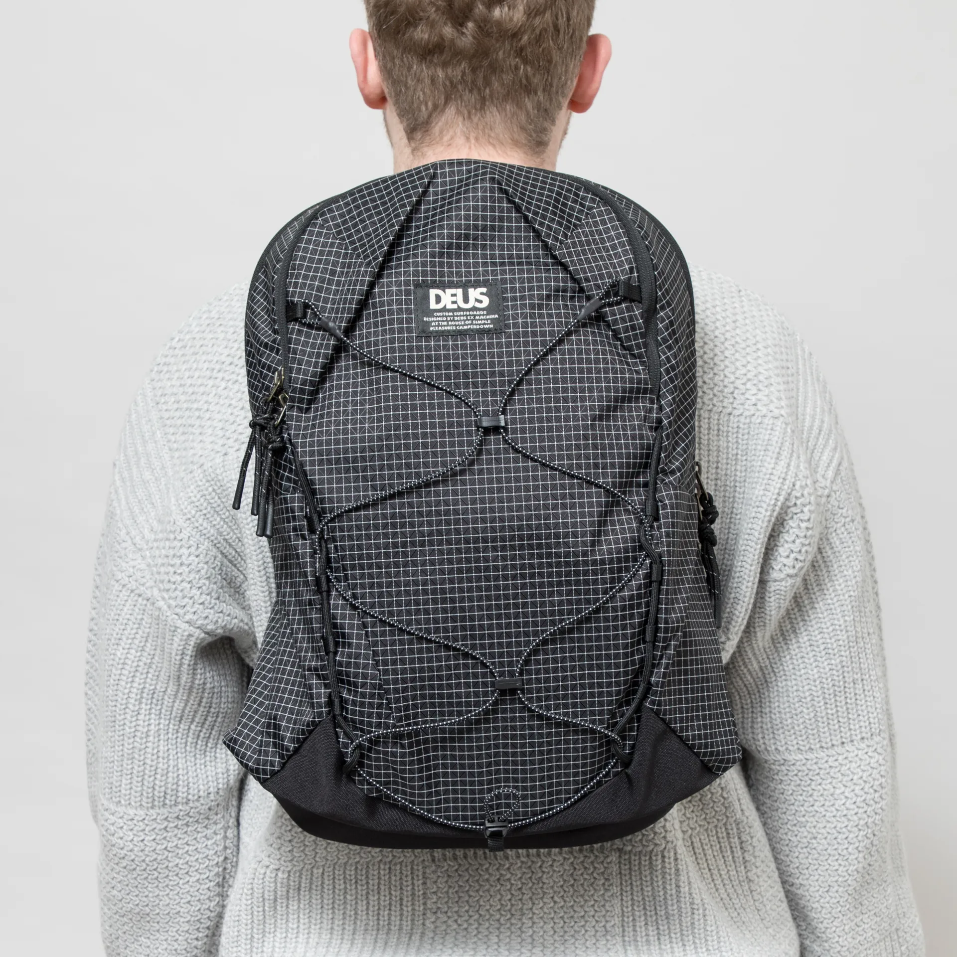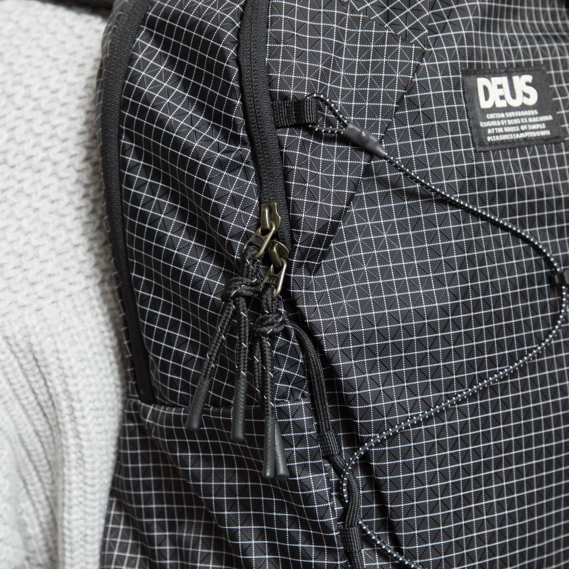 A backpack from Deus, constructed from durable nylon ripstop with an all-over grid design.