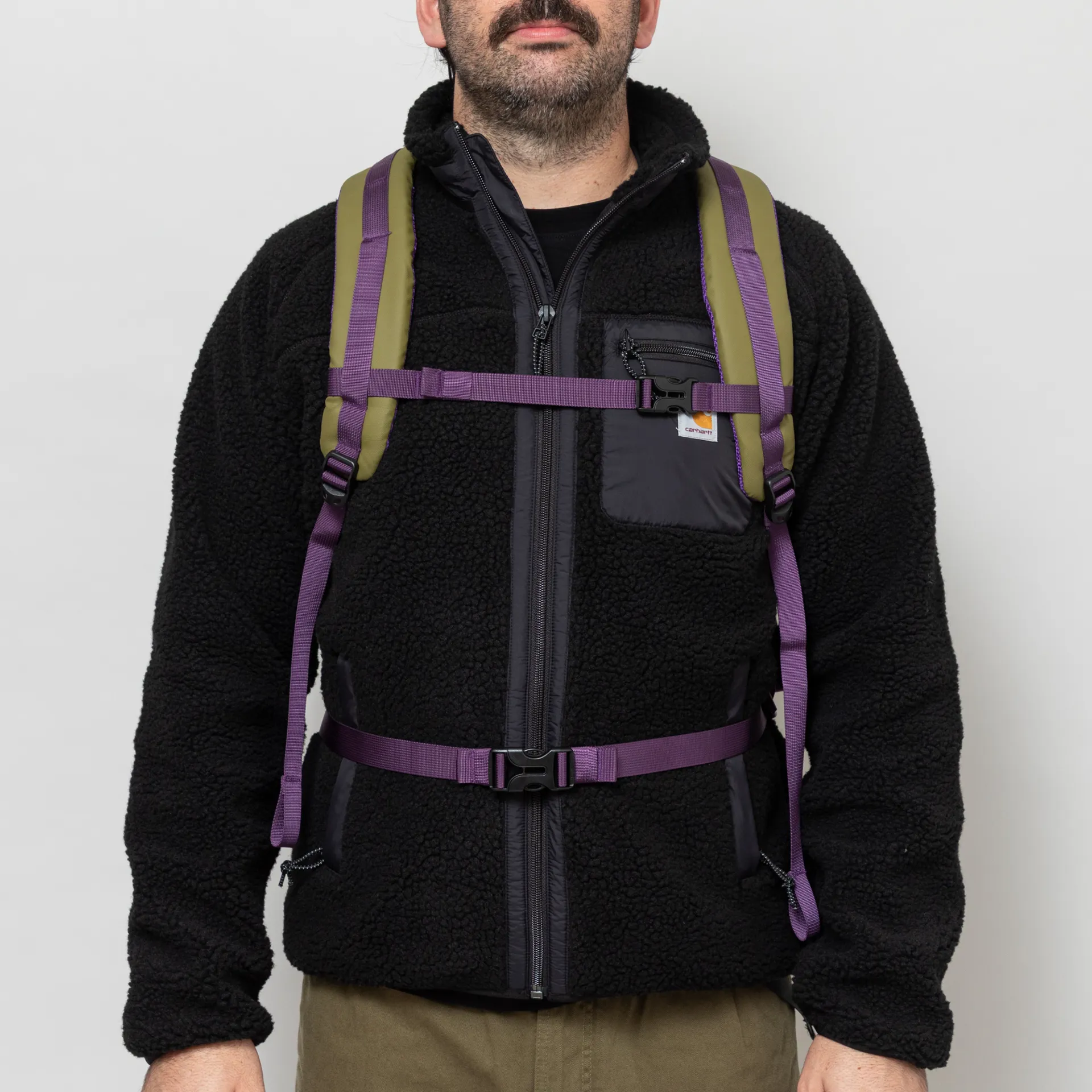 A durable roll-top backpack from Elliker, crafted from 100% recycled polyester with a waterproof PU coating and designed for custom carry and expandable storage. It has a roll-top opening that can be clipped two ways, a rear waterproof YKK zip which opens directly to the main compartment and an external padded laptop sleeve that fits up 16 inches. With adjustable slip pockets, a large front pocket with elastic stowage cradle for utility.