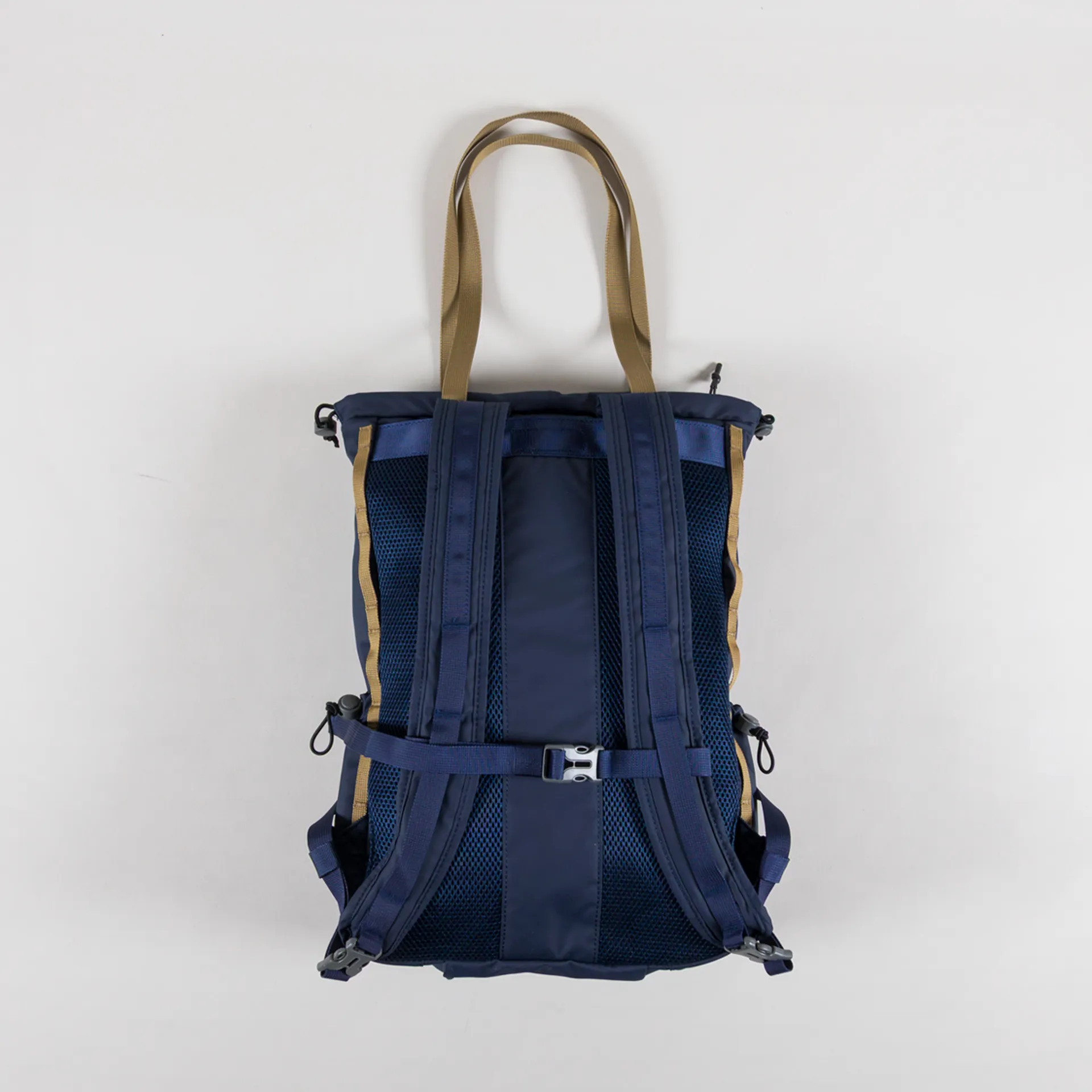 The Elliker Penniyn is a versatile, durable, and sustainable bag with a lightweight construction made from 600 Denier 100% recycled polyester with a PU coating, making it 100% waterproof and GRS certified, with a lining made of 210 Denier 100% recycled polyester. It provides waterproof protection from light rain and includes an adjustable pull string and zip top opening with YKK zips. The bag has daisy-chain looped front and rear webbing straps, an adjustable front elastic stowage cradle, a rear 15-inch padded laptop sleeve, water bottle slip pockets, and twin strap grab handles that can be worn over the shoulder. Additionally, it features adjustable ergonomic breathable padded mesh backpack straps that can be tucked away when not in use and multiple internal pockets for organizing gear.