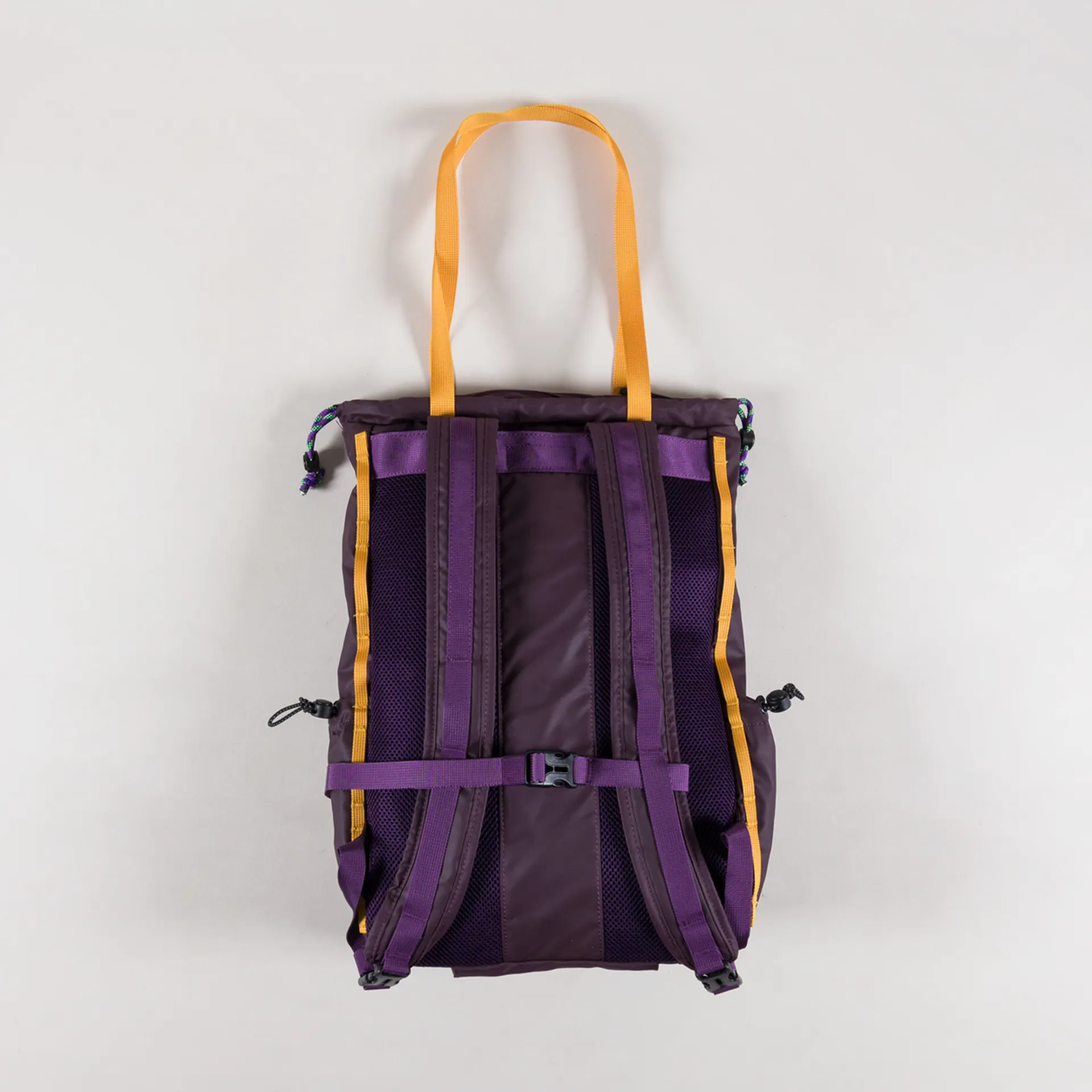 The Elliker Penniyn is a versatile, durable, and sustainable bag with a lightweight construction made from 600 Denier 100% recycled polyester with a PU coating, making it 100% waterproof and GRS certified, with a lining made of 210 Denier 100% recycled polyester. It provides waterproof protection from light rain and includes an adjustable pull string and zip top opening with YKK zips. The bag has daisy-chain looped front and rear webbing straps, an adjustable front elastic stowage cradle, a rear 15-inch padded laptop sleeve, water bottle slip pockets, and twin strap grab handles that can be worn over the shoulder. Additionally, it features adjustable ergonomic breathable padded mesh backpack straps that can be tucked away when not in use and multiple internal pockets for organizing gear.