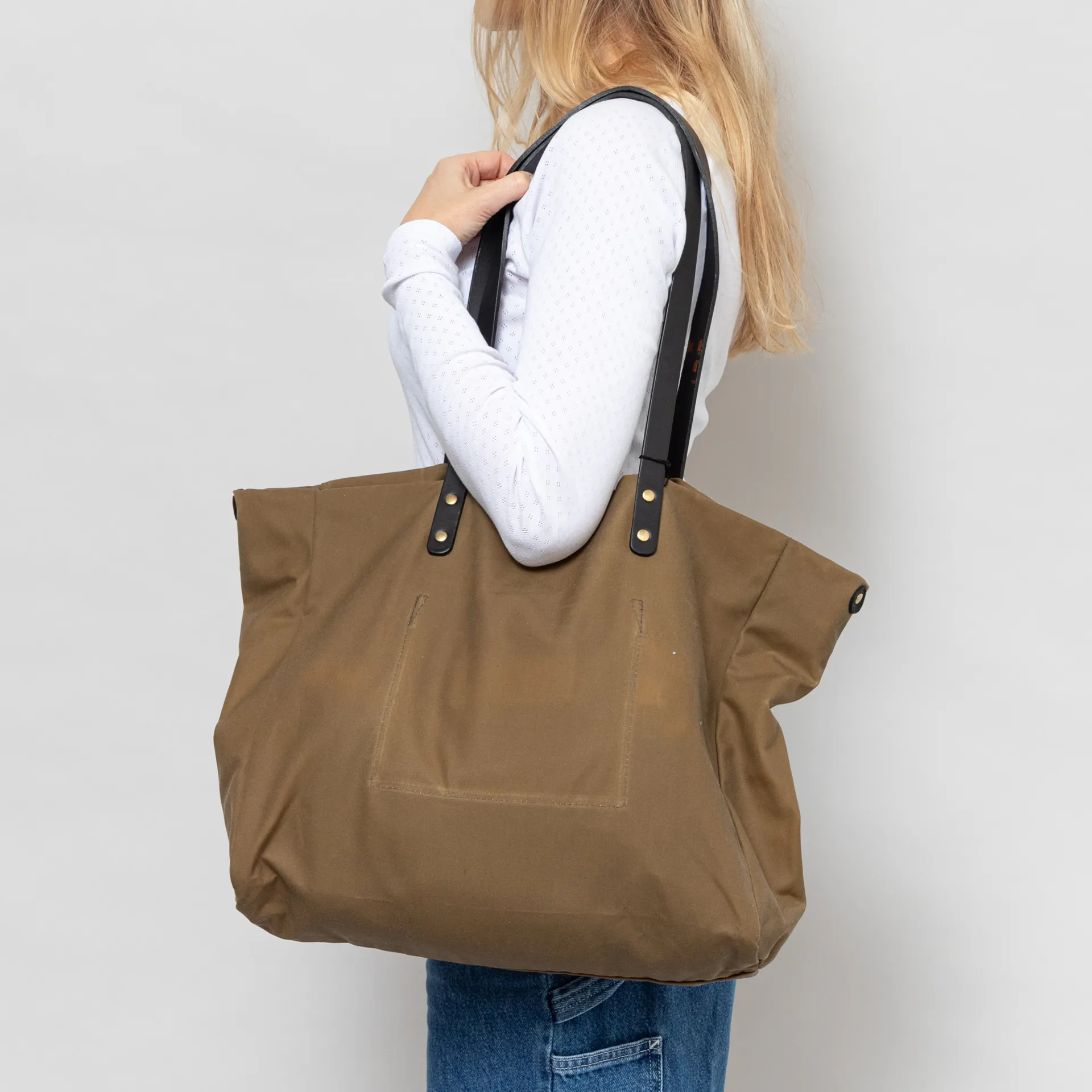 A tote bag from Kate Sheridan, constructed with Halley Stevenson antique style water resistant waxed cotton with hand painted Italian vegetable tanned leather handles.