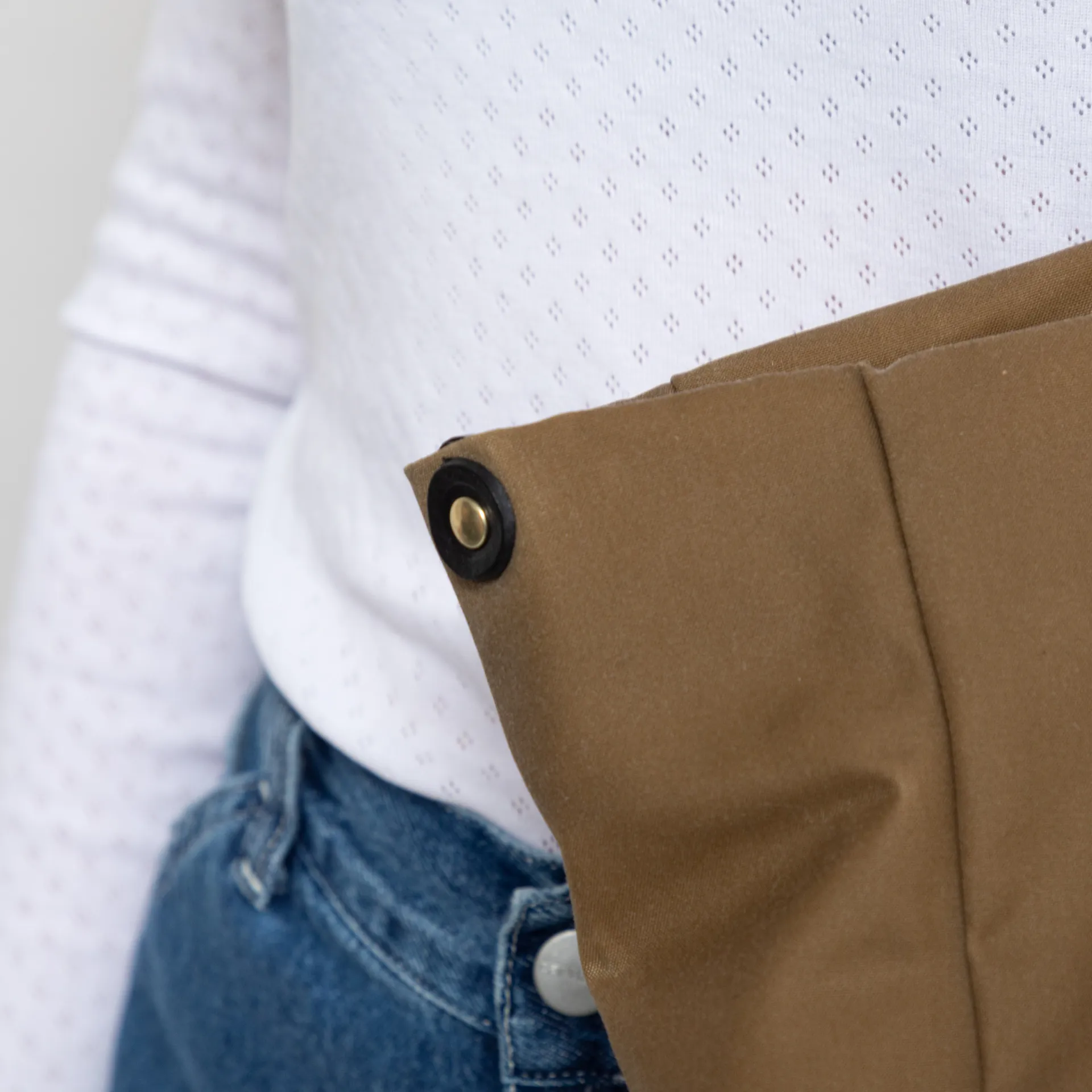A tote bag from Kate Sheridan, constructed with Halley Stevenson antique style water resistant waxed cotton with hand painted Italian vegetable tanned leather handles. It has a magnetic fastener at the opening, with a simple unlined interior, a single slip pocket and side popper tabs to adjust the shape and size of the bag.