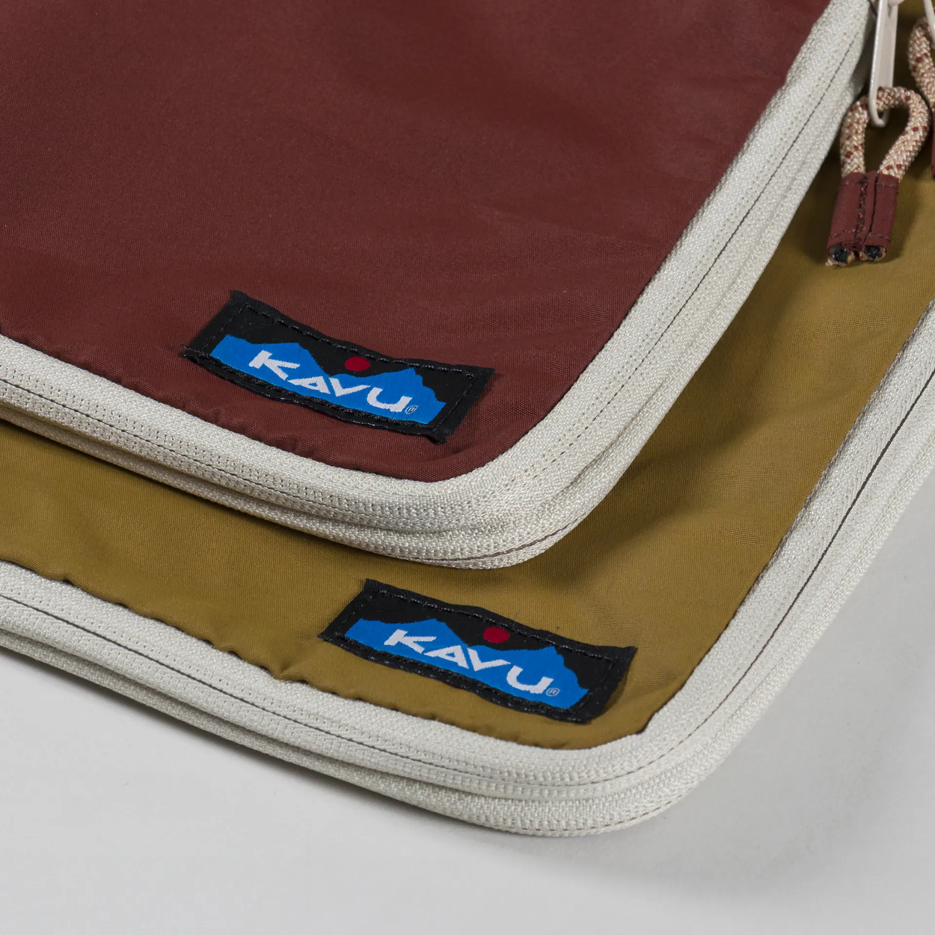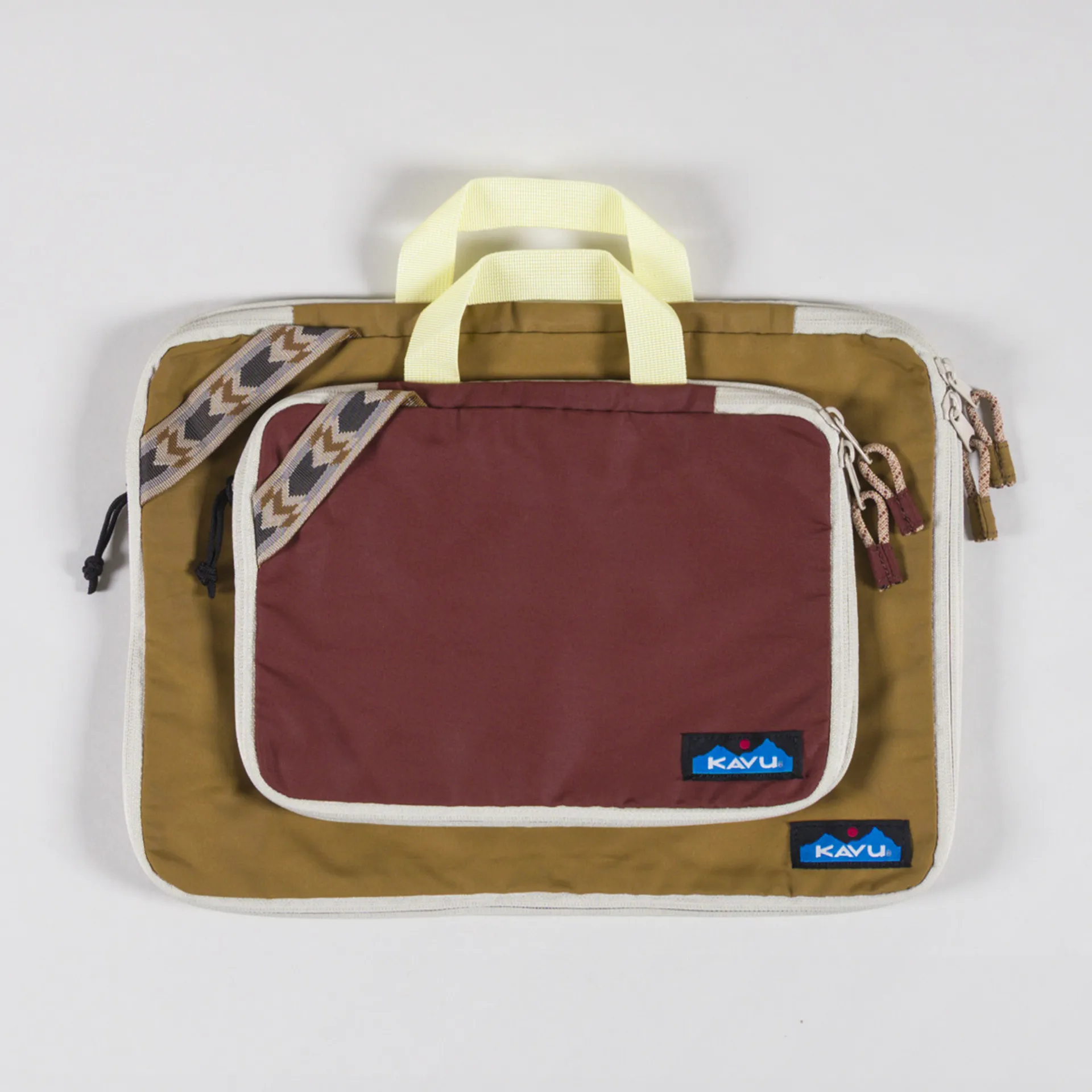 A pack of two packing cubes from Kavu, both with zip closure, webbing strap handles and a woven Kavu patch.