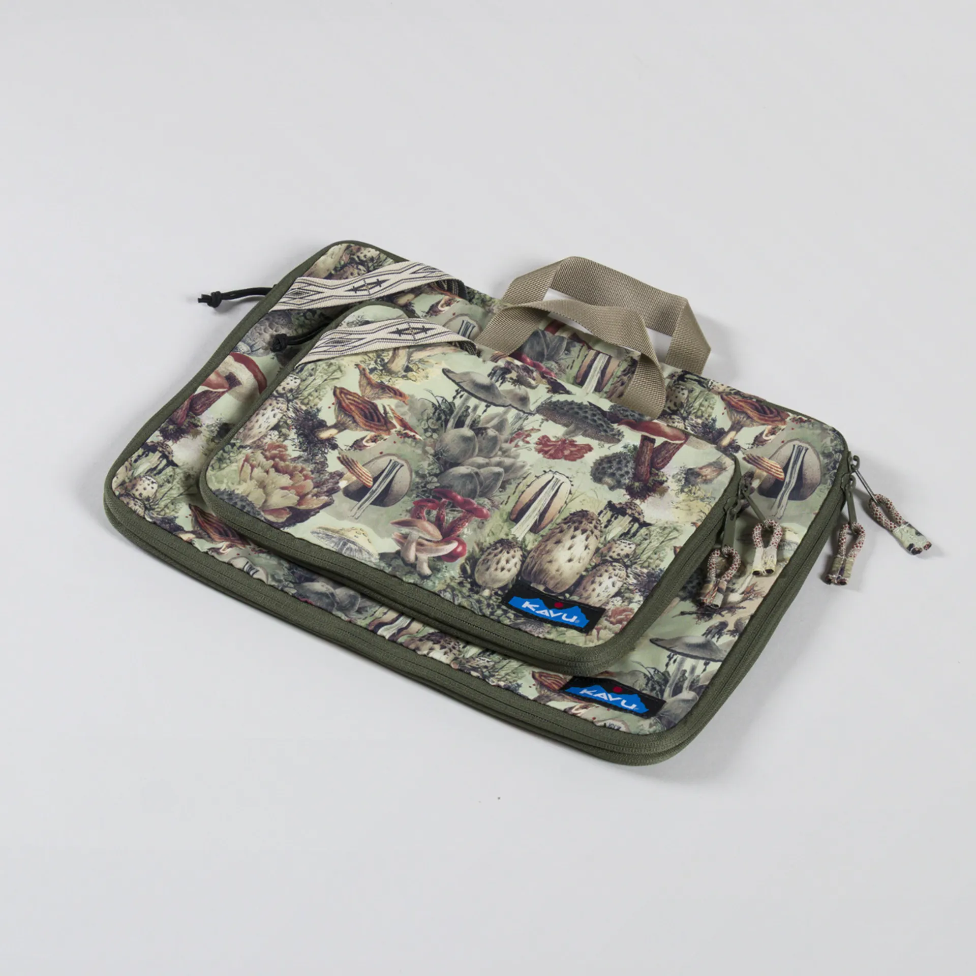 A pack of two packing cubes from Kavu, both with zip closure, webbing strap handles and a woven Kavu patch.