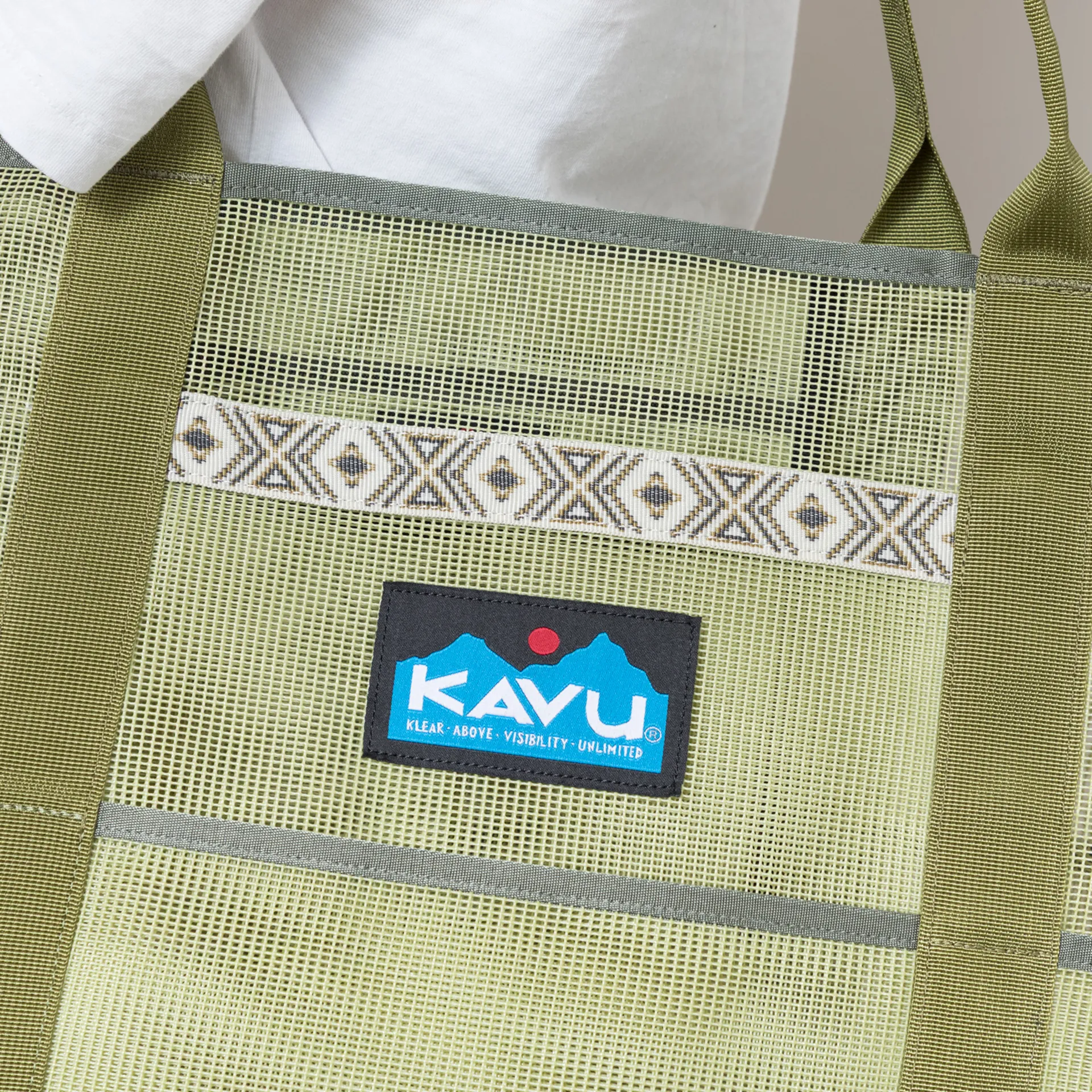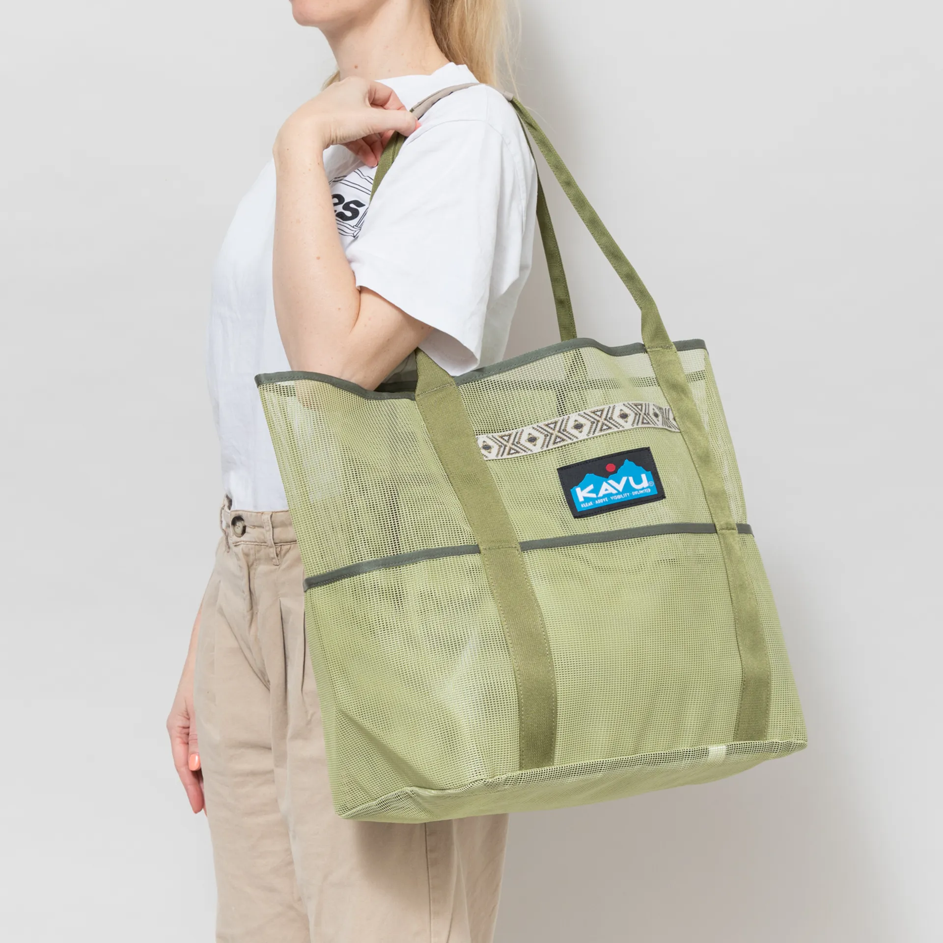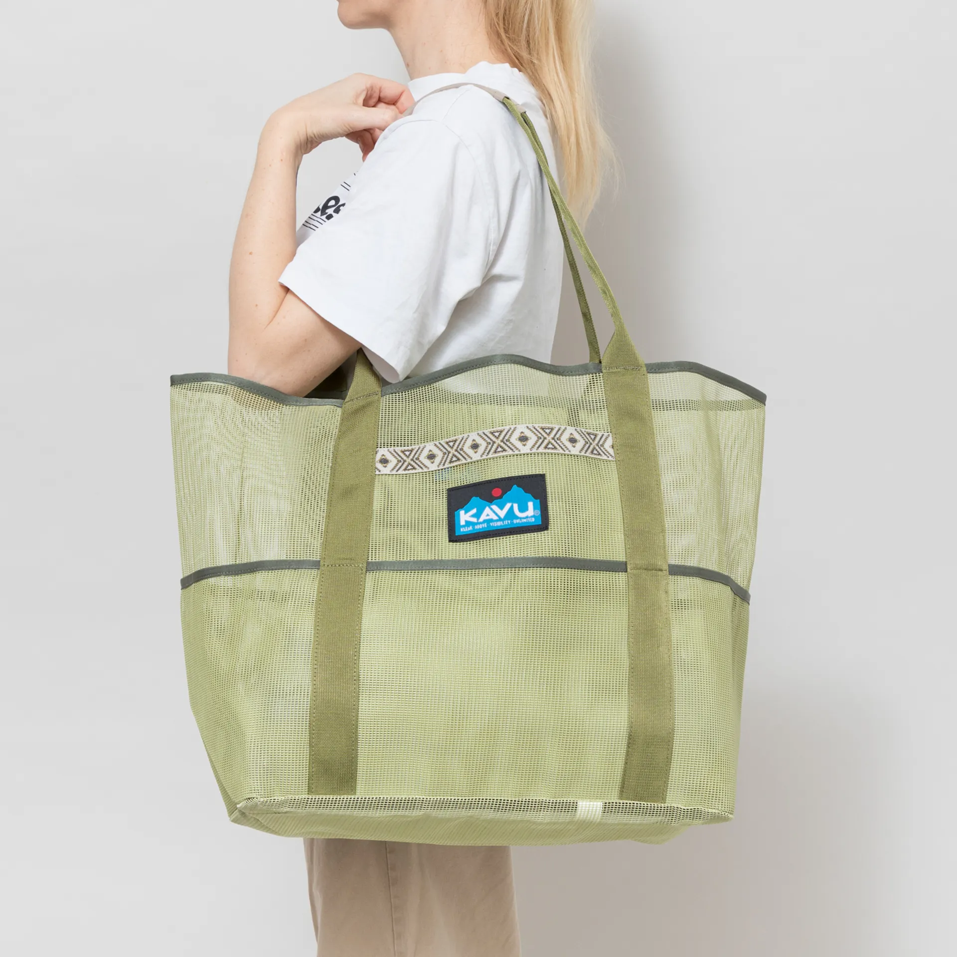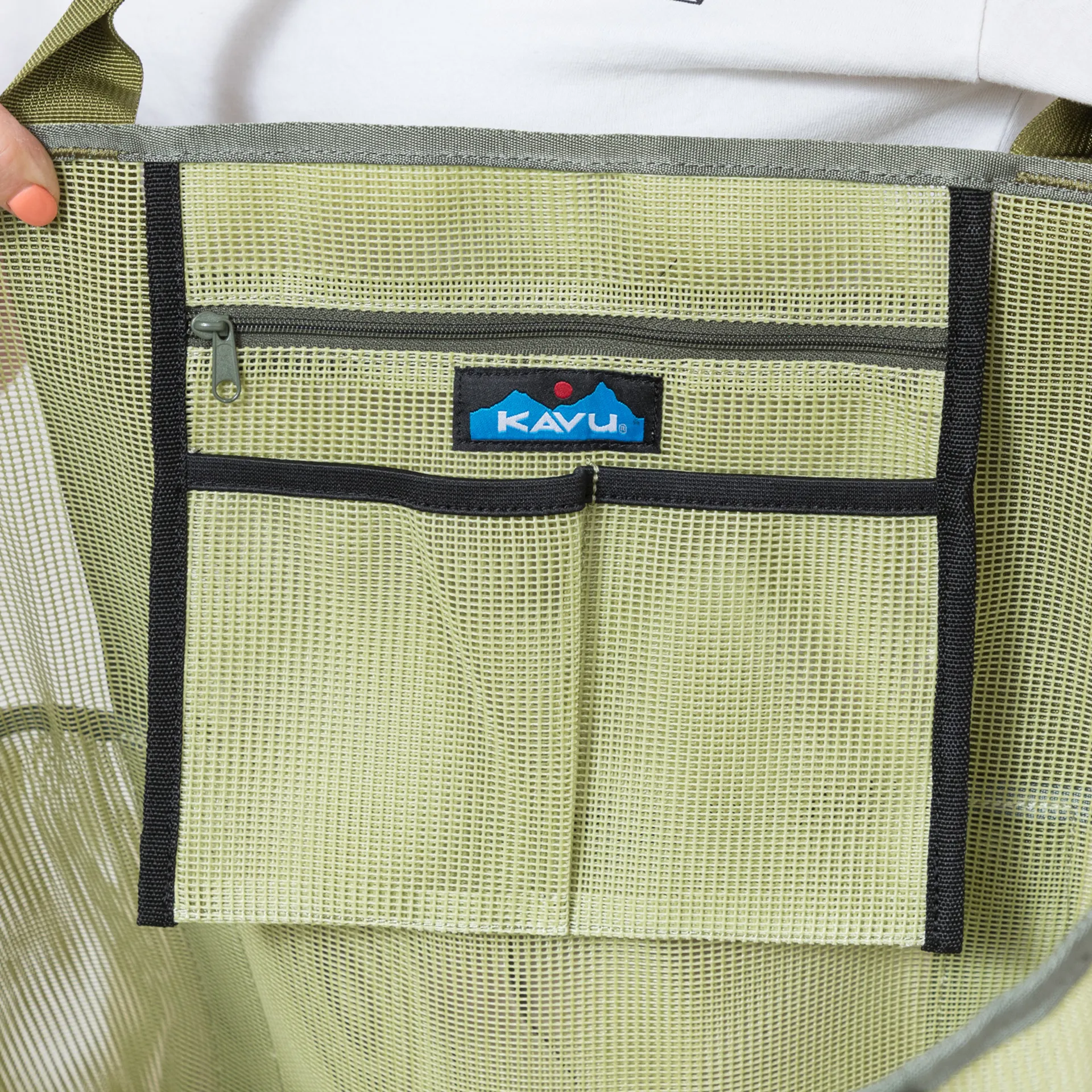 A large tote bag from Kavu, made from a polyester mesh with a main compartment alongside four pouches around the sides. It has a jacuqard tape and a woven logo patch.