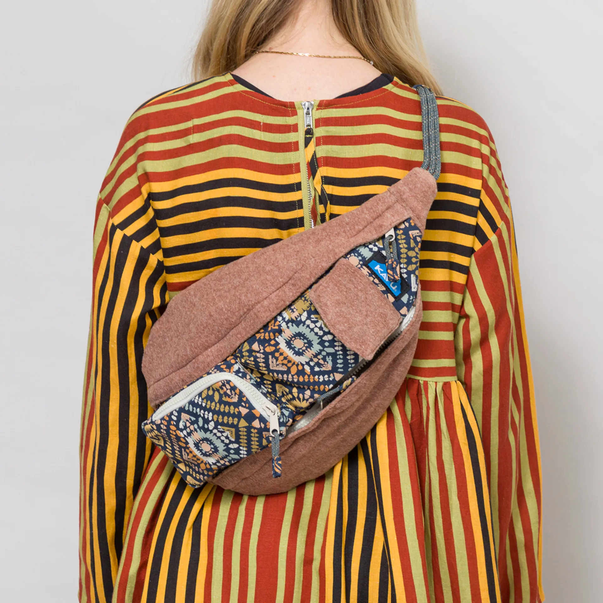 A shoulder sling from Kavu, made from a canvas, wool and polyester blend outer with a polyester lining
