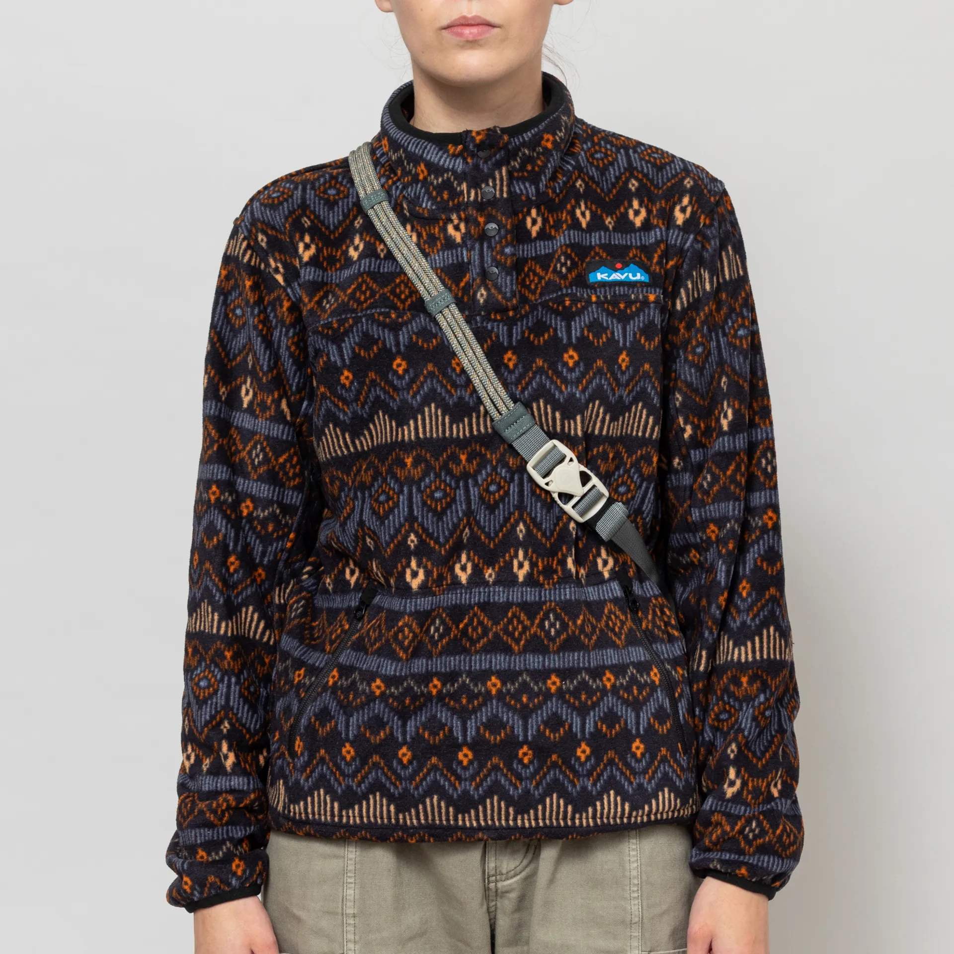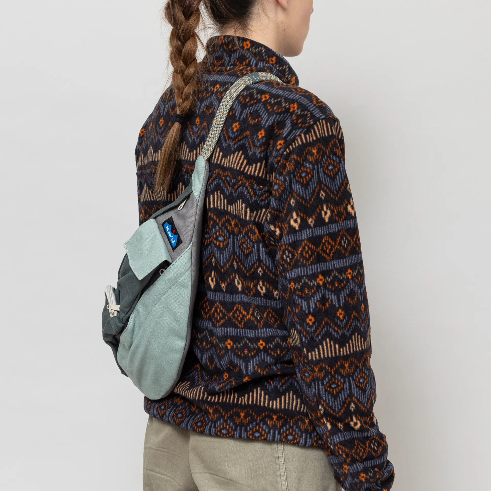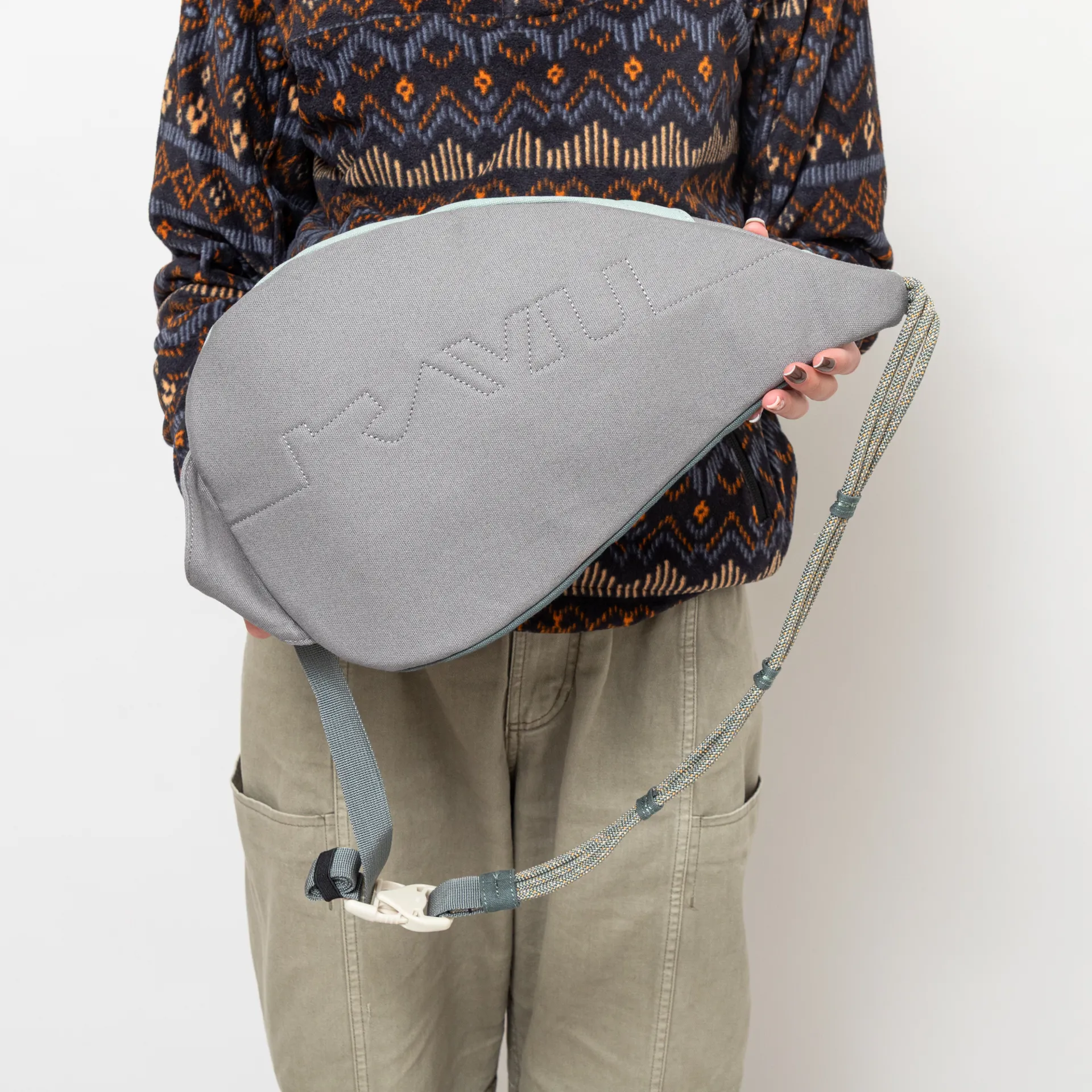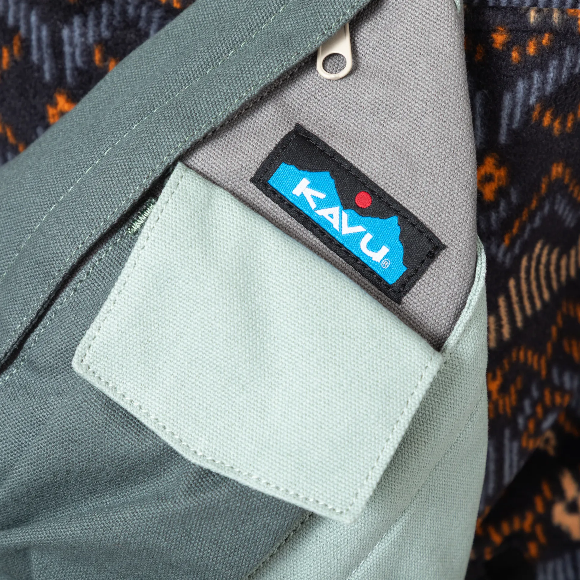 A shoulder sling from Kavu, made from a canvas outer with a nylon cloth lining, three zippered compartments and a Velcro pocket. It has a padded backboard and an adjustable strap.