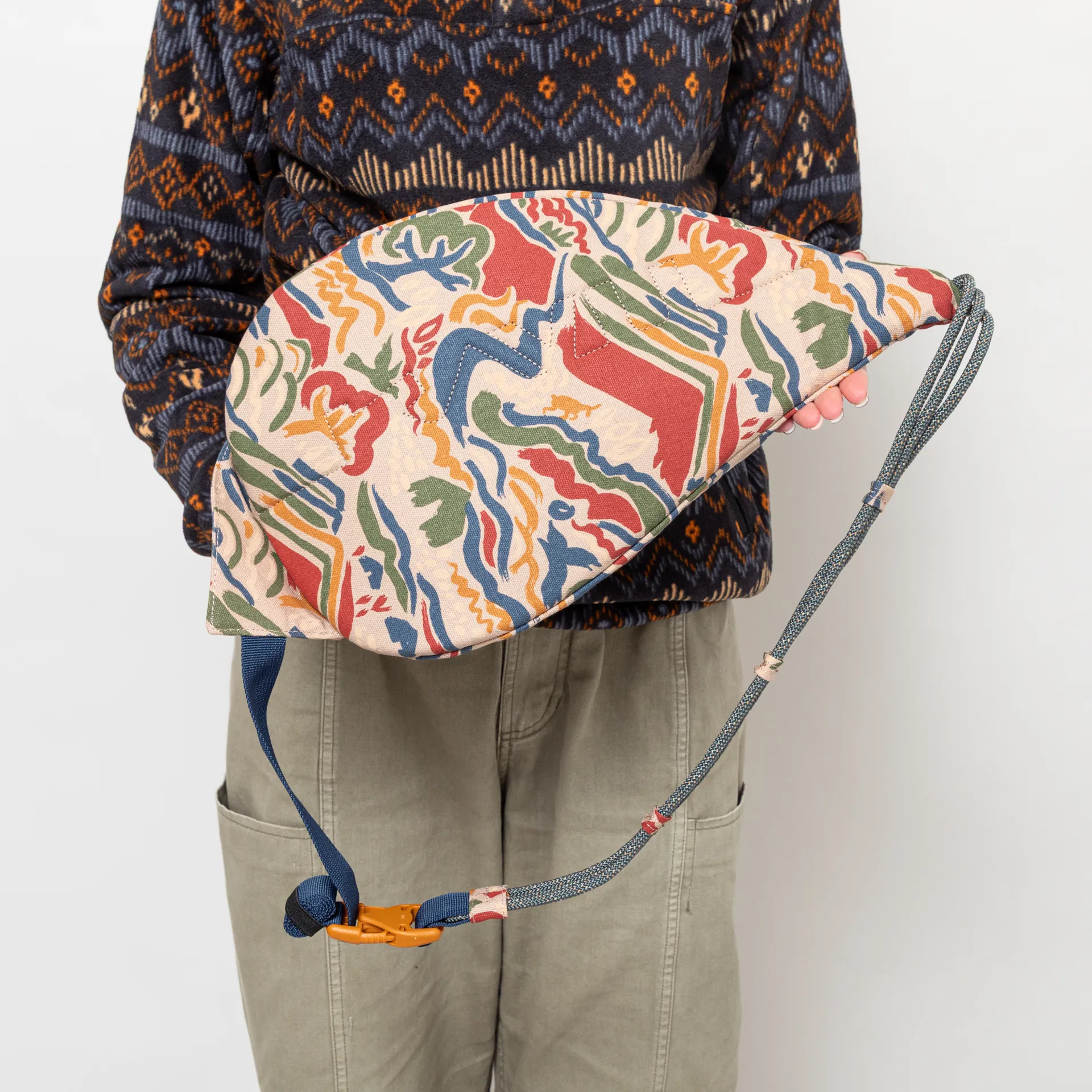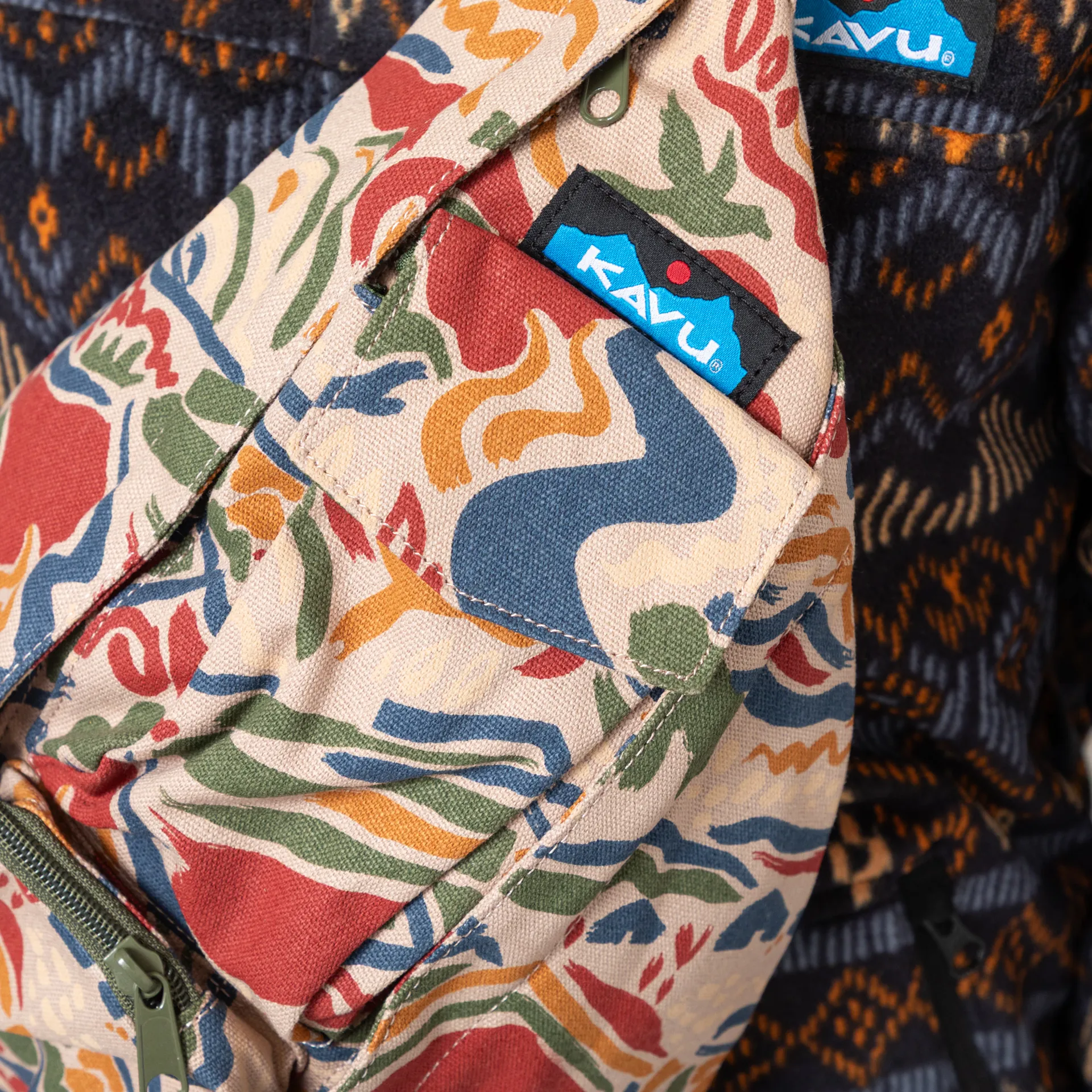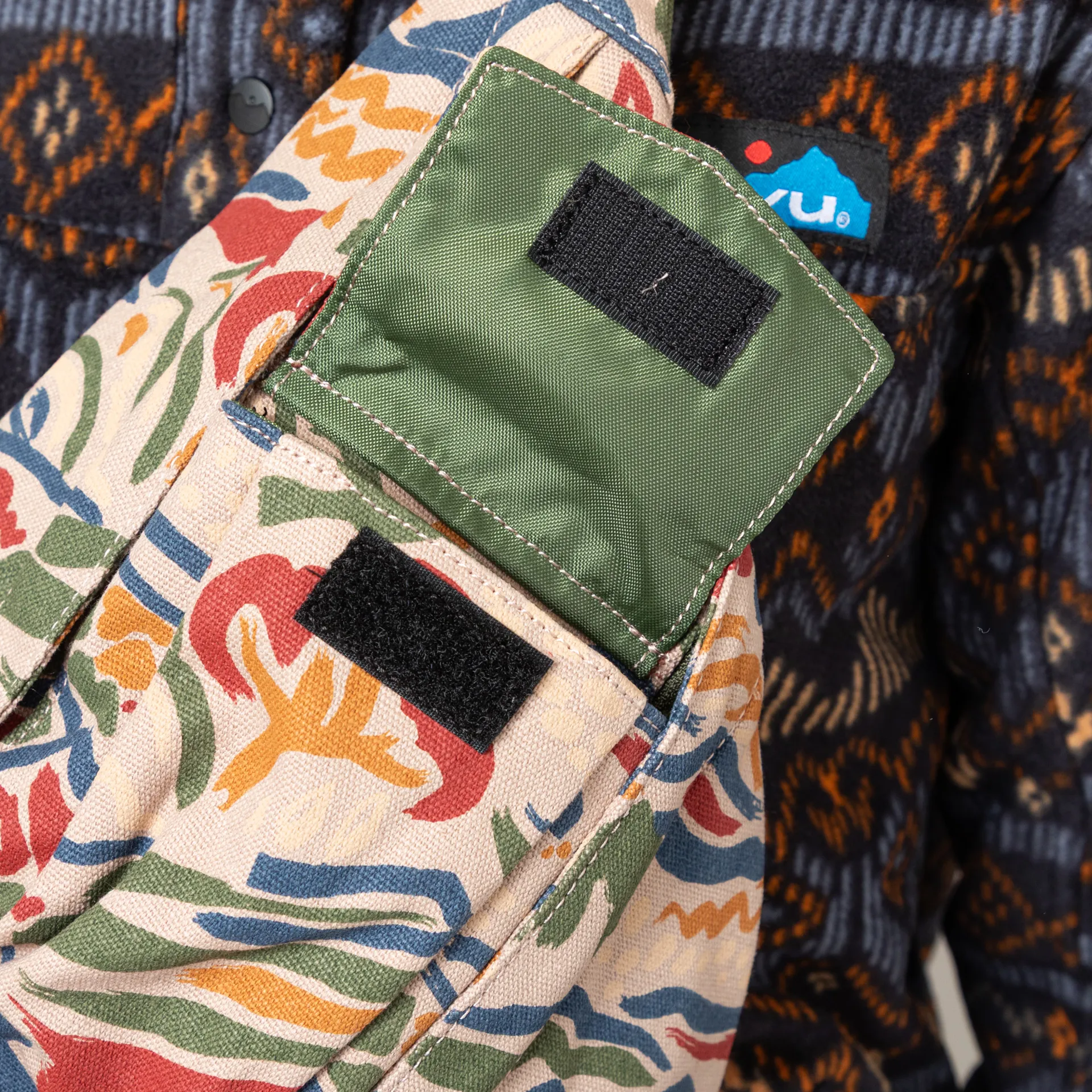 A shoulder sling from Kavu, made from a canvas outer with a nylon cloth lining, three zippered compartments and a Velcro pocket. It has a padded backboard and an adjustable strap.