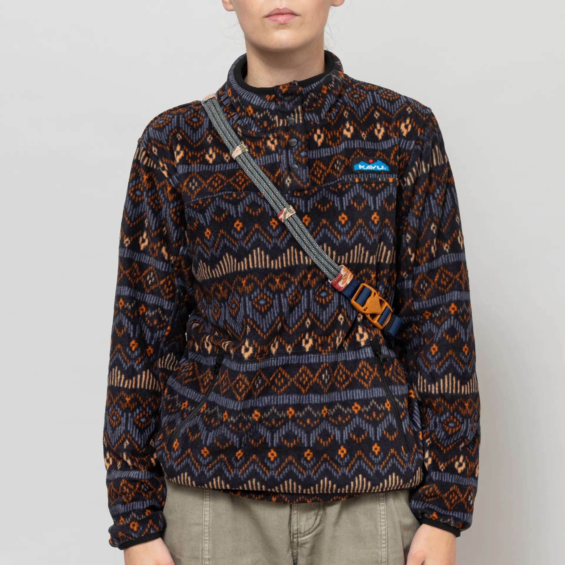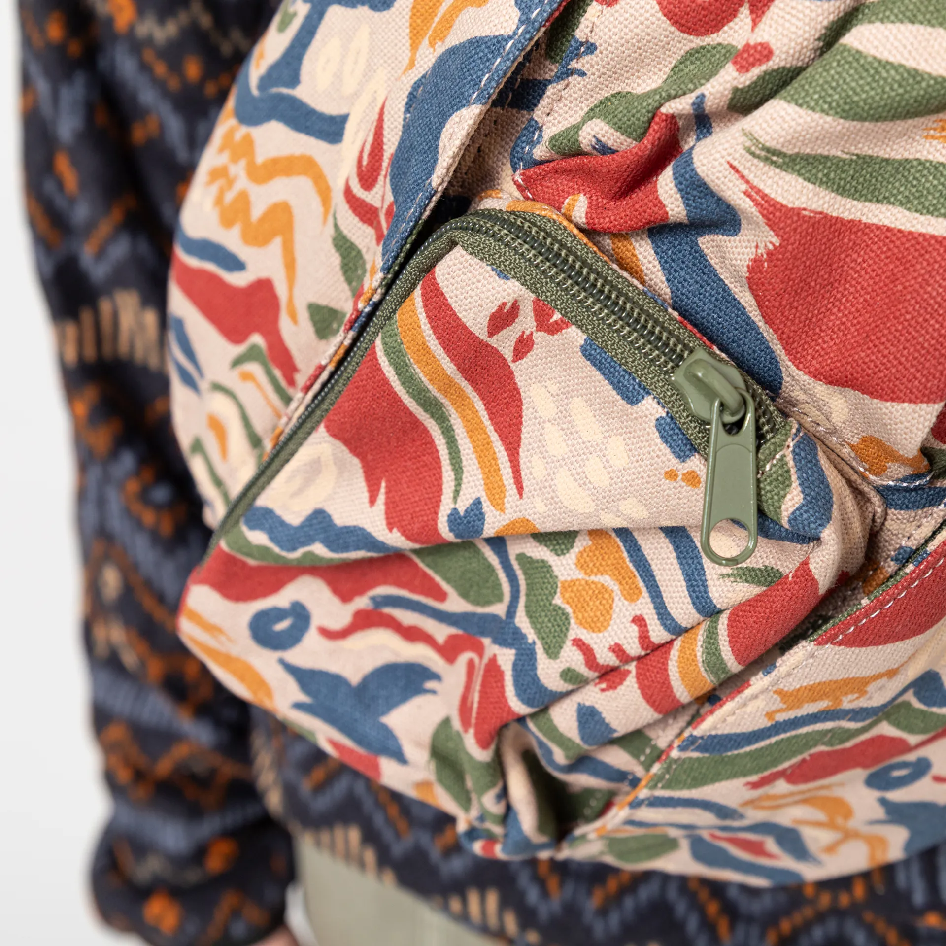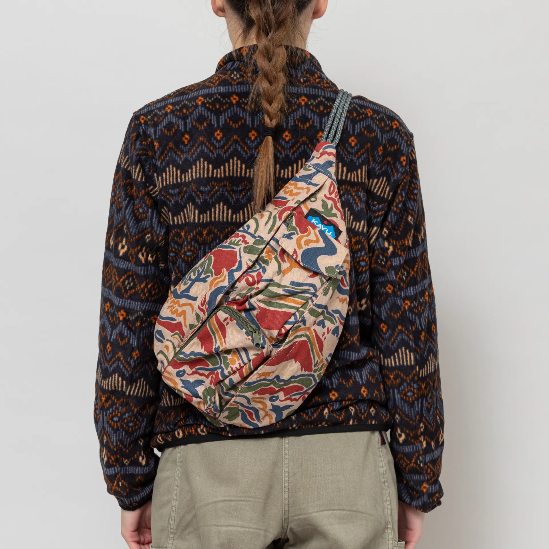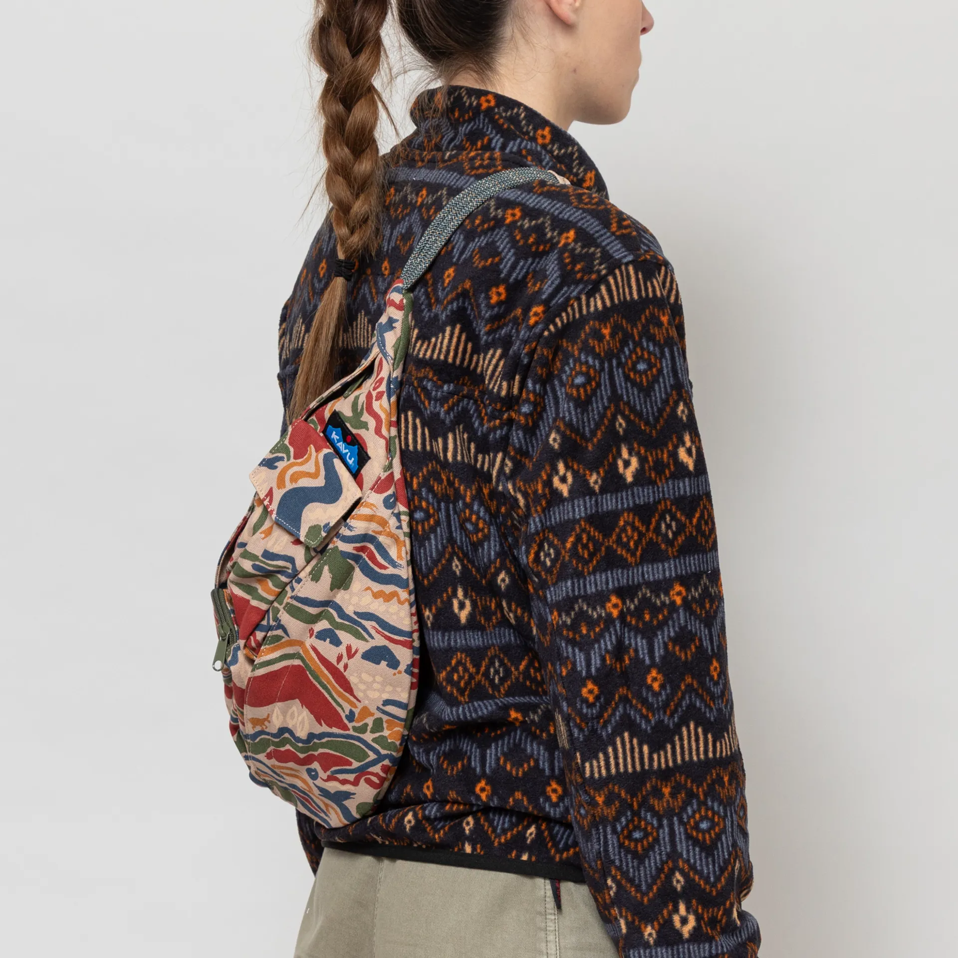 A shoulder sling from Kavu, made from a canvas outer with a nylon cloth lining, three zippered compartments and a Velcro pocket. It has a padded backboard and an adjustable strap.