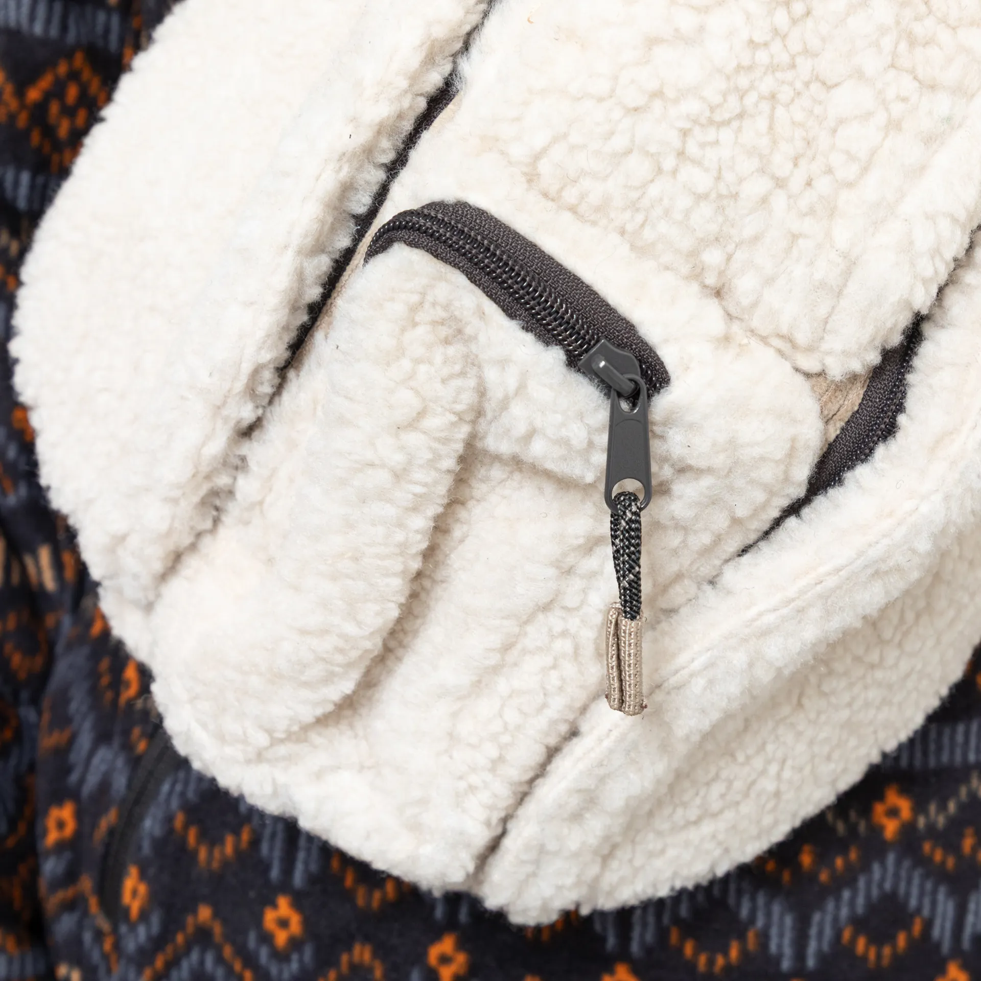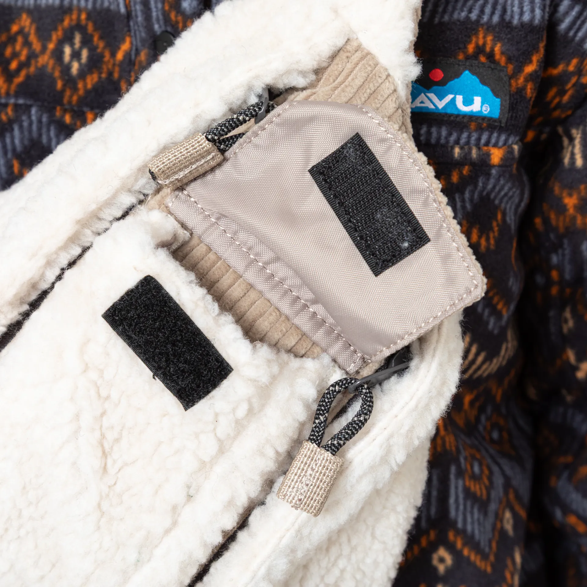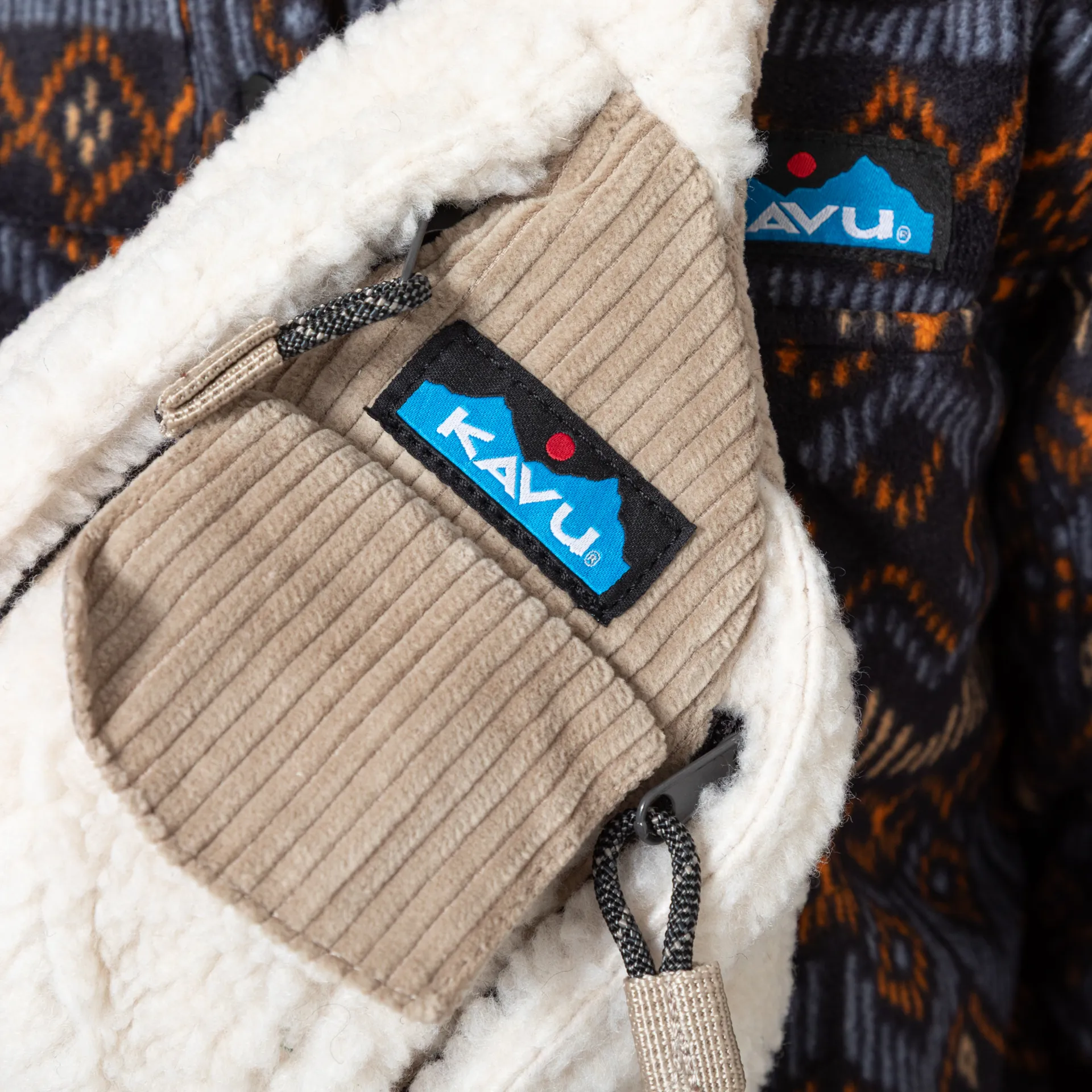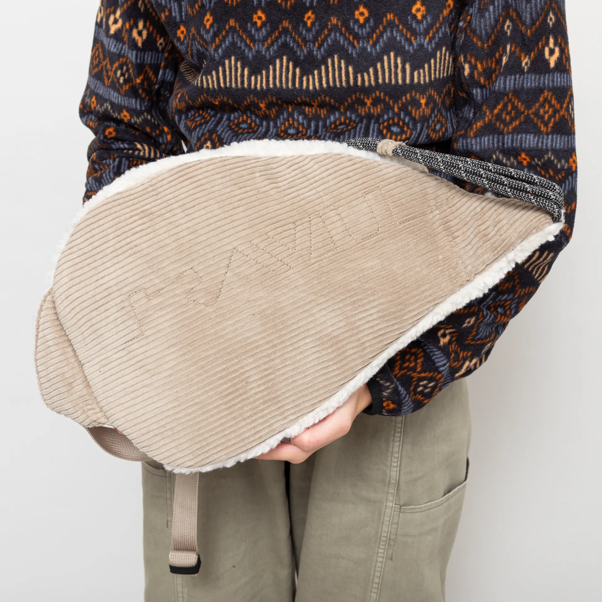 A bigger version of the mini rope bag from Kavu made from a soft and comfortable blend of corduroy, mainly on the back and within pockets, and sherpa fleece throughout the front.