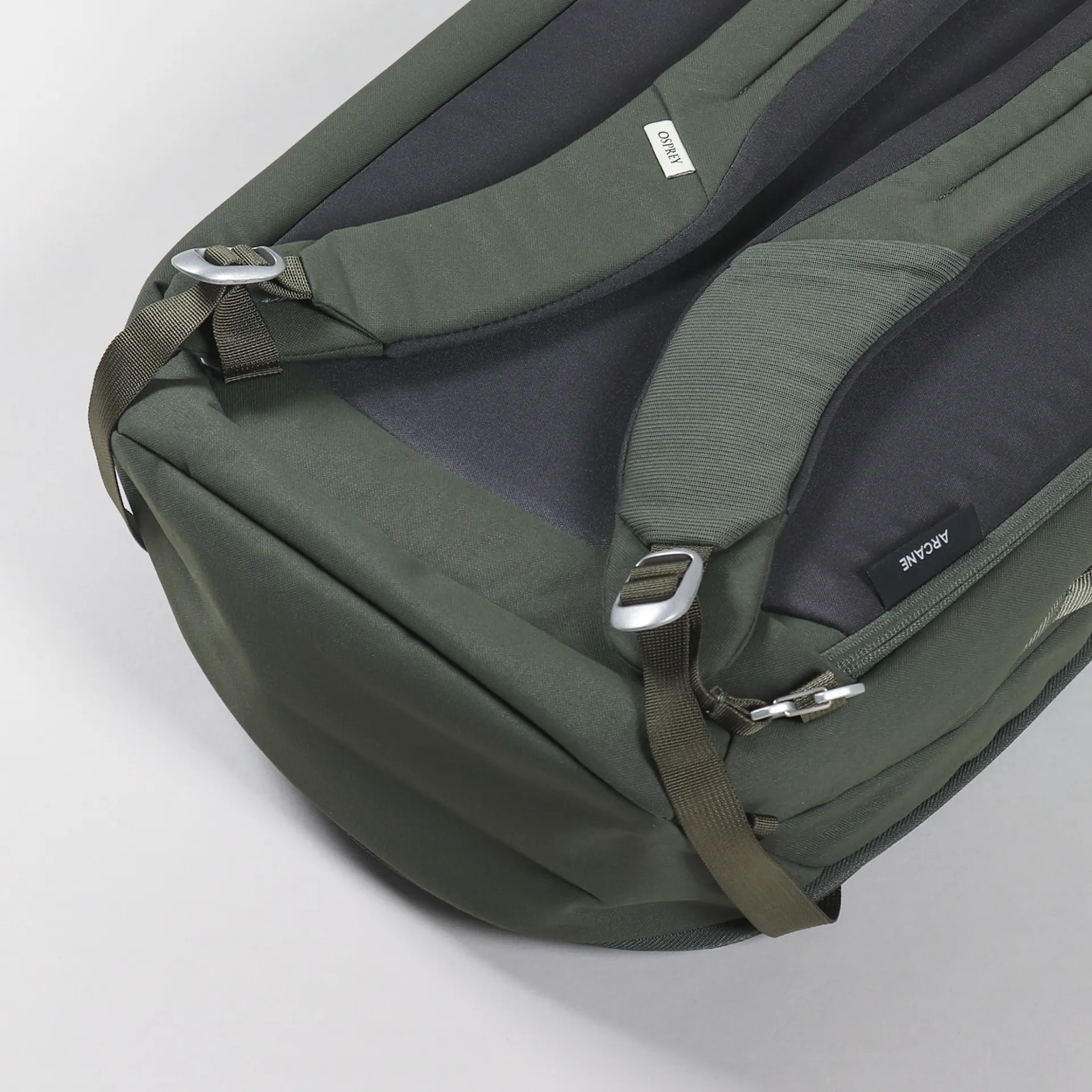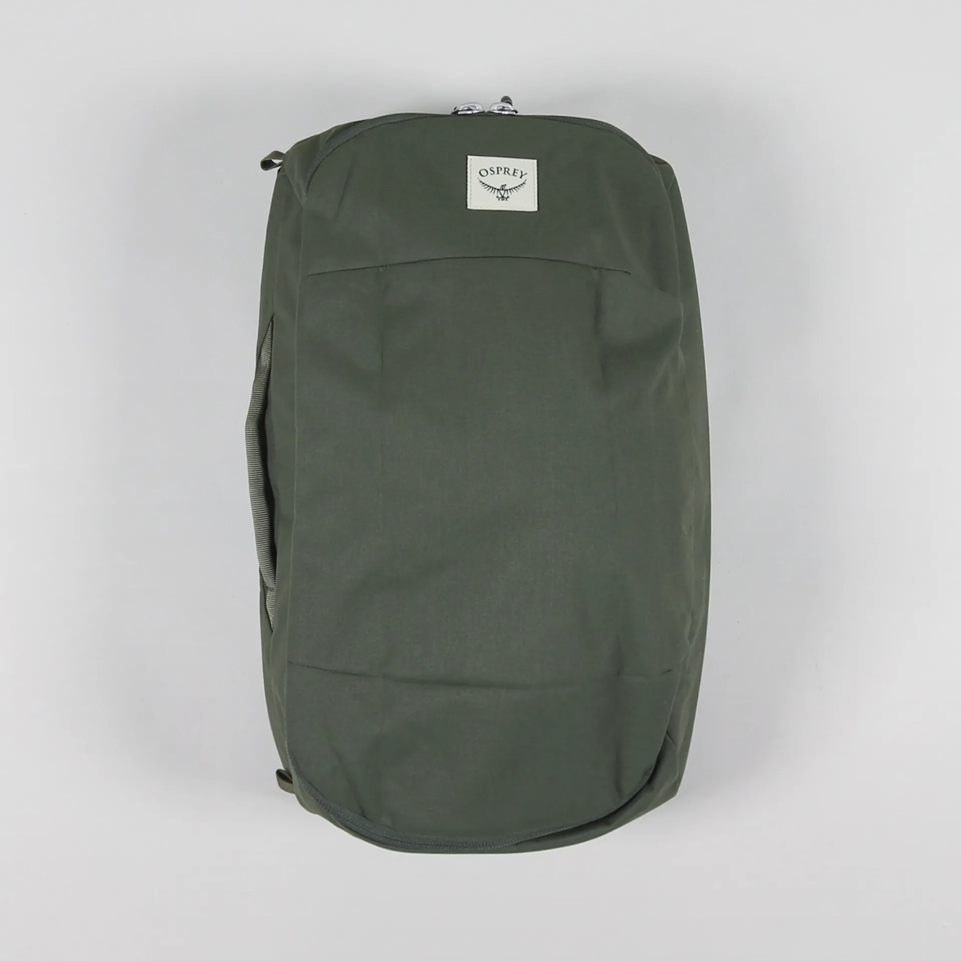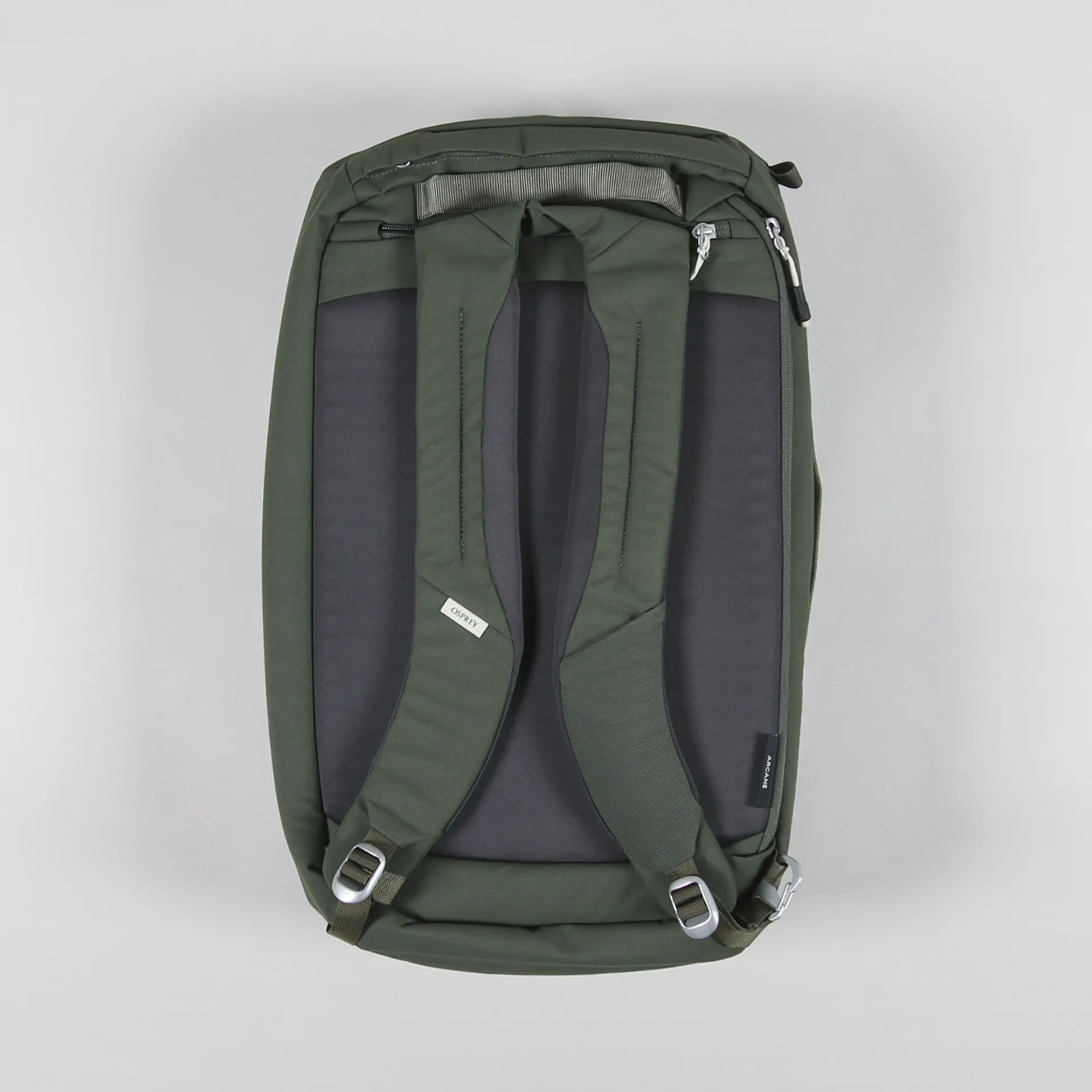 A duffel bag from Osprey made from a recycled nylon canvas shell which is lightweight and weather-resistant, with a 30L capacity including a zippered pouch, large side sleeve and a main compartment with zippered pockets.