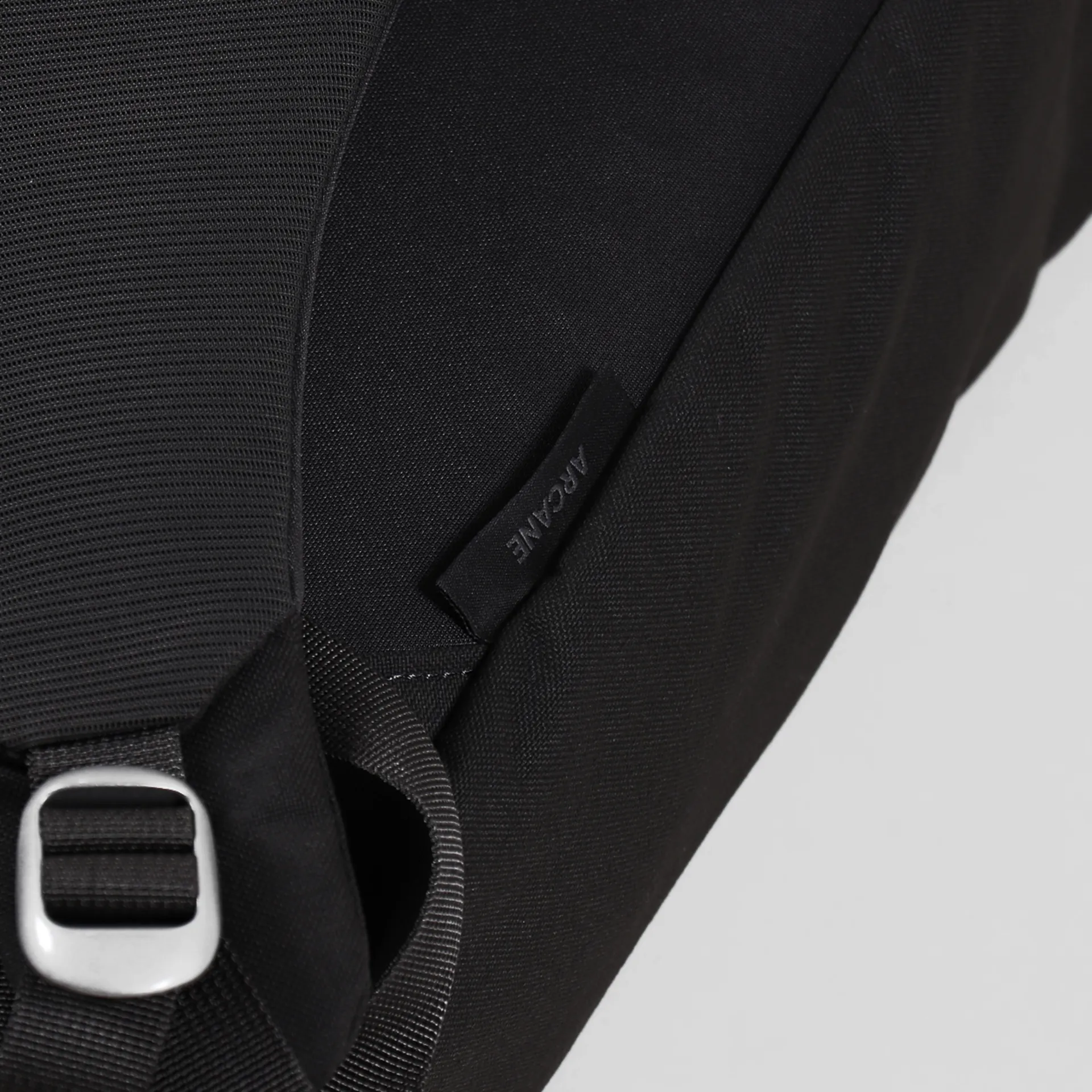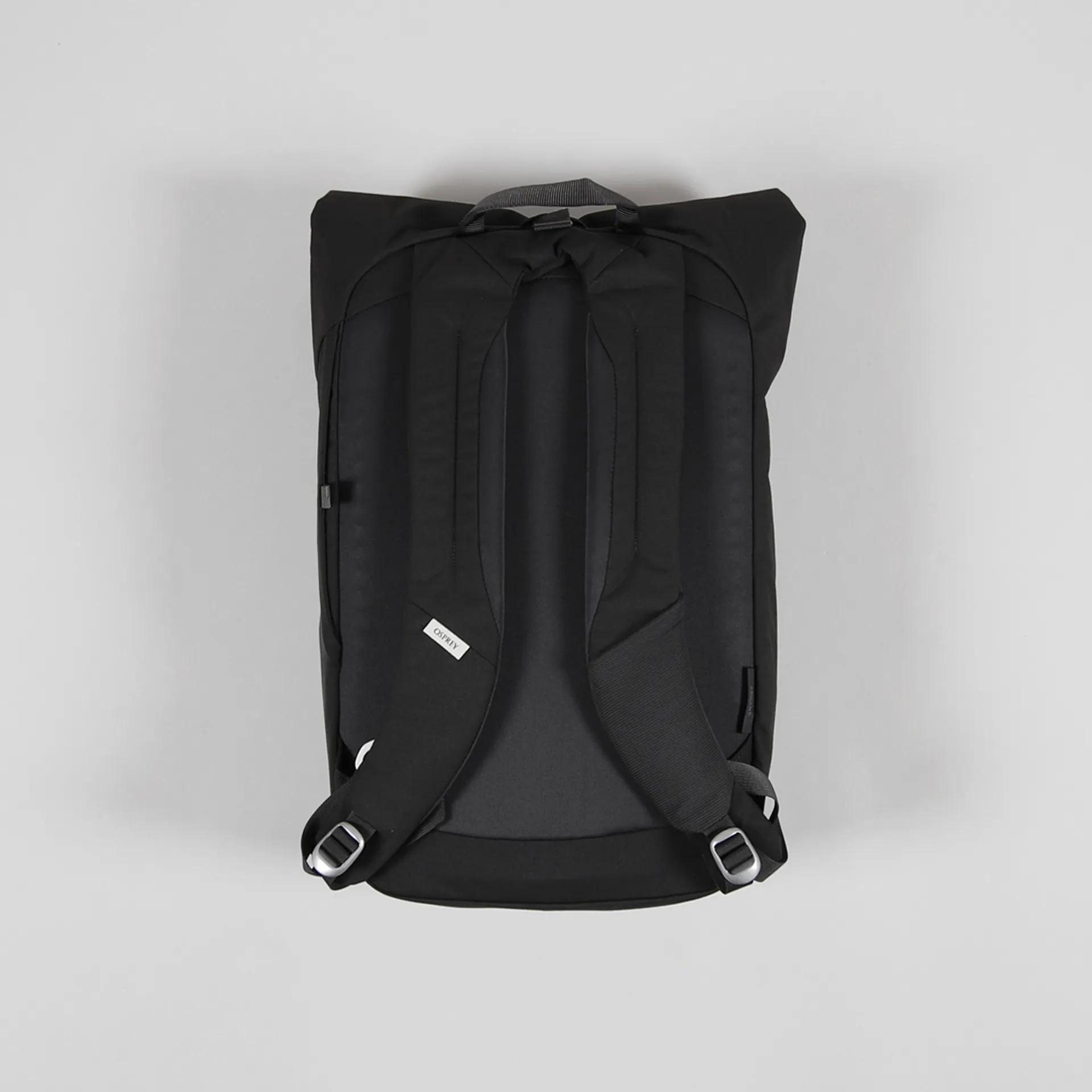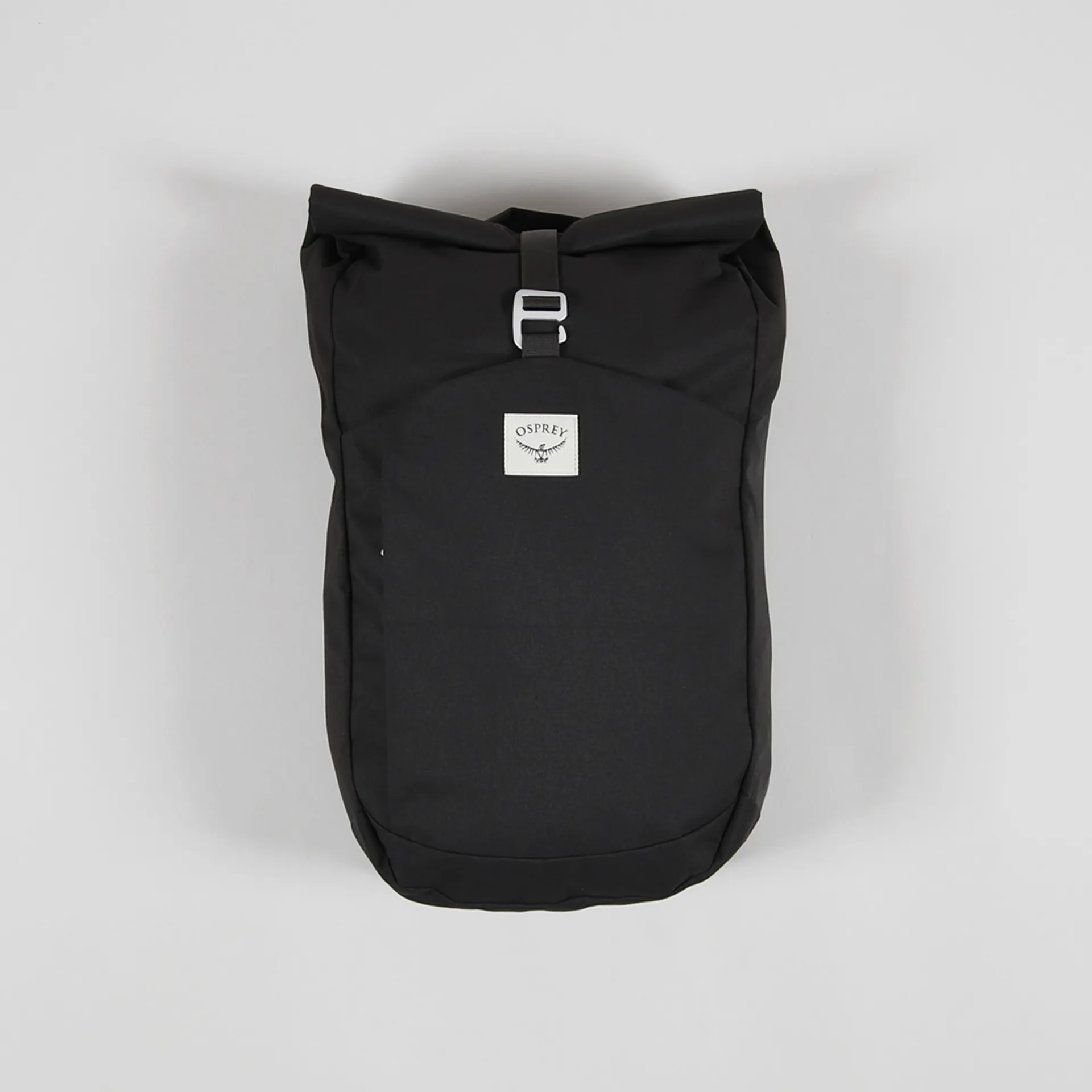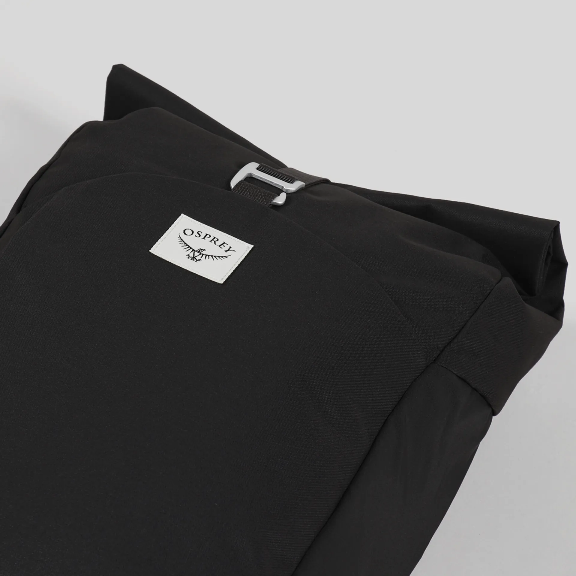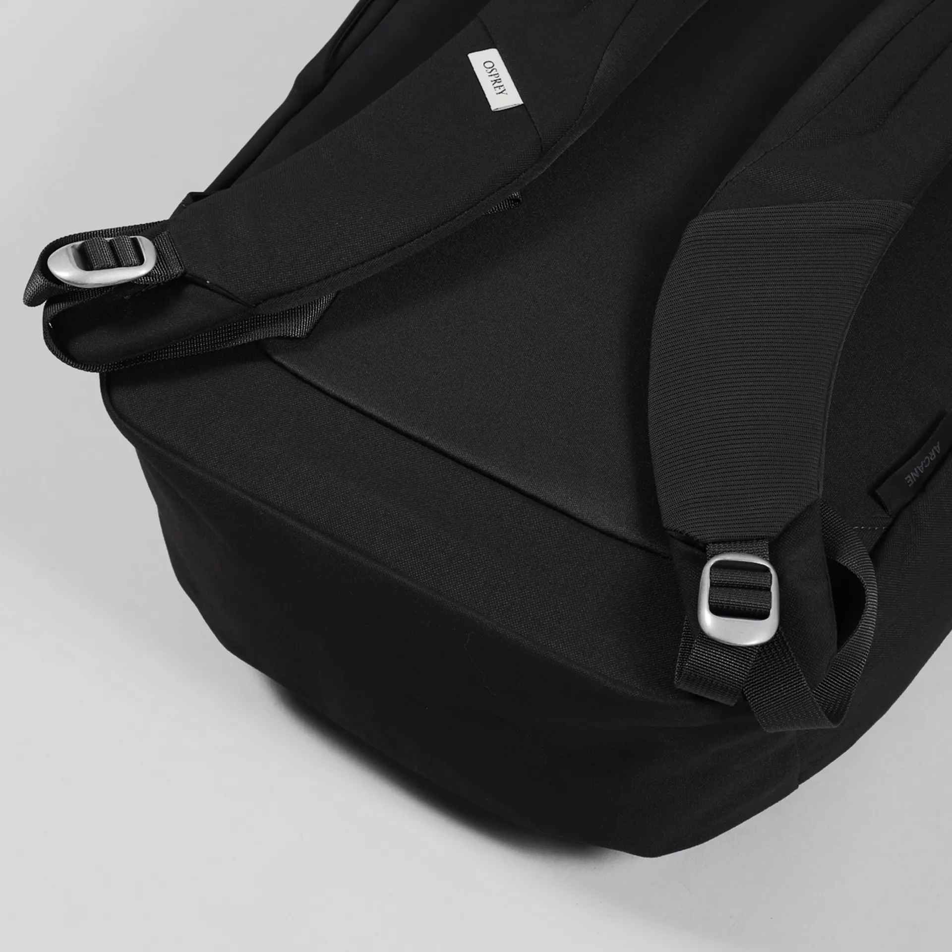 A rucksack from Osprey made from 100% recycled nylon with a durable canvas outer, cloth liner and an ergonomic fit with padded back and straps. It has a 22L capacity and a woven logo patch to the front.
