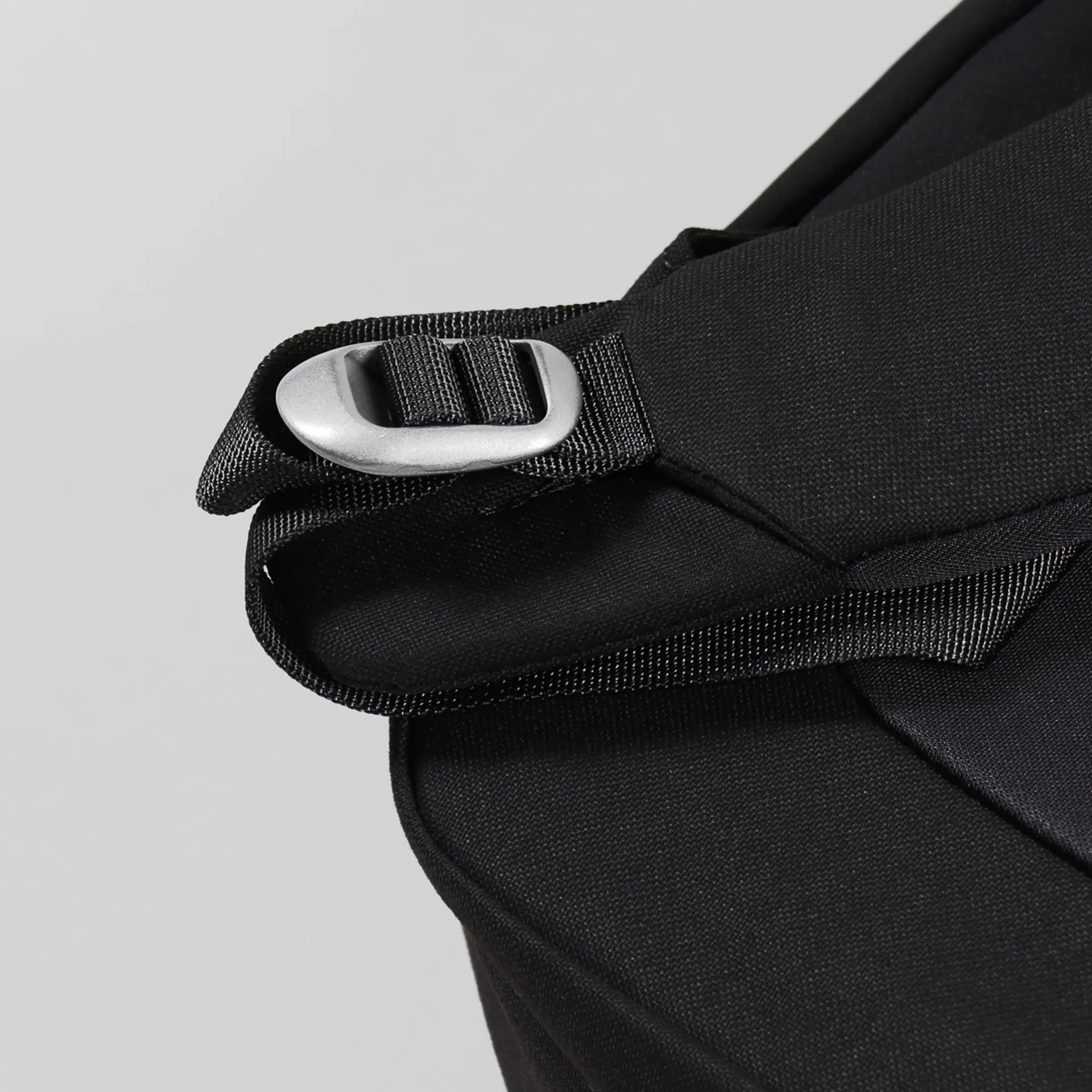 The bag has a zippered front pocket, a pouch which is clipped shut by the roll-top, and a large main compartment with a laptop sleeve and zippered pocket.