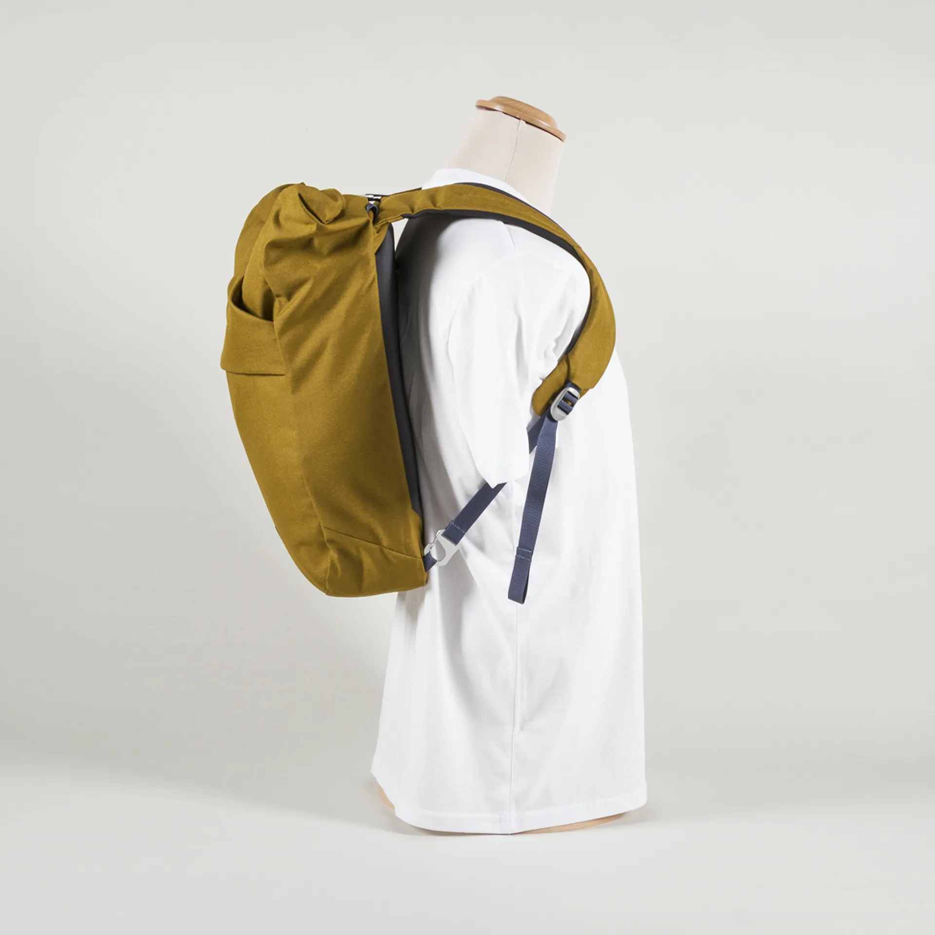 A rucksack from Osprey's Lifestyle collection, made from 100% recycled polyester with a durable canvas outer and cloth liner. The material is blue sign approved and treated with a PFC-free DWR (durable water-repellent) coating.