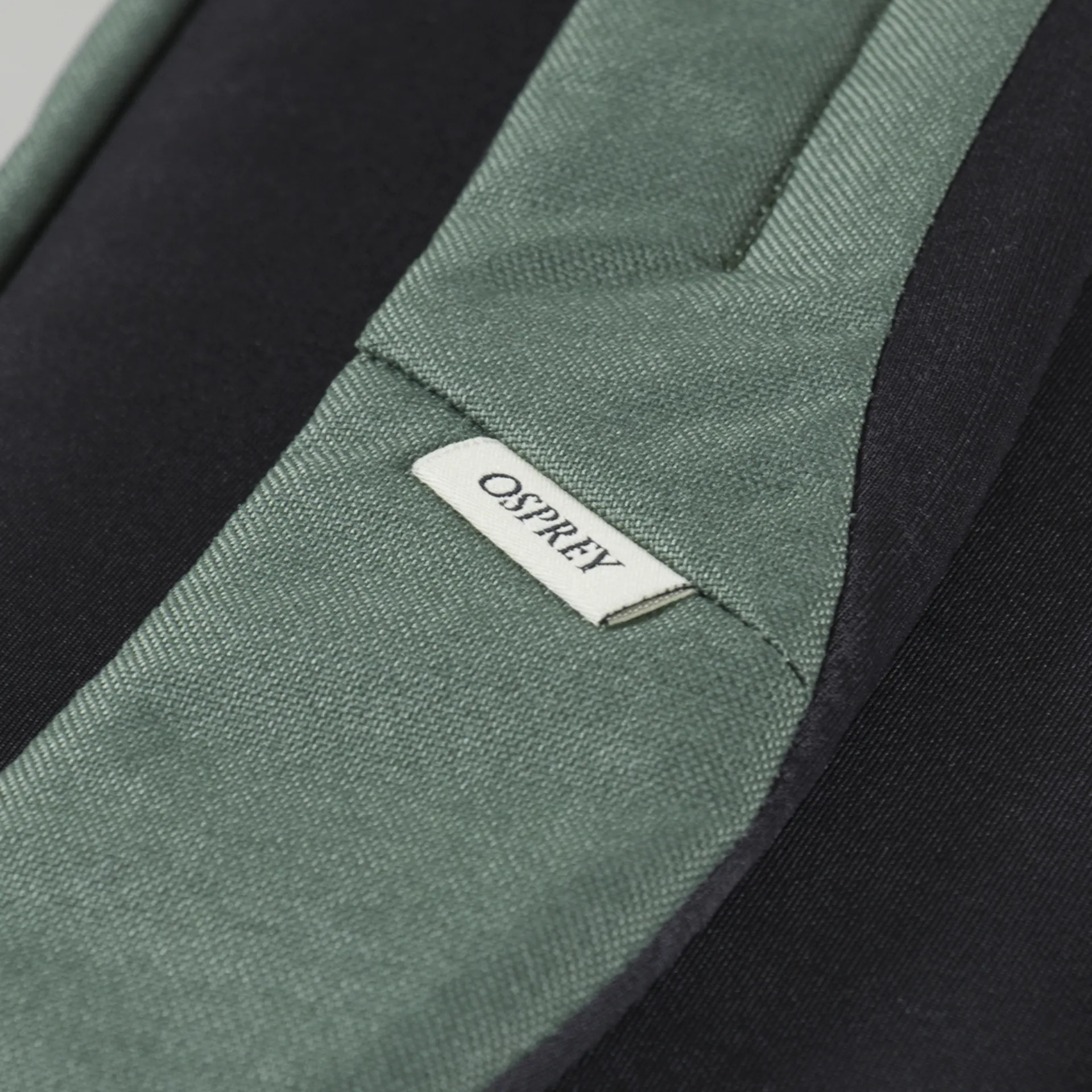 A rucksack from Osprey made from 100% recycled polyester with a durable canvas outer, cloth liner and a tote bag design featuring a woven logo patch.