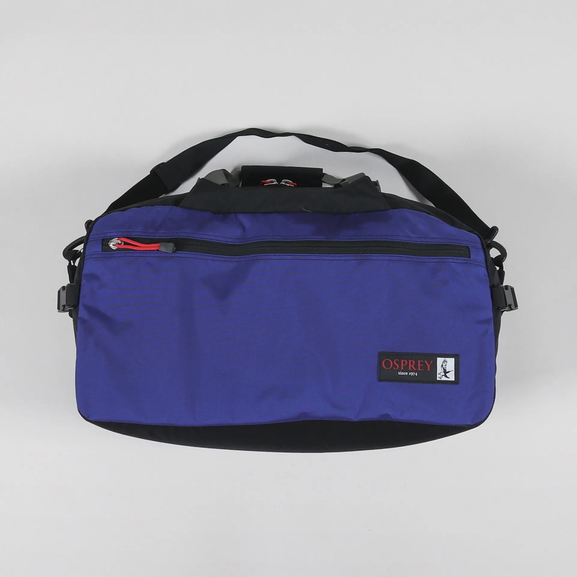 A bag from Osprey's Heritage collection, made from a durable and weather-resistant recycled nylon canvas with a DWR treatment, an adjustable strap and a padded base. It has two zippered compartments, one main and one side, with 45L capacity.