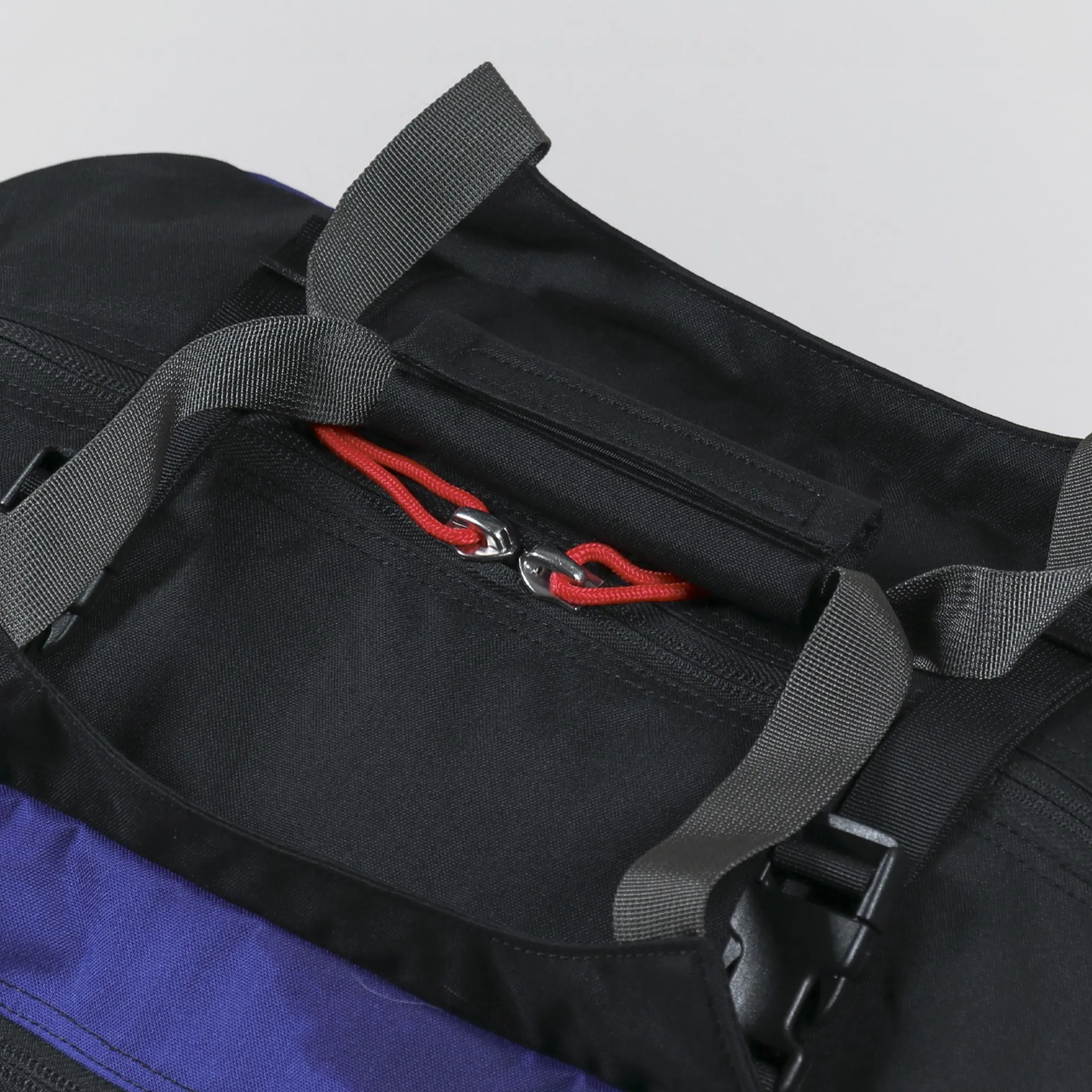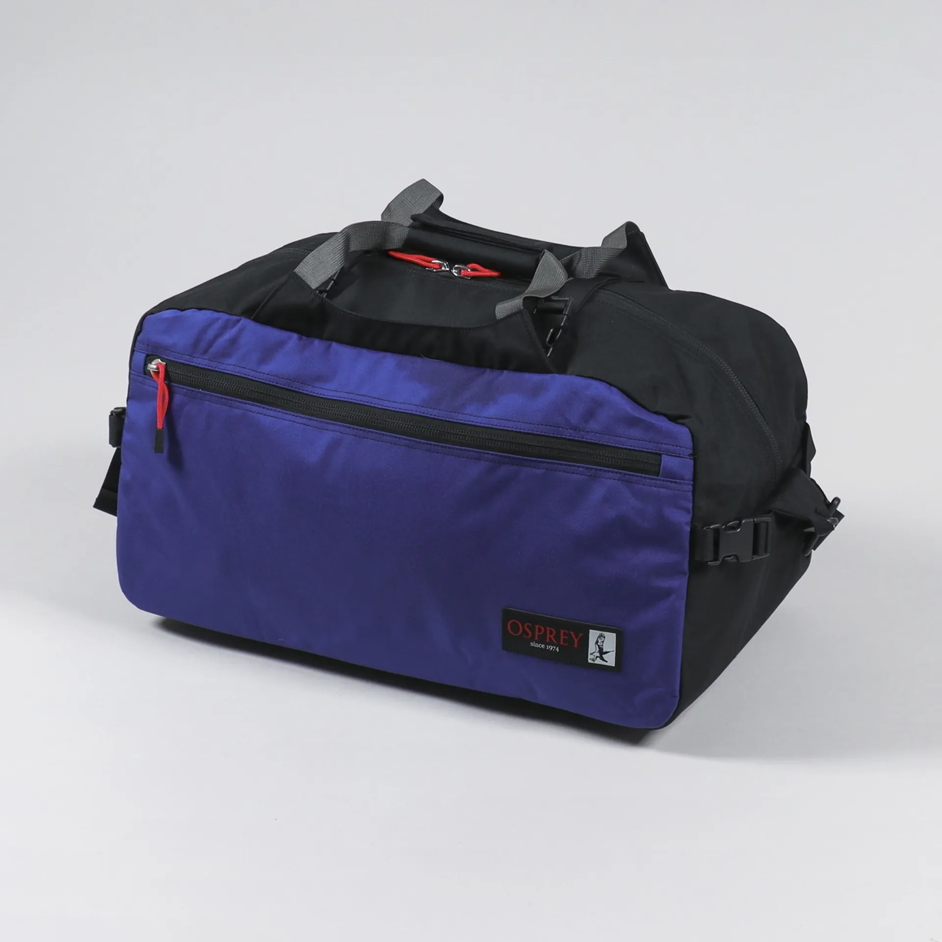 A hold-all bag from Osprey's Heritage collection, made from a durable and weather-resistant recycled nylon canvas with a DWR treatment, an adjustable strap and a padded base. It has two zippered compartments, one main and one side, with a 45L capacity.