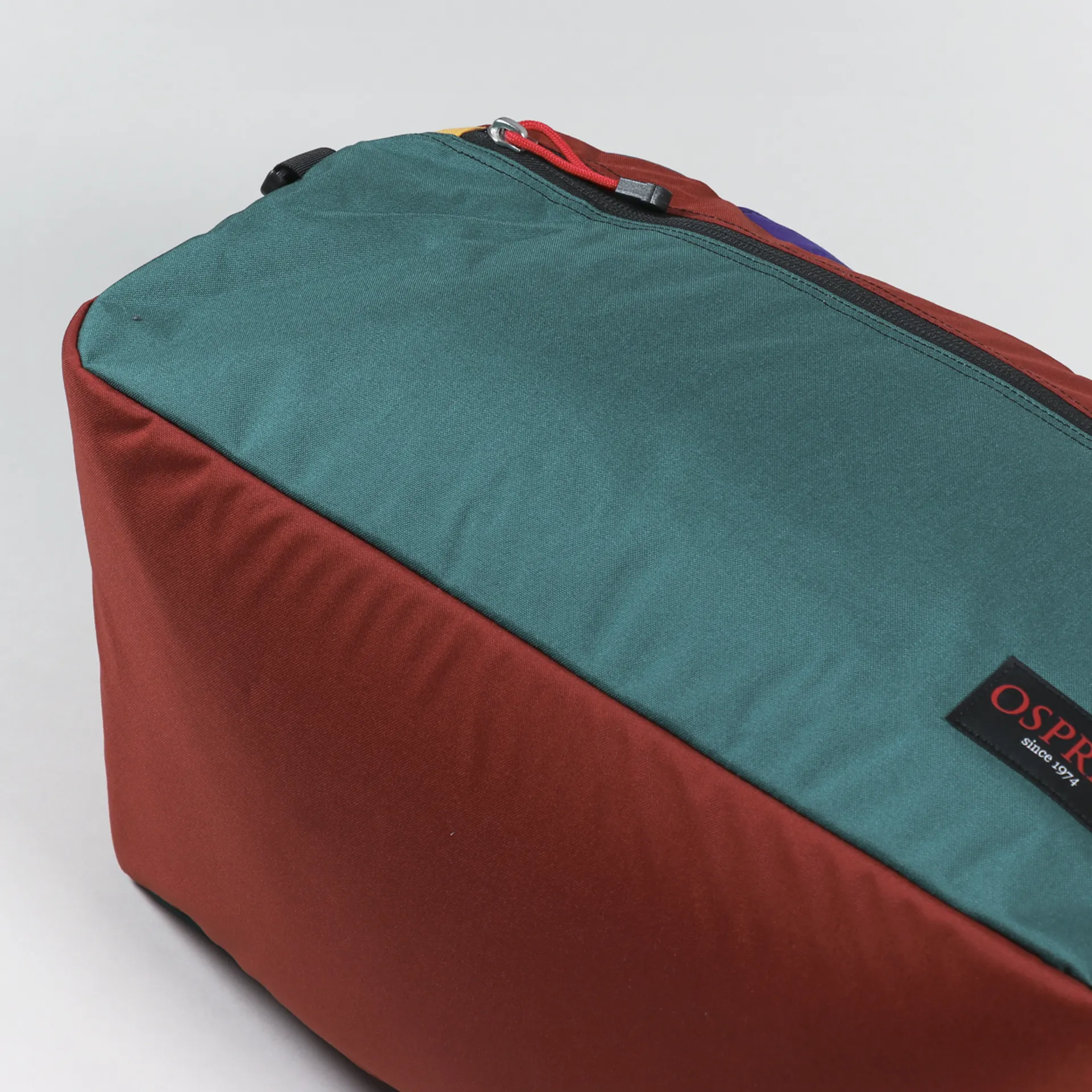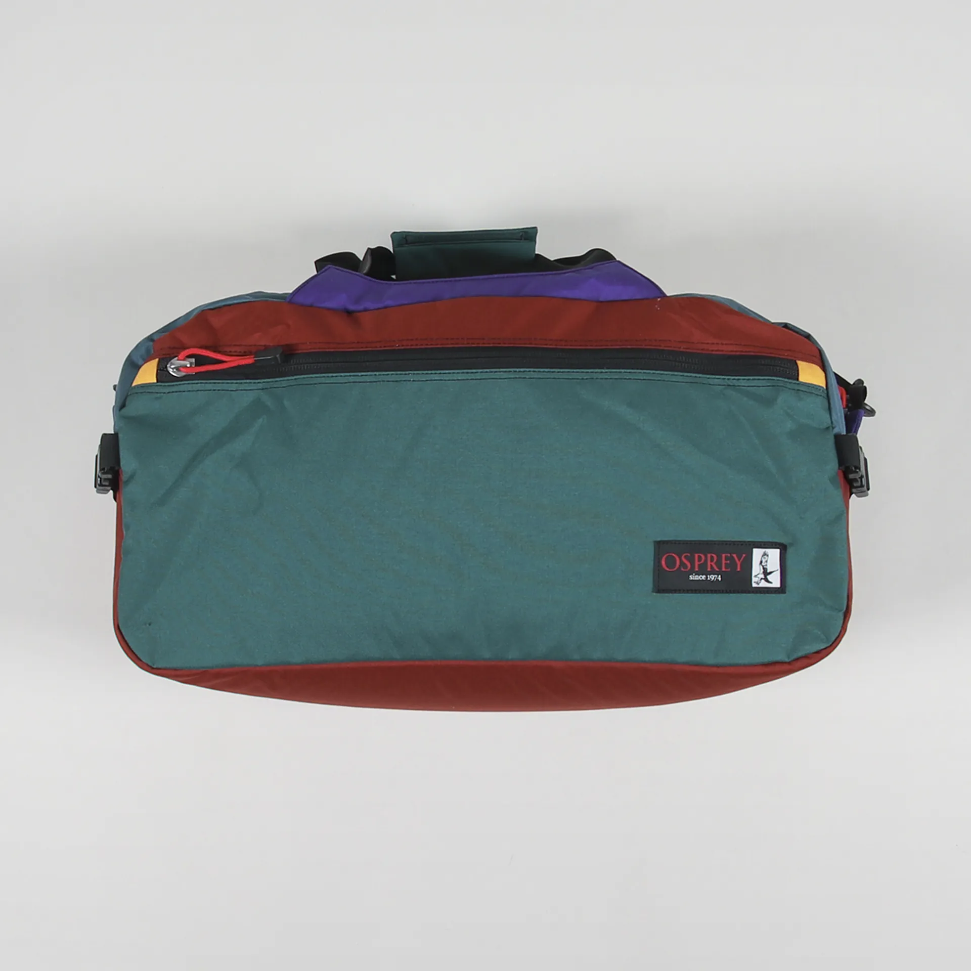 A bag from Osprey's Heritage collection, made from a durable and weather-resistant recycled nylon canvas with a DWR treatment, an adjustable strap and a padded base. It has two zippered compartments, one main and one side, with 45L capacity.