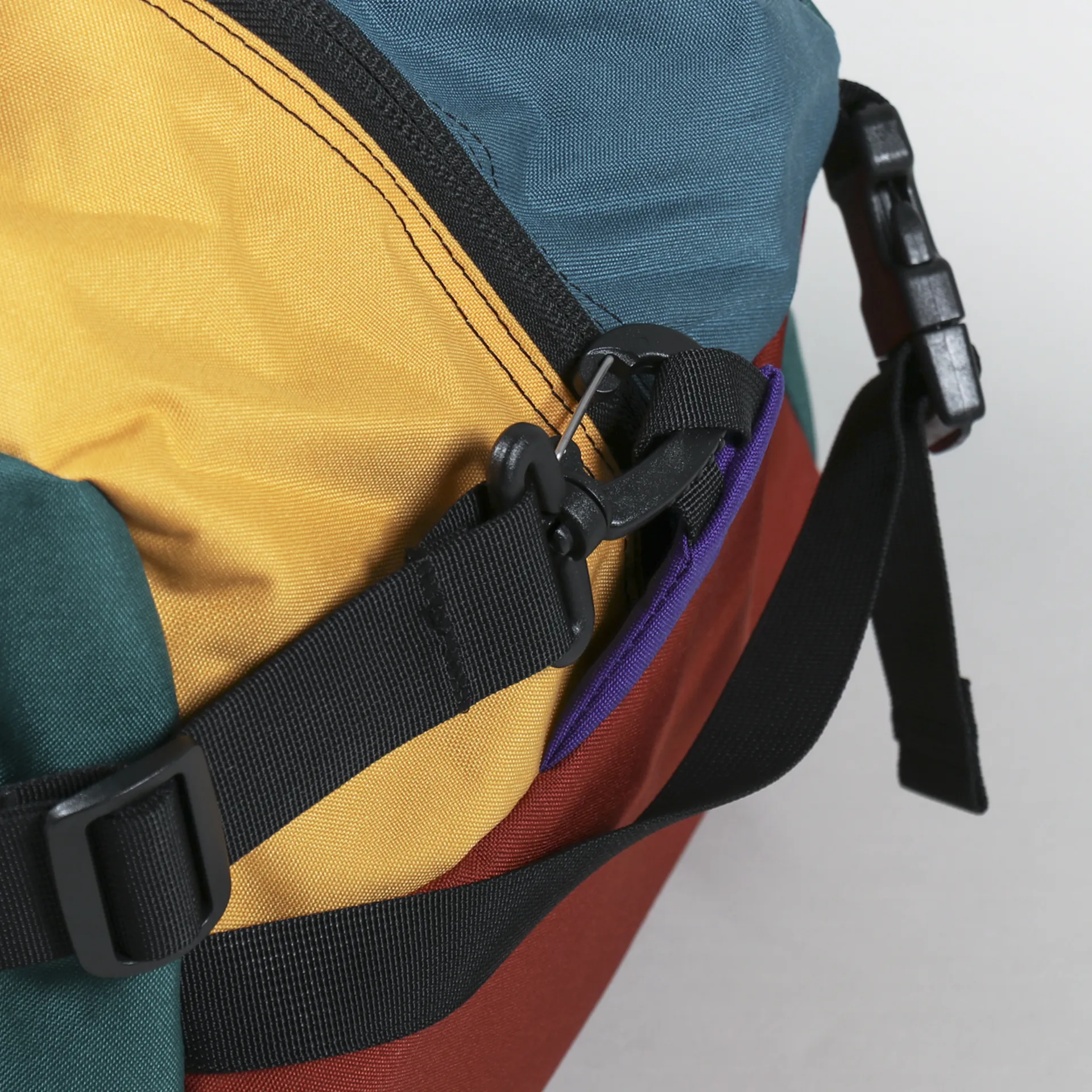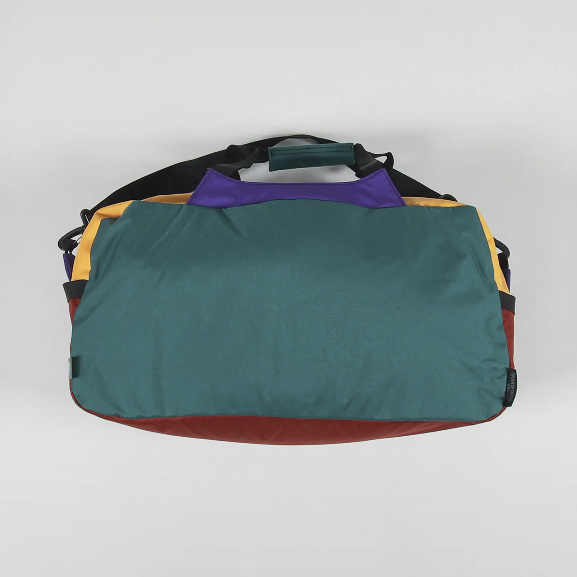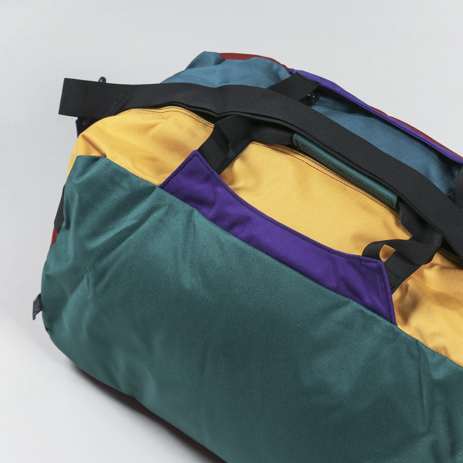 A hold-all bag from Osprey's Heritage collection, made from a durable and weather-resistant recycled nylon canvas with a DWR treatment, an adjustable strap and a padded base. It has two zippered compartments, one main and one side, with 45L capacity.