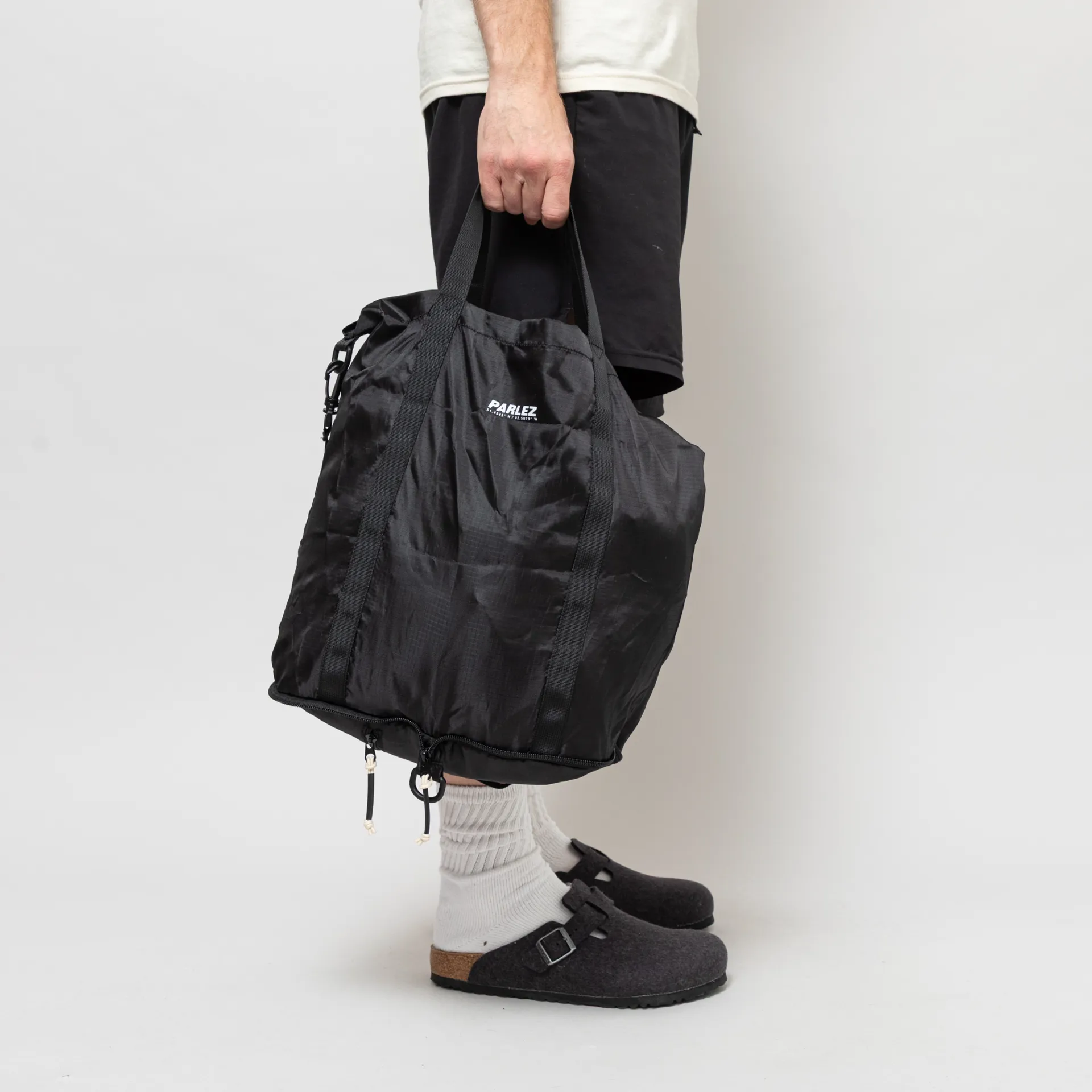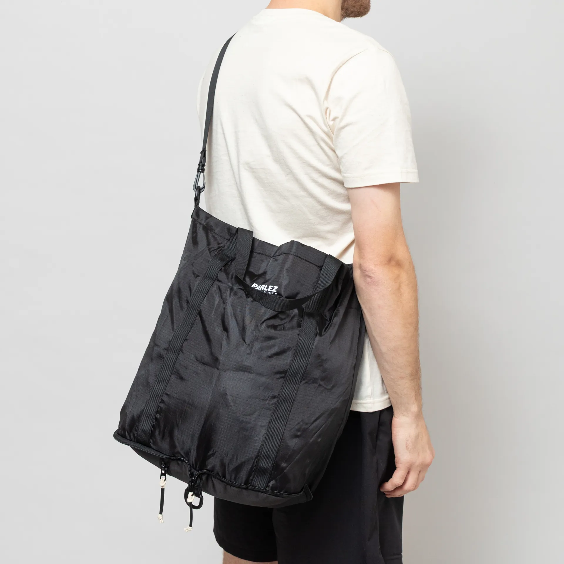 A convertible sling bag from Parlez that folds out into a large tote bag. Constructed from durable 100% recycled nylon ripstop, with an adjustable webbed strap, printed logos and branded zip pulls.