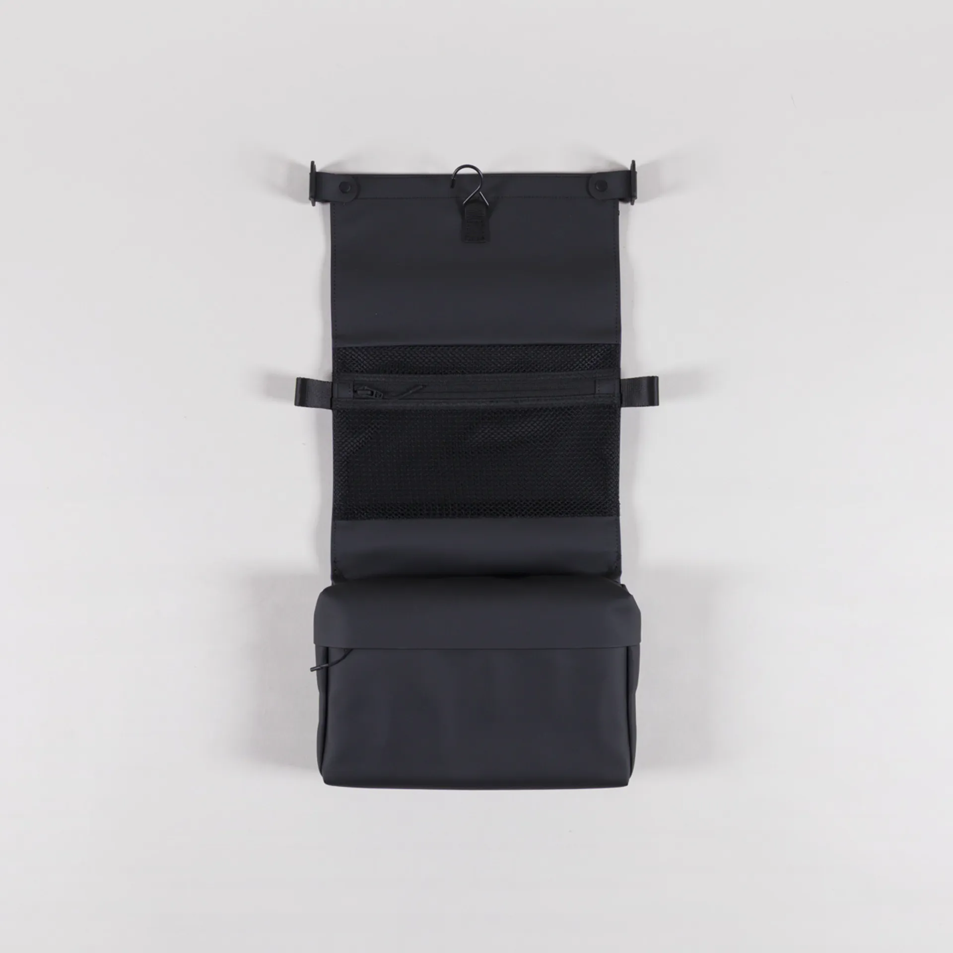 A wash bag from Rains, constructed from waterproof and durable PU fabric in a trifold design with a hook for easy hanging when unfolded.