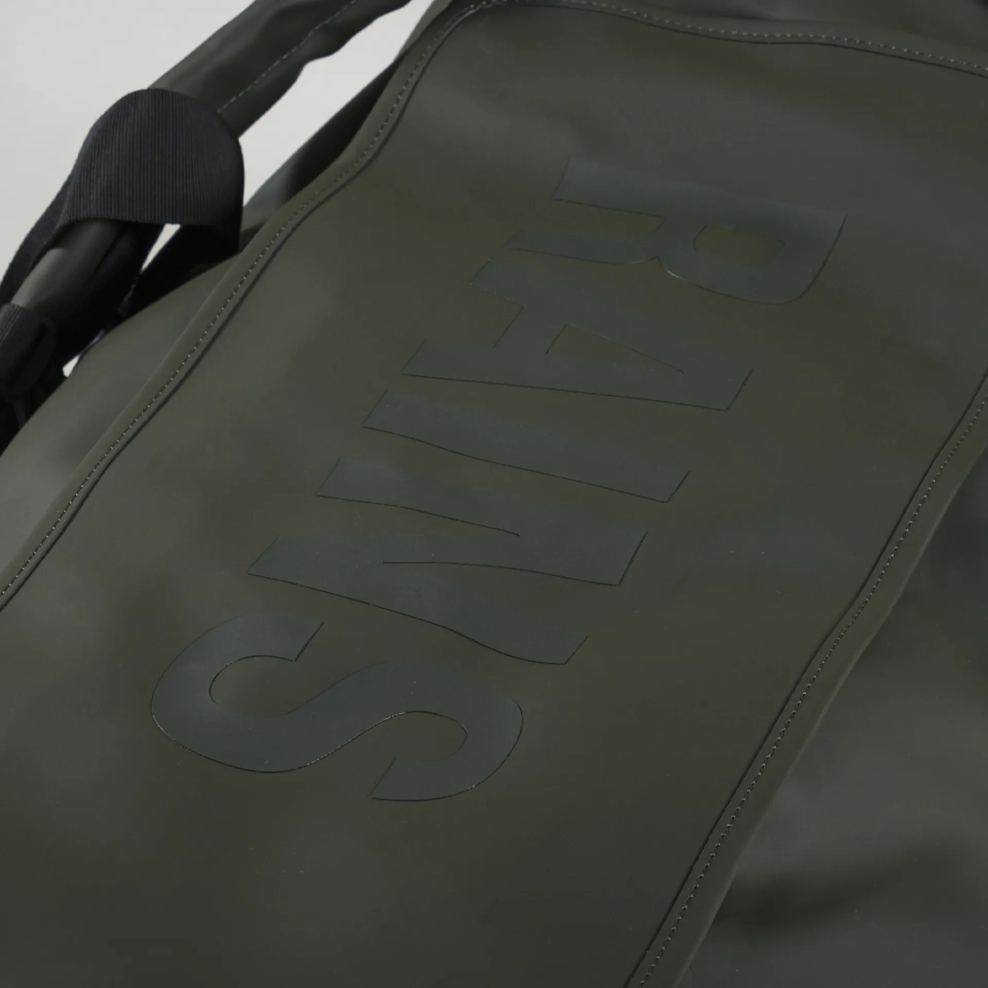 A large duffel bag from Copenhagen's Rains, made from a durable waterproof polyester with a PU coating for further protection. It has a 56L capacity consisting of a small zippered pocket to the side and a massive main compartment.