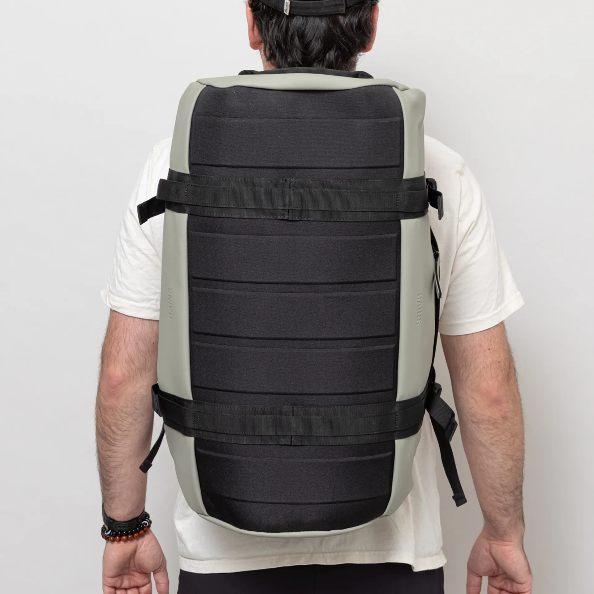 A waterproof duffel bag from Rains made from a blend of polyester and PU with a 34L capacity with a main compartment and a zippered side pouch.