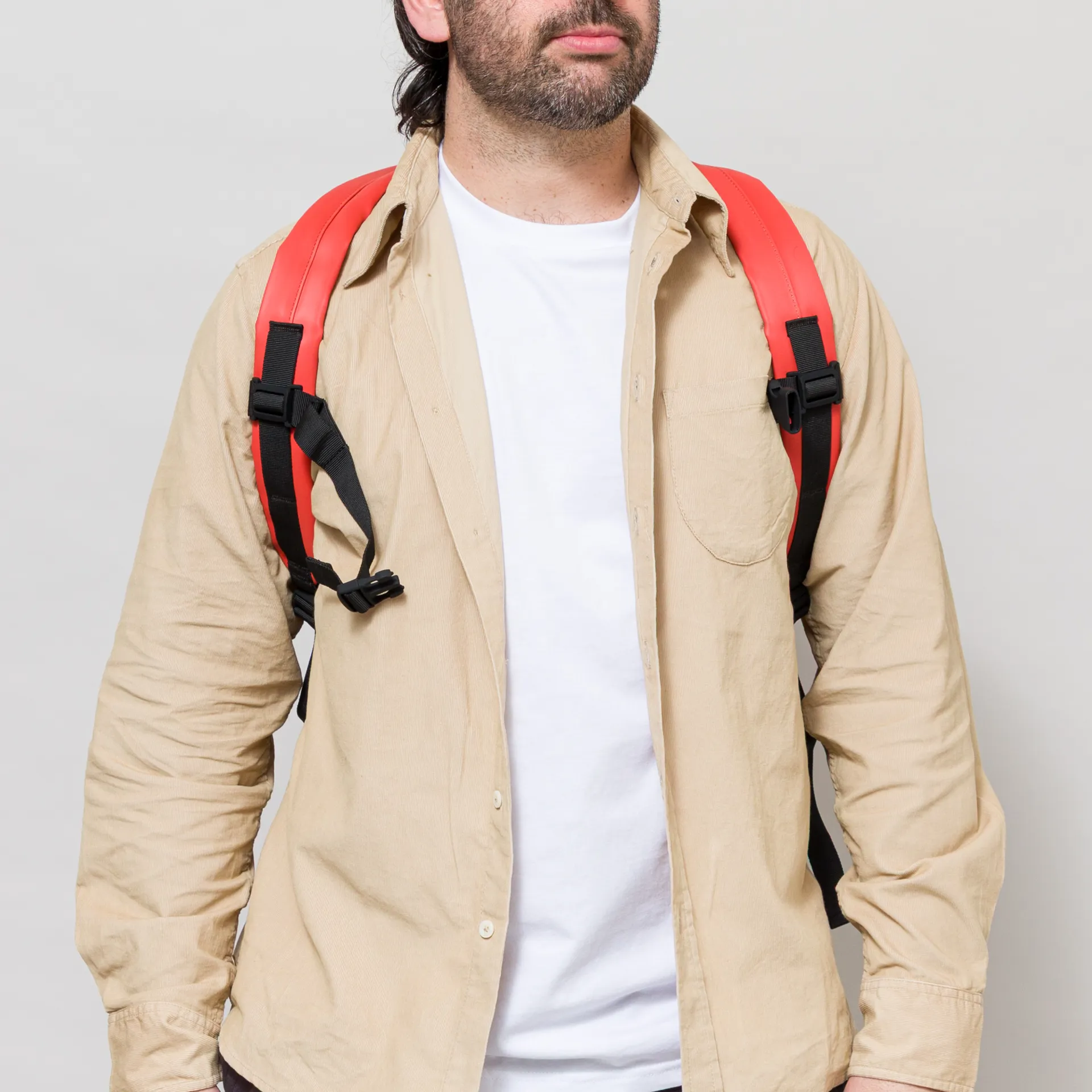 It has a padded backboard/bottom, handles over the top and padded/adjustable straps. It has debossed branding to the top and side.