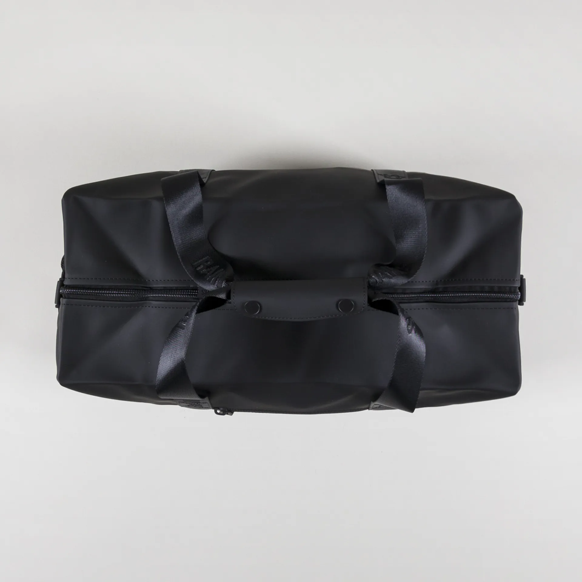 A duffel bag from Rains, made from a waterproof polyester with a smooth PU coating for added resistance. It has a zippered side pocket and a large main compartment, alongside a mesh pouch. It has handles to the top with jacquard branding to the woven tape and a removable shoulder strap.