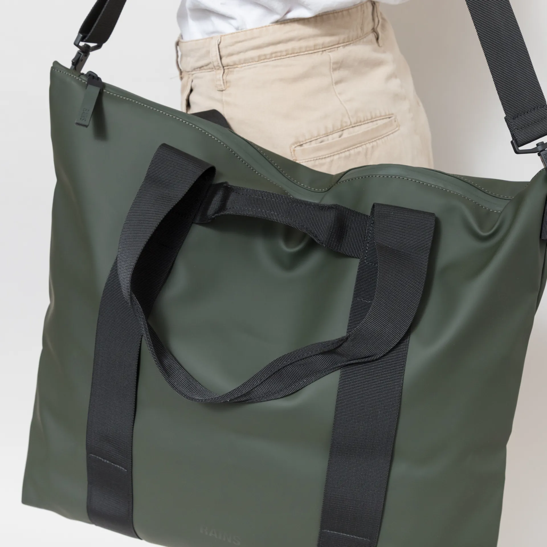 The Tote Bag from Rains is crafted from fully waterproof 100% polyester with a polyurethane coating and laminated zips for extra protection. I