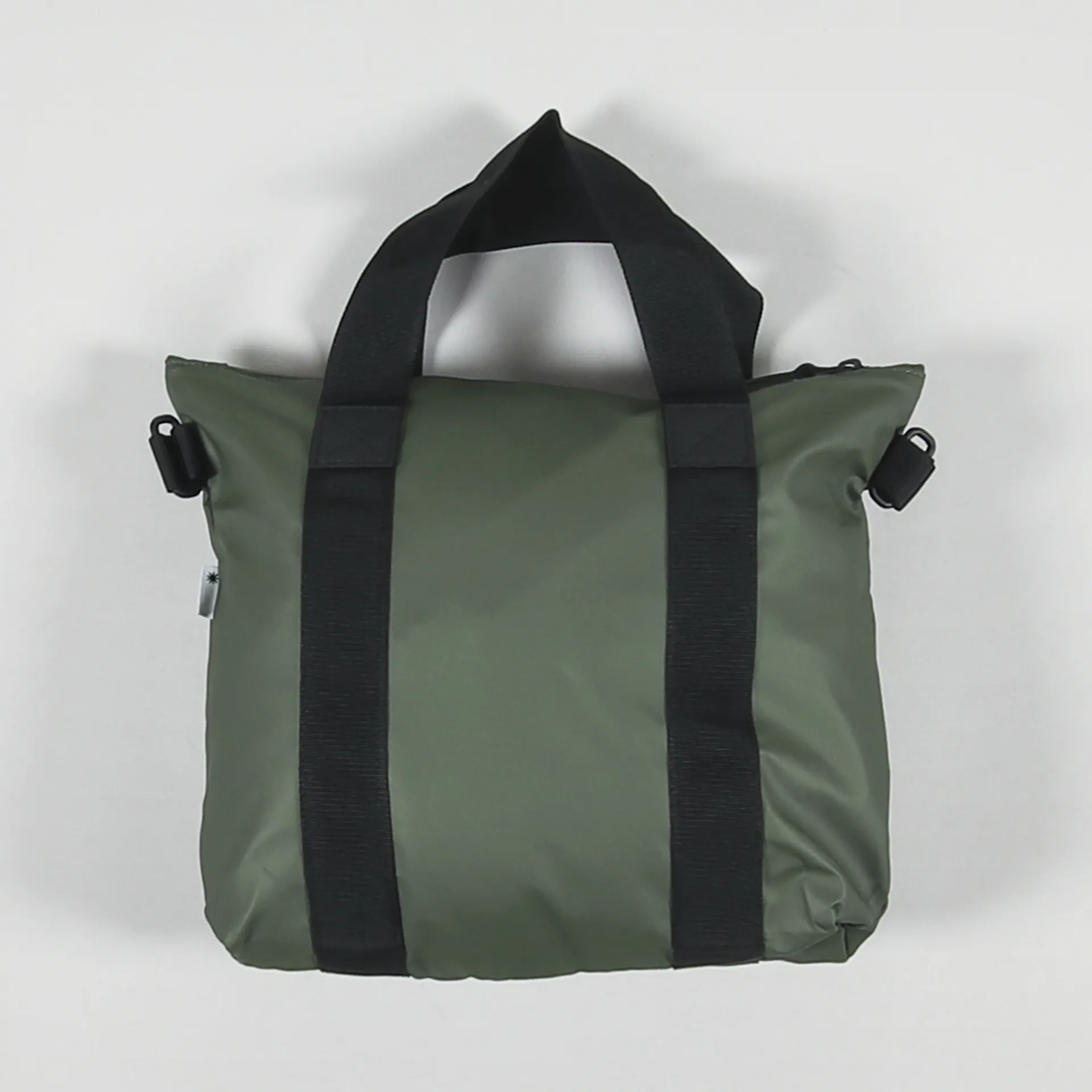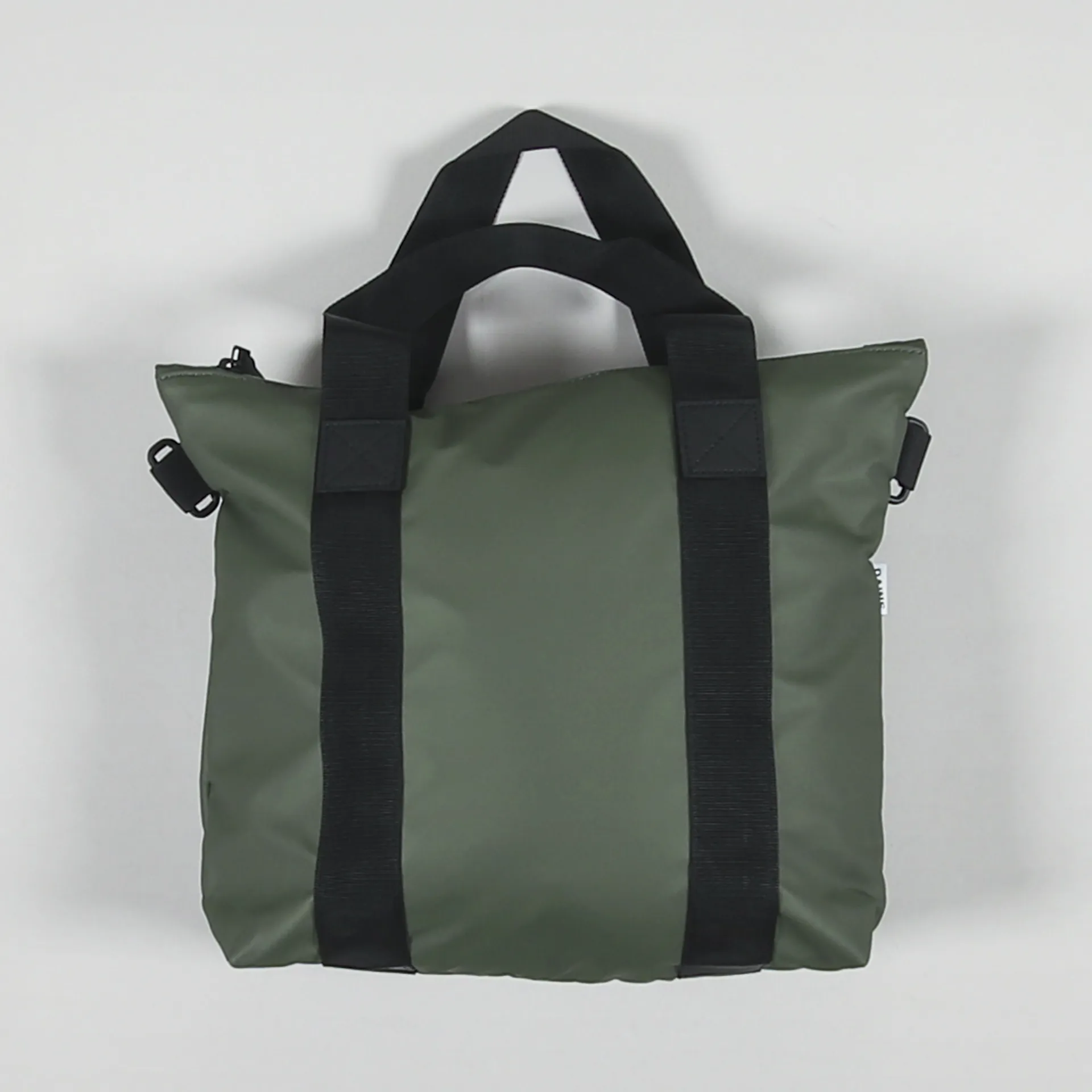 A small tote bag from Rains made from a completely waterproof 100% polyester with a polyurethane-coated shell and a canvas inner. It has a zippered top and handles, along with a removable shoulder strap.