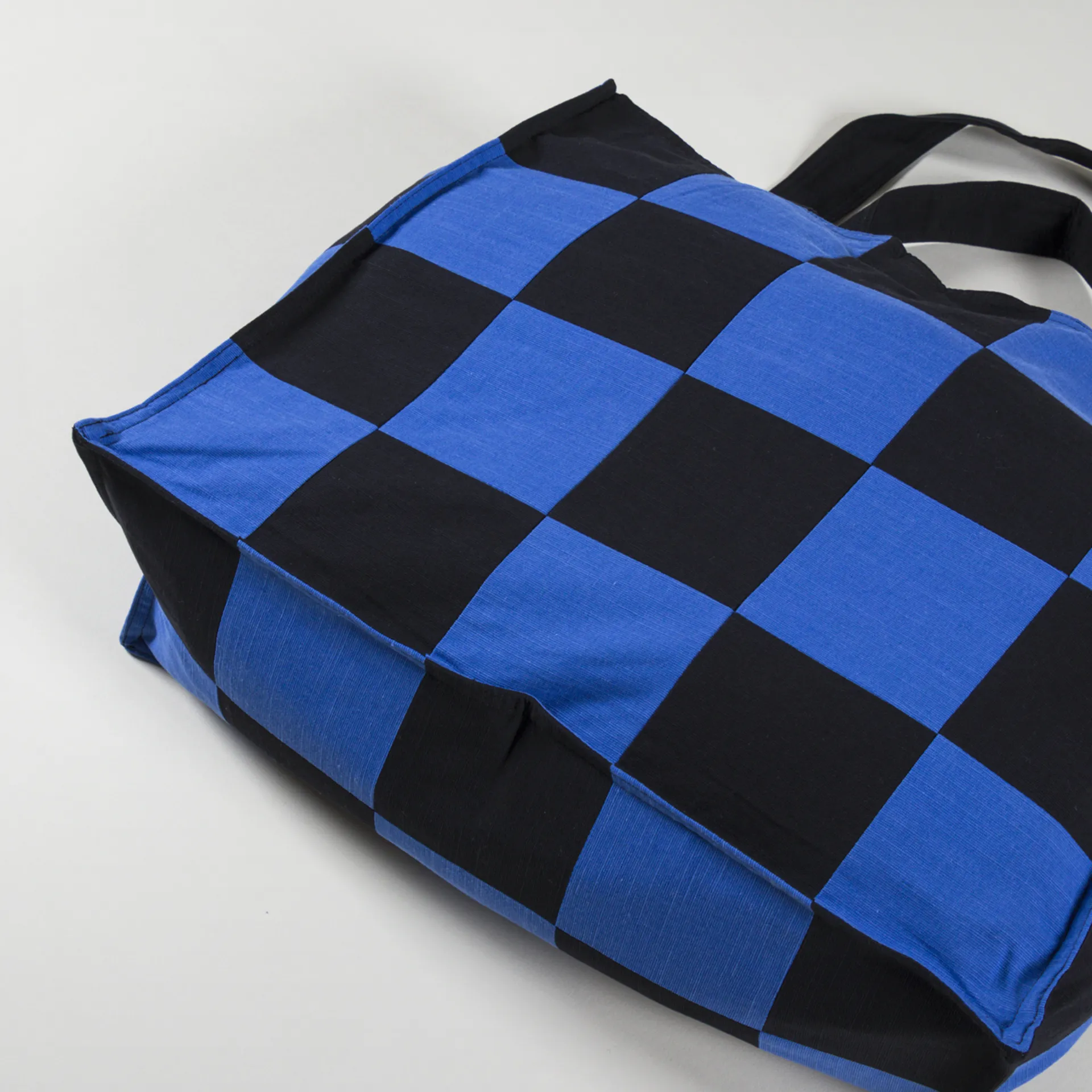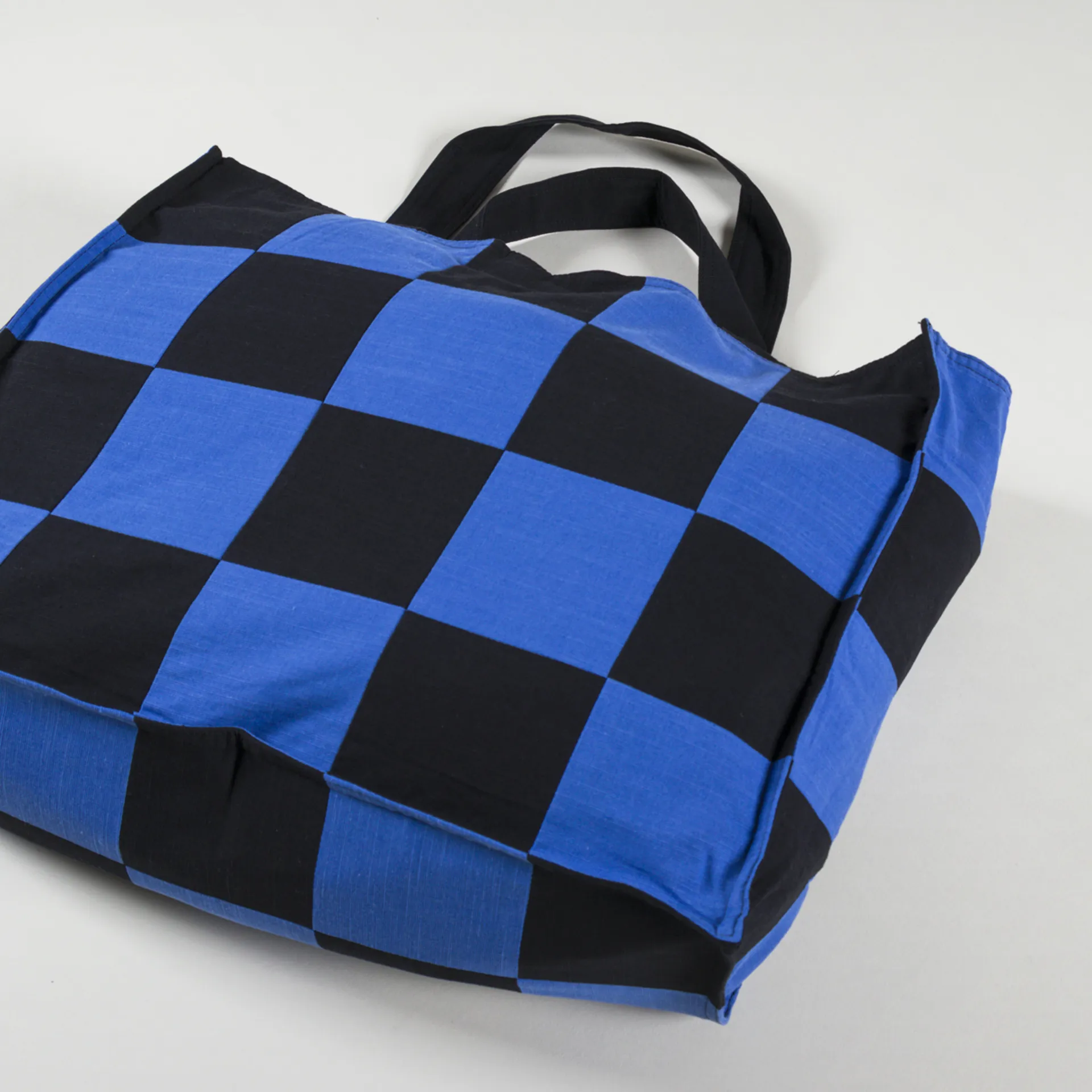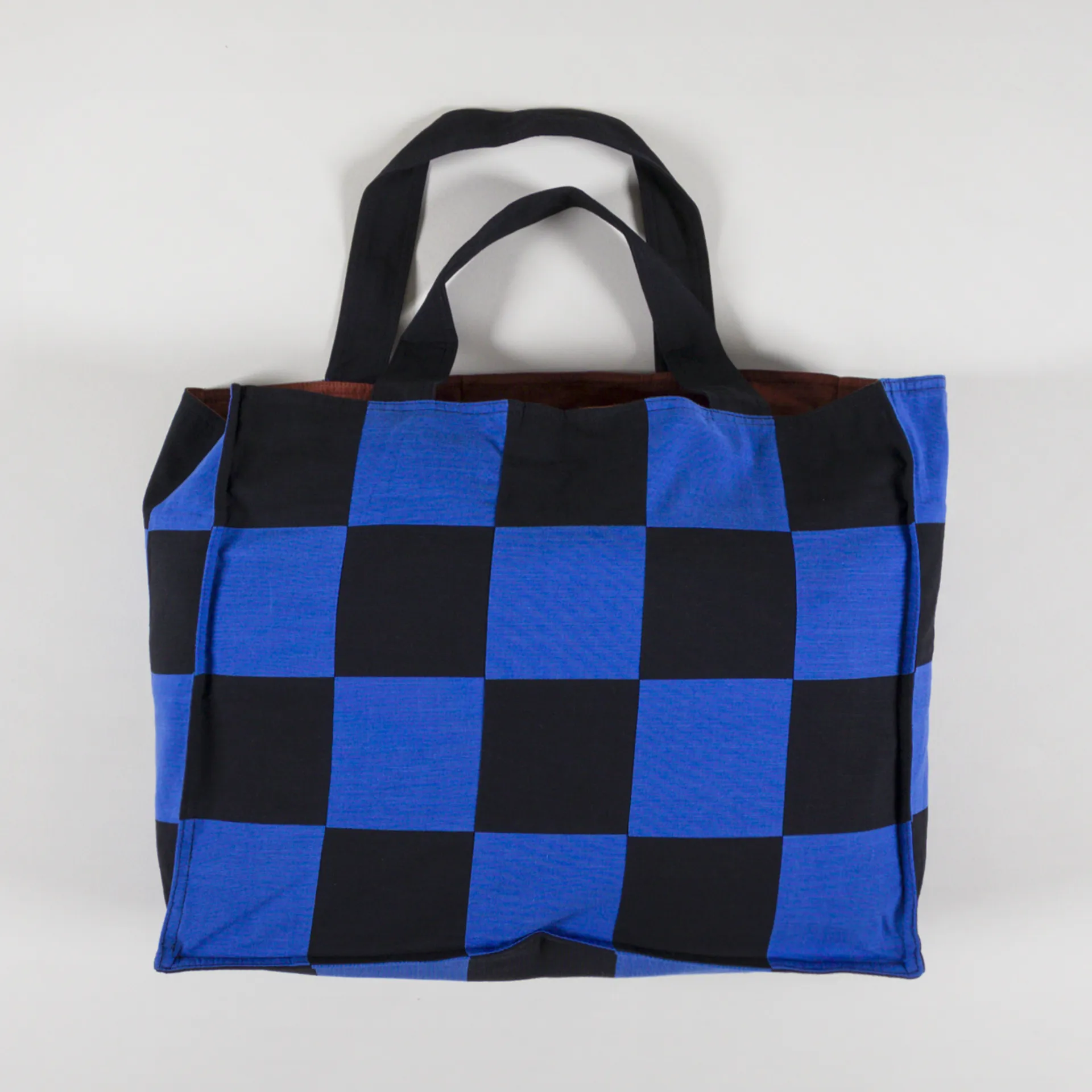 A tote bag from Sideline, made from a lightweight canvas with a large main compartment and a small pouch to the inside. It has a check pattern.