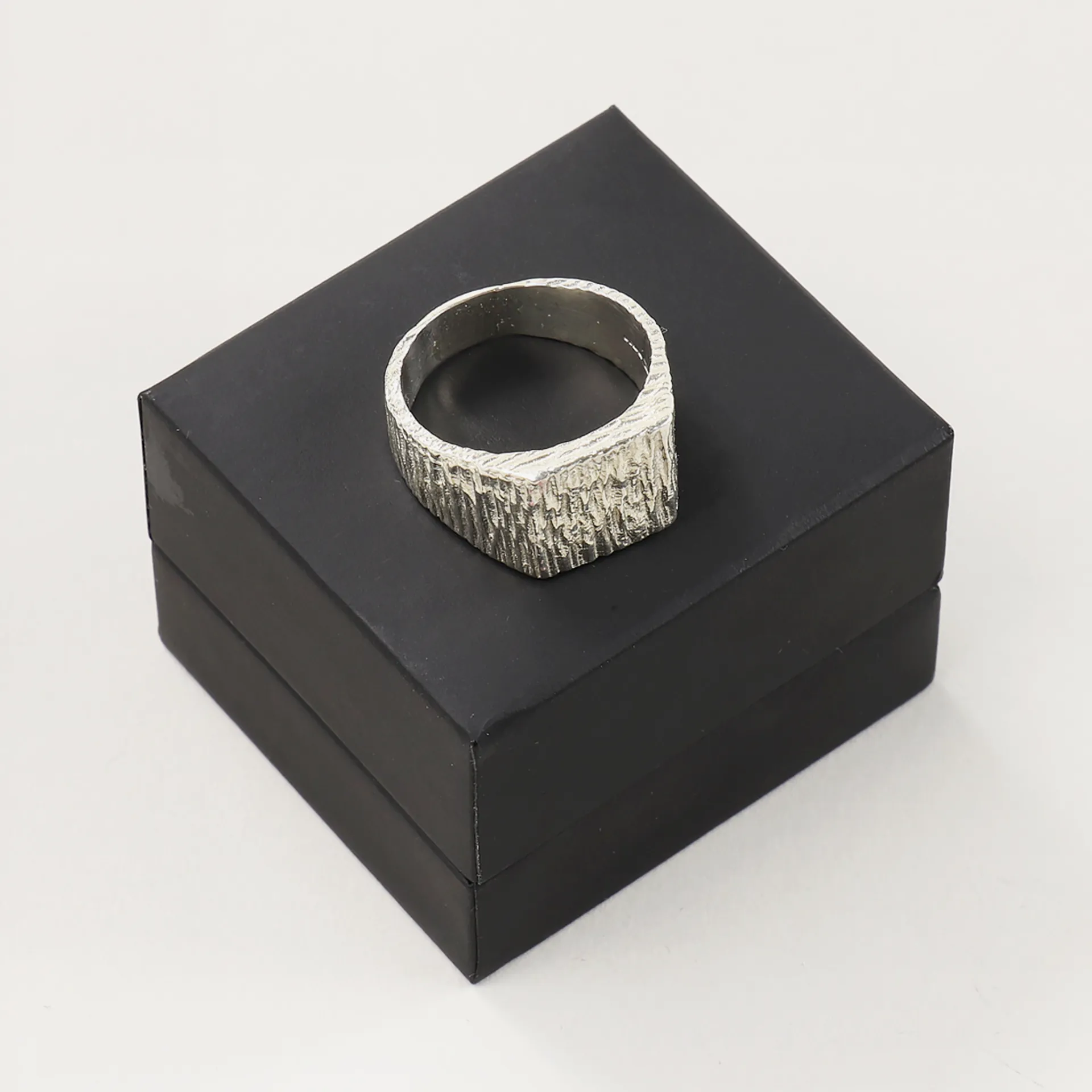 This ring features the 'bark' texture, with lined and grooves to imitate a tree. It has a thicker face and to the inside it features Hoxton engravement.