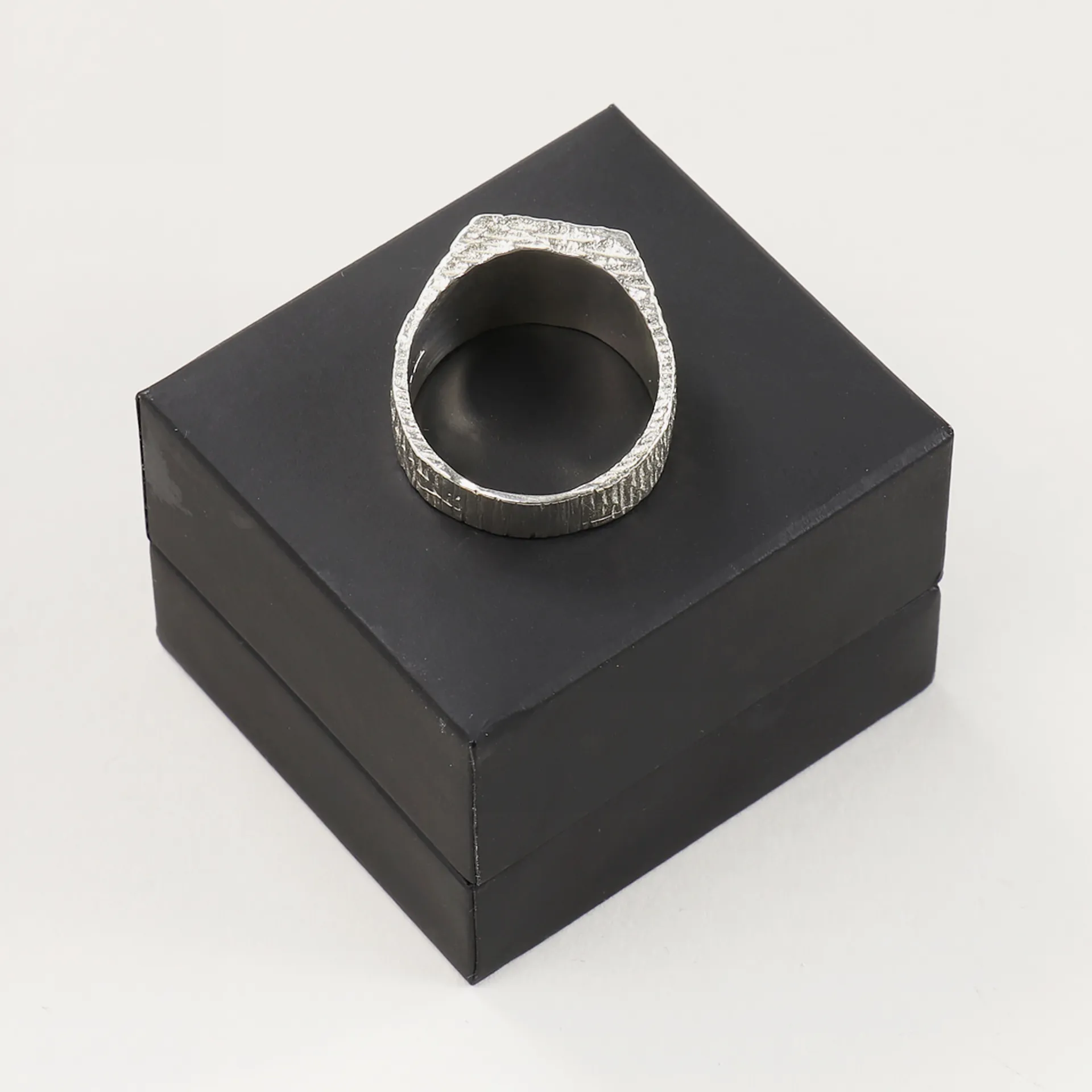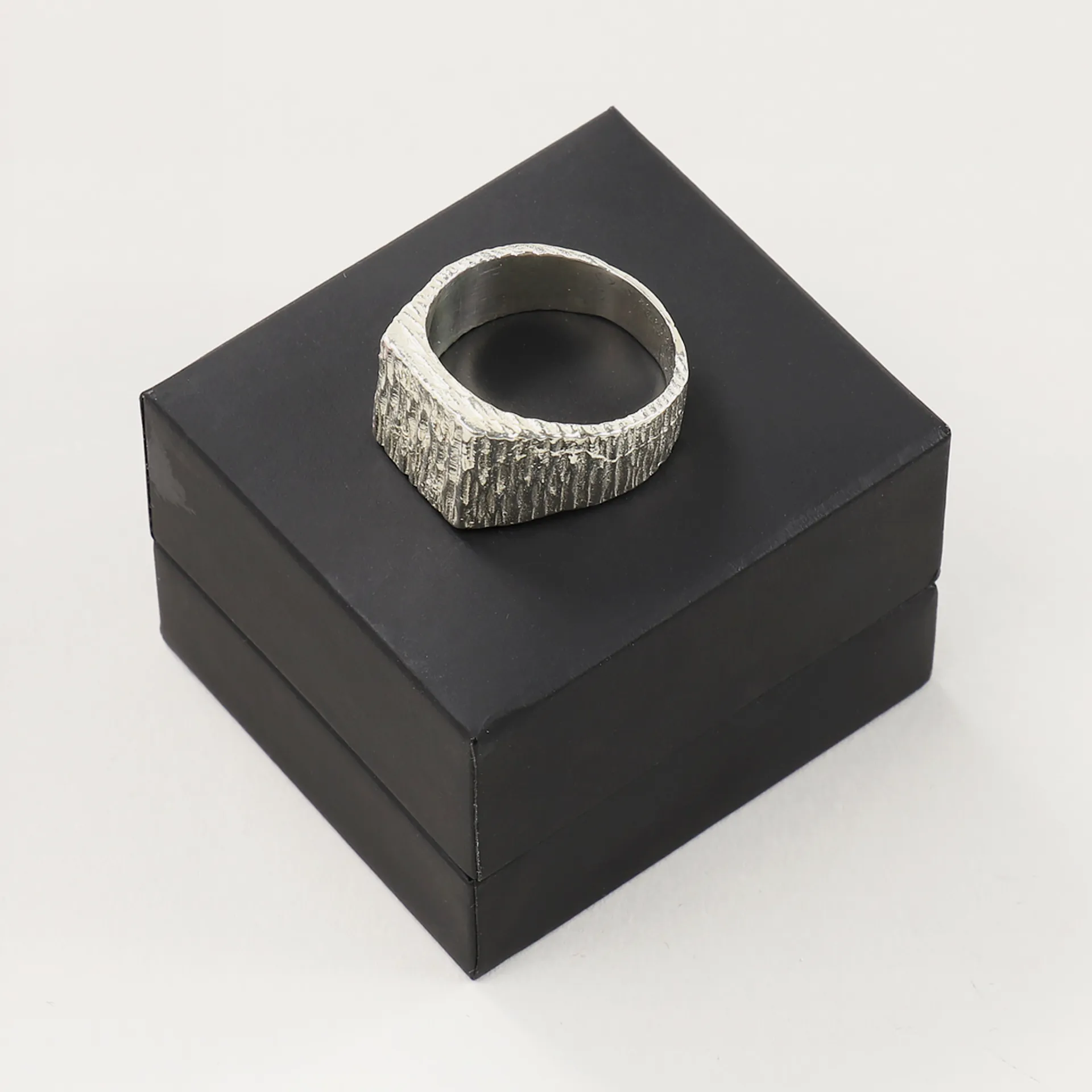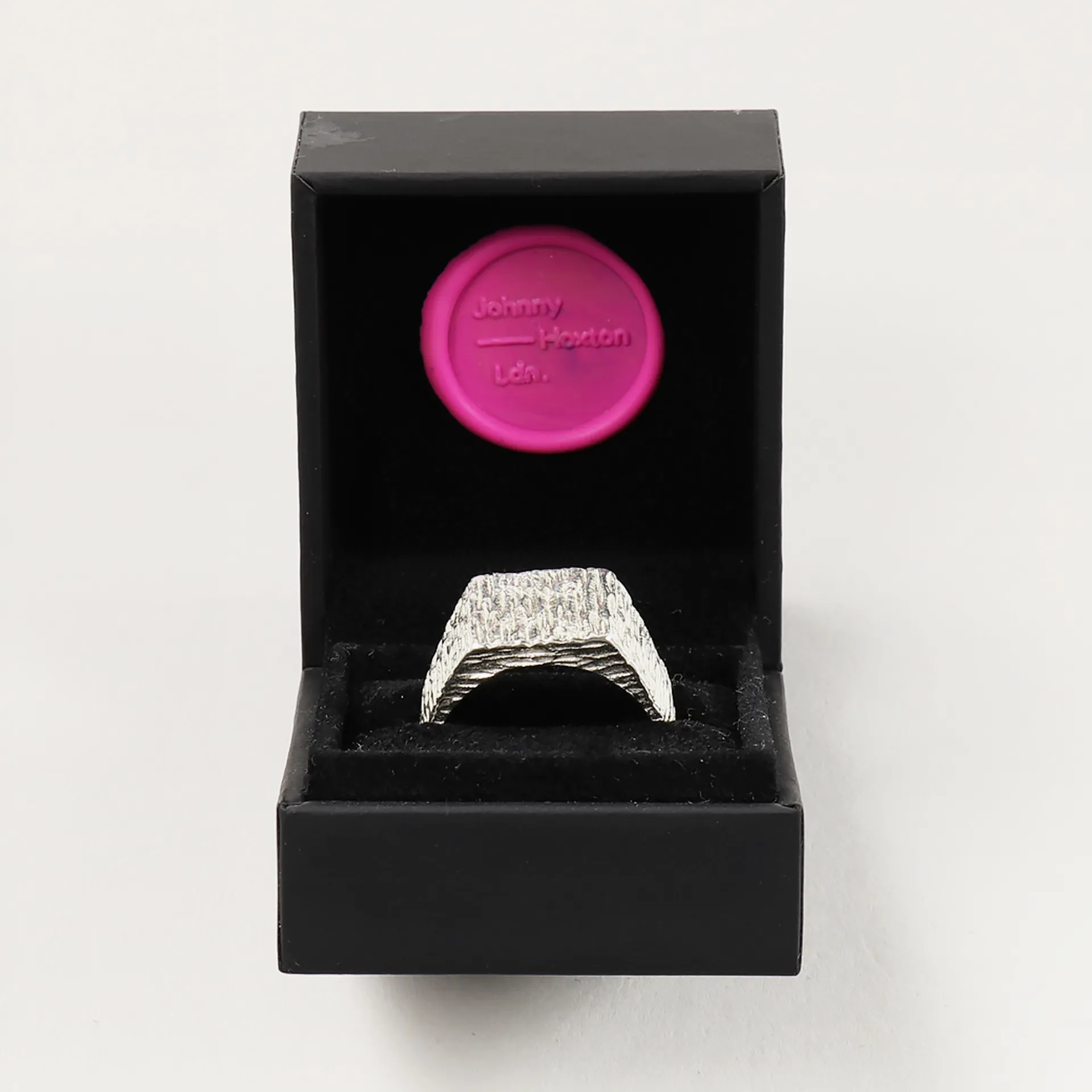 A ring from England's Johnny Hoxton LDN made from sterling silver with a textured 'bark' design and a thicker outer face. The inner features an engraved logo.