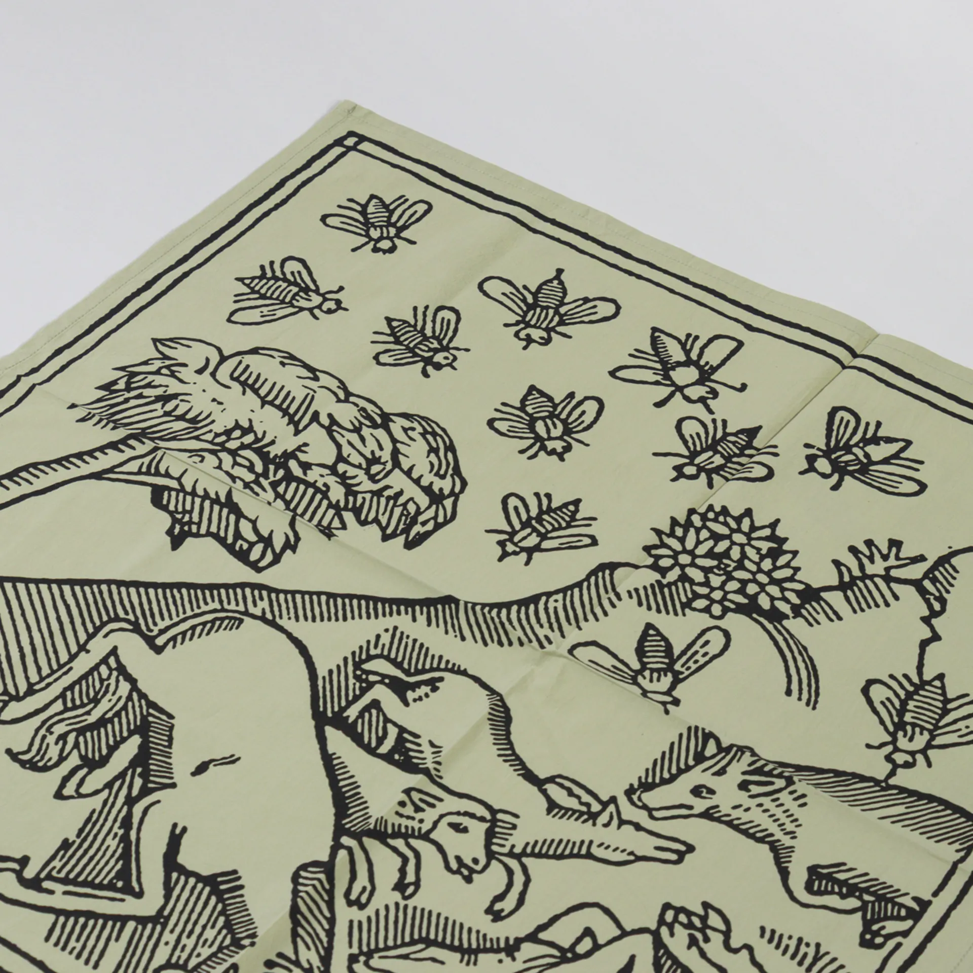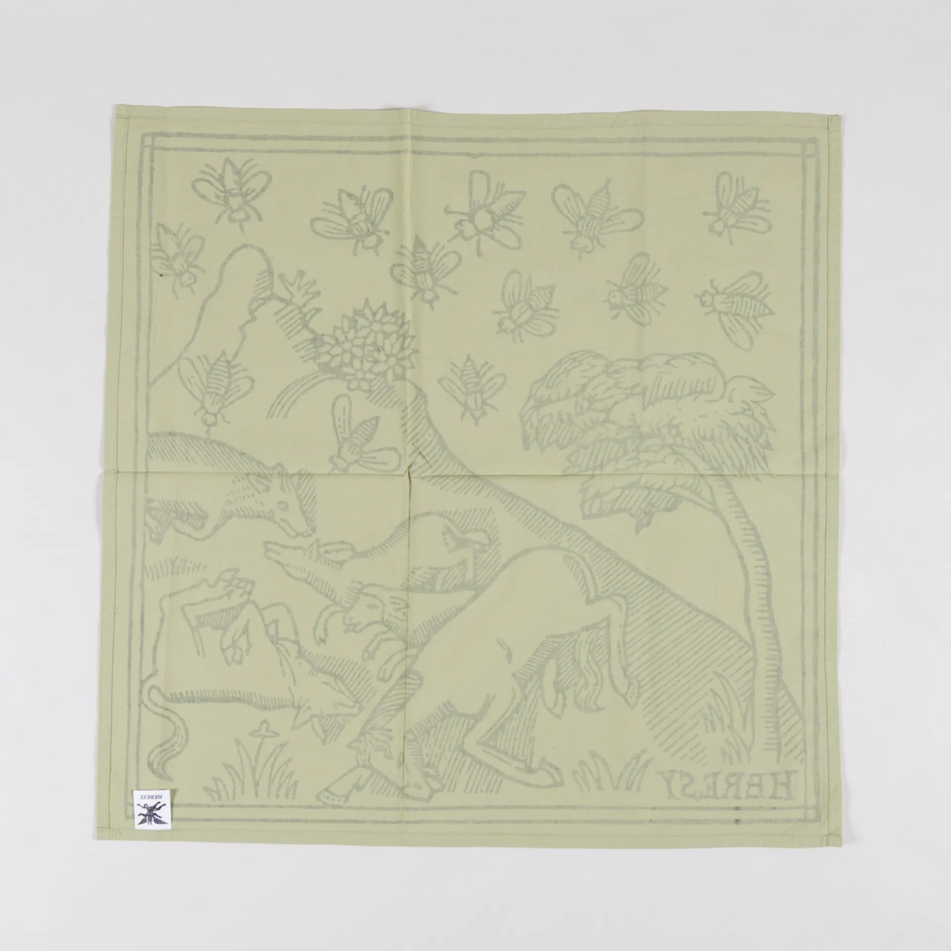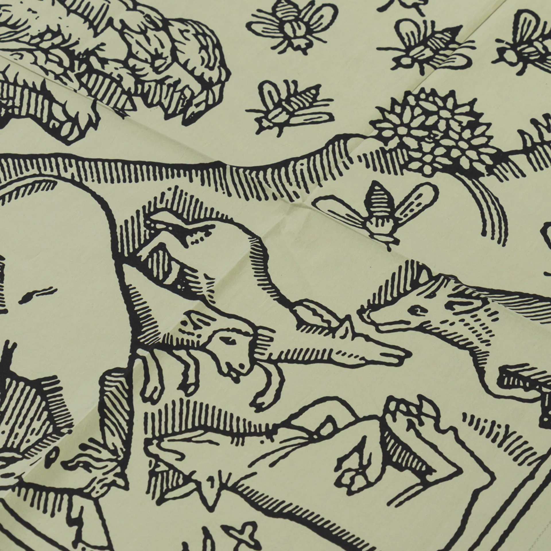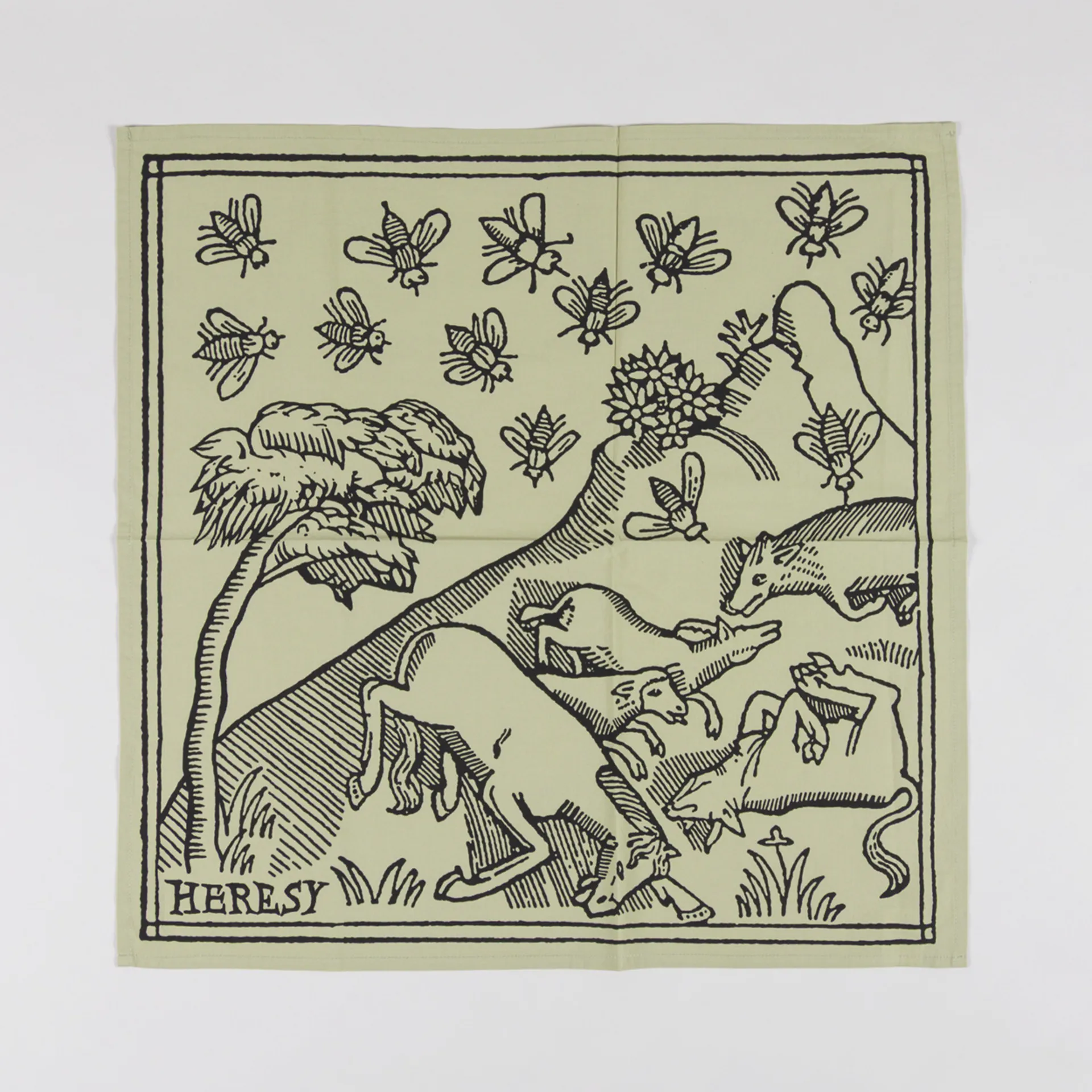 A cotton printed scarf from Heresy featuring 'Plague' woodcut graphics.