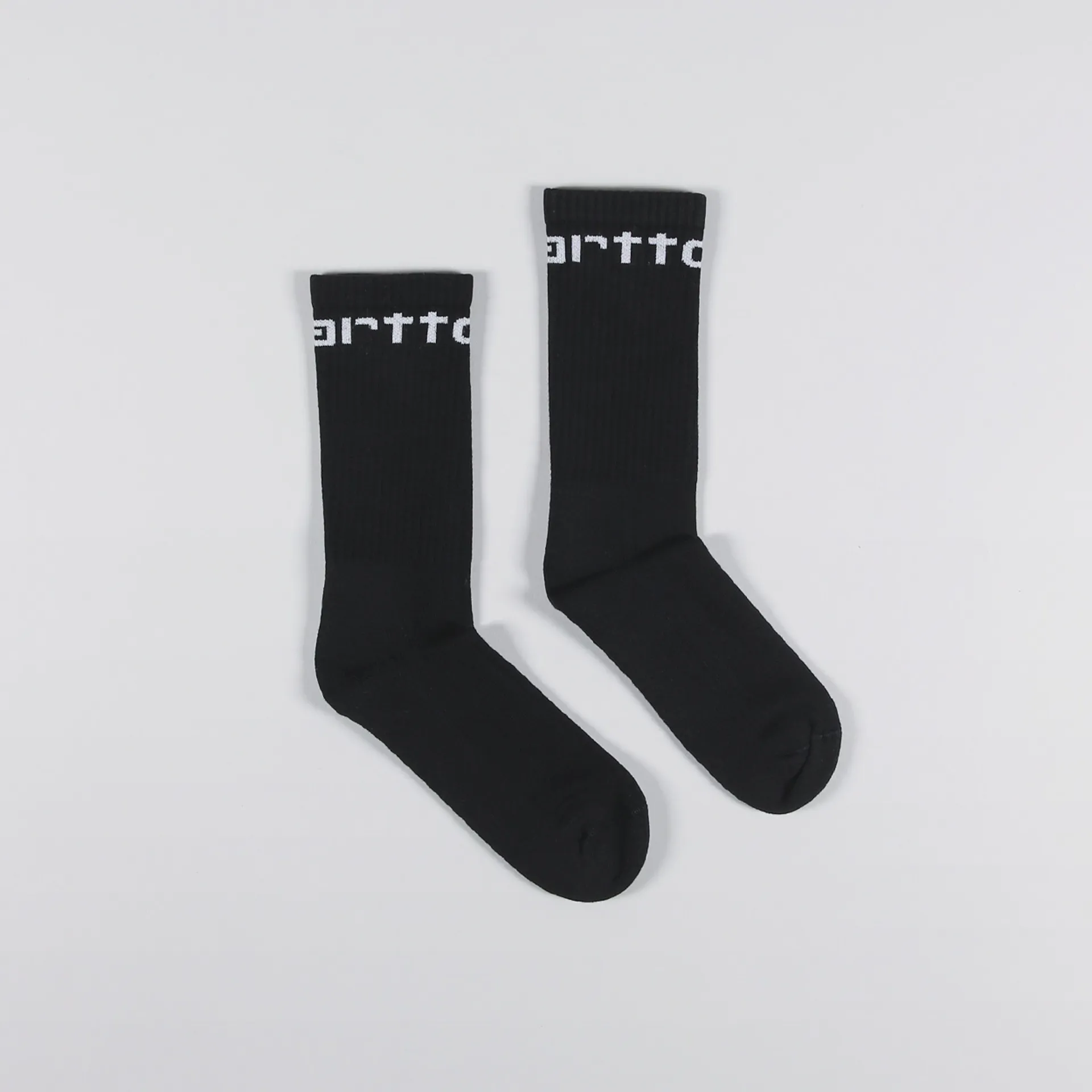 A pair of socks from Carhartt WIP made from 90% cotton, 9% polyester and 1% elastane with a ribbed ankle and crew and a logo around the cuff.