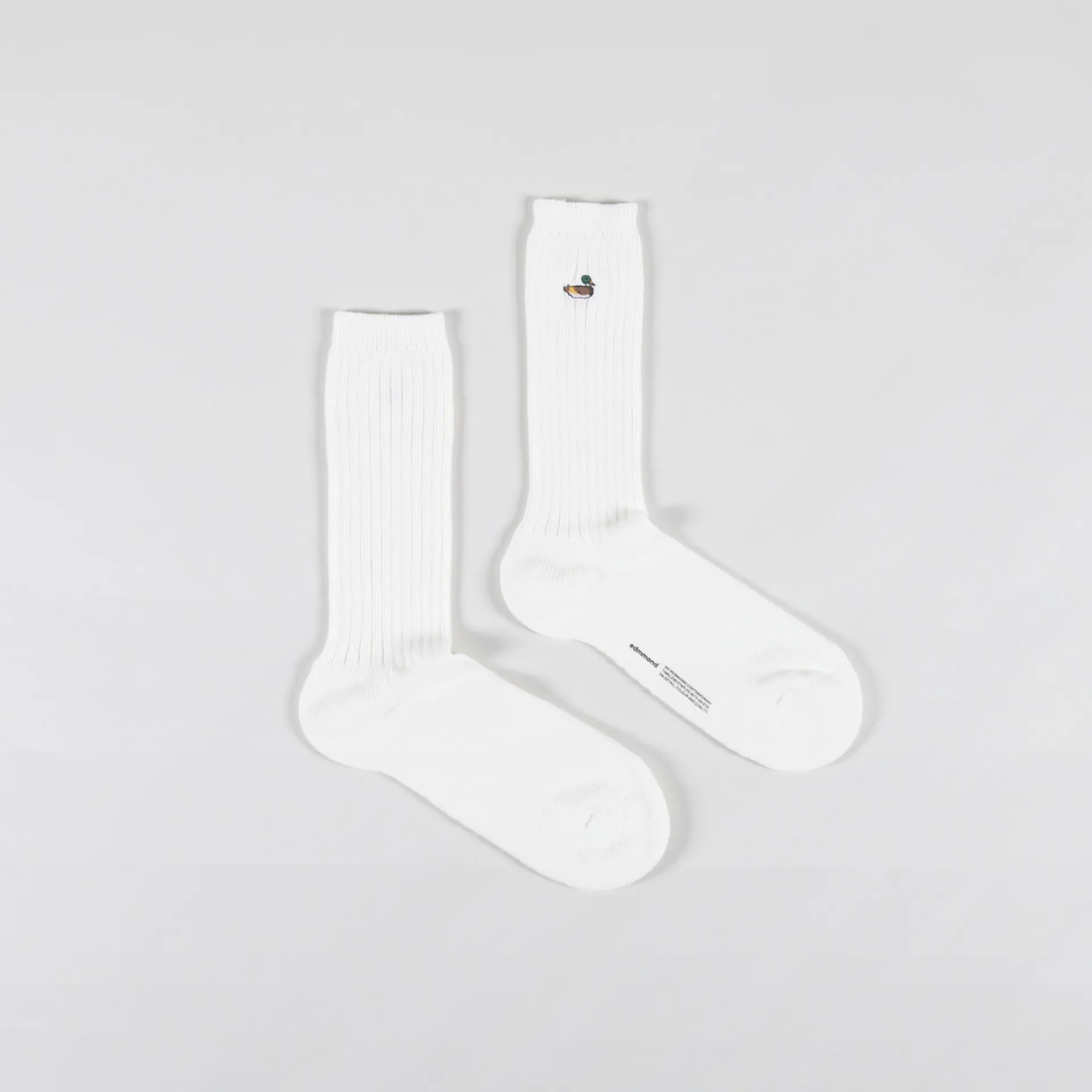 A pair of socks from Edmmond, constructed from a soft cotton blend with a ribbed ankle and an embroidered Duck logo.
