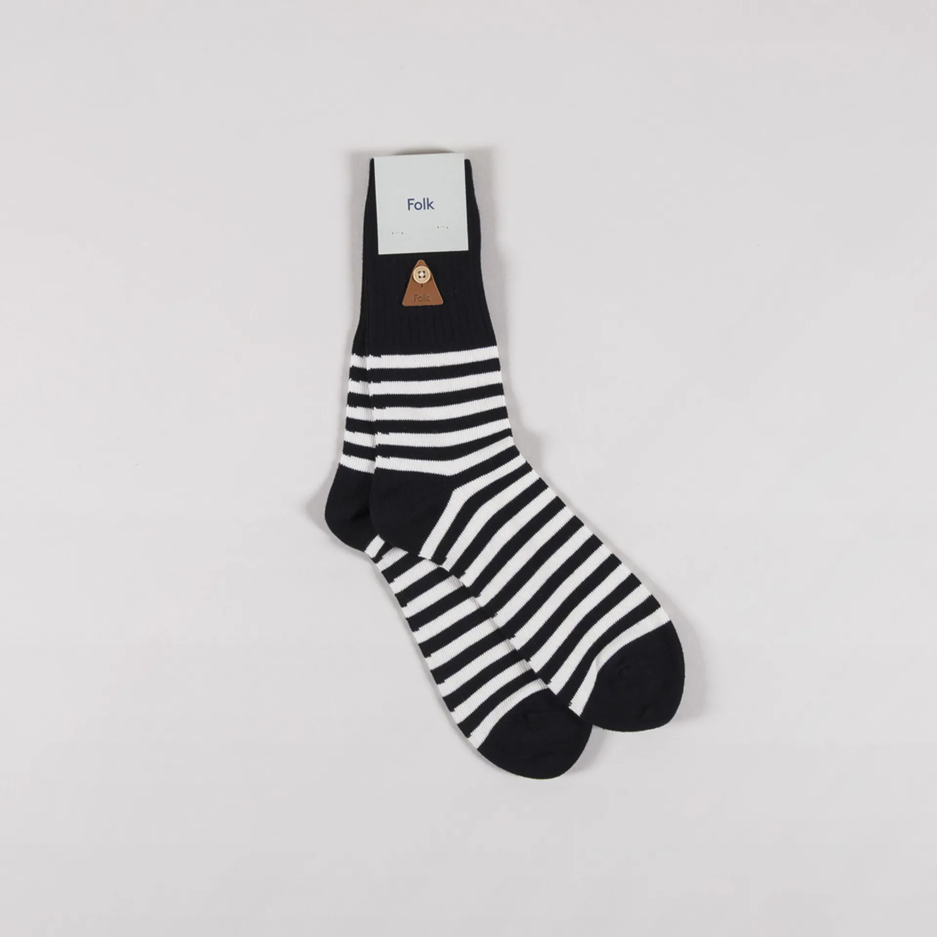 A pair of striped socks from Folk, comprised of 70% cotton, 29% polyamide and 1% elastane. Featuring a ribbed cuff, corozo button and faux leather Folk tab.