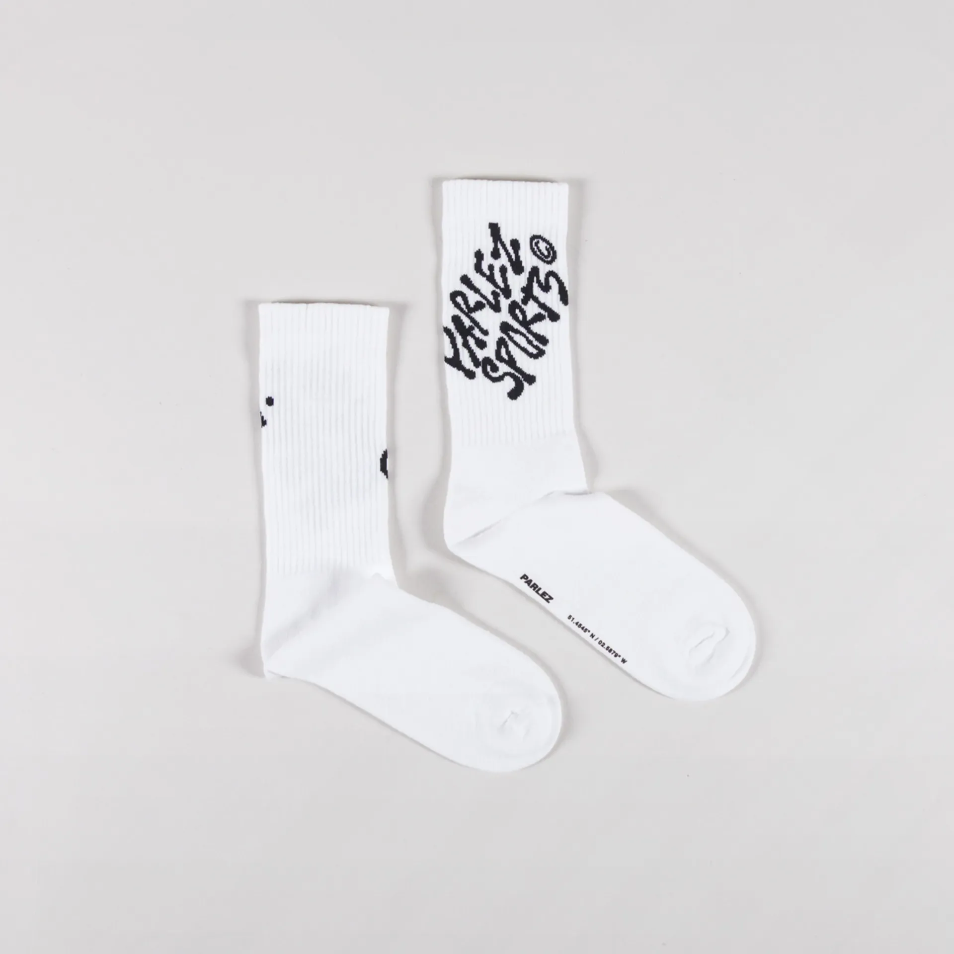A pair of graphic socks from Parlez, constructed from a soft cotton/poly blend with a ribbed ankle, a jacquard design around the cuff and a printed logo to the sole.