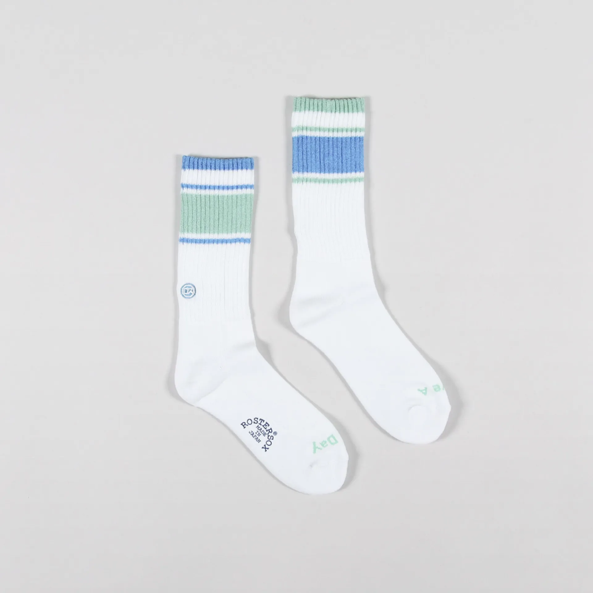 A pair of crew socks from Rostersox, made in Japan from 95% cotton, 3% polyester, 1% nylon and 1% rayon, with a ribbed ankle and an embroidered logo.