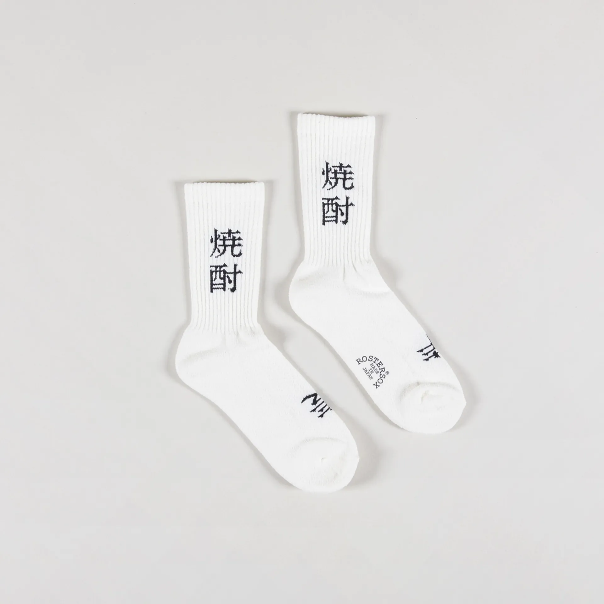 A pair of crew socks from Rostersox, made in Japan from 95% cotton, 3% polyester, 1% nylon and 1% rayon, with a ribbed ankle.
