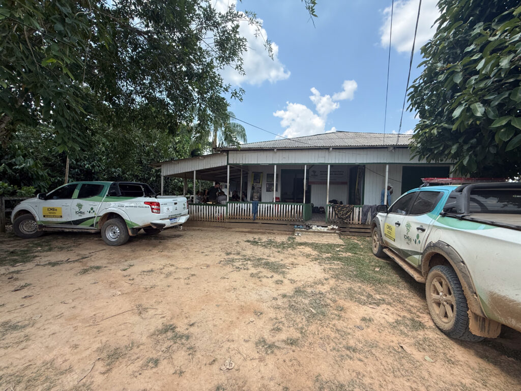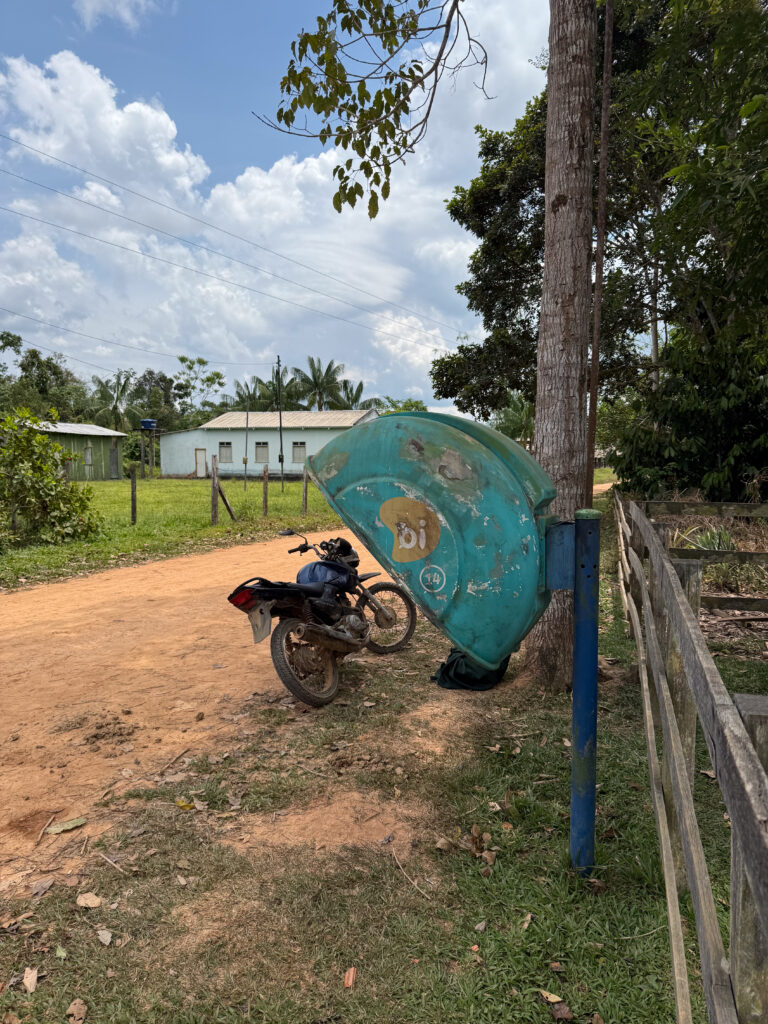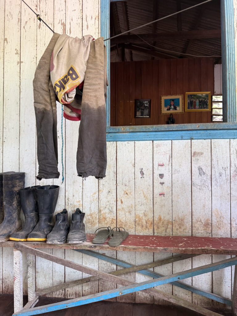 From the small town Sena Madureira we collect the off-road vehicles for the final leg of the journey into the forest. Those that need cigarettes load up on supplies, we pack the pick-ups with our rucksacks, beer, coolers and ice, and head off for two hours on dirt tracks. Final destination point: Cazumba-Iracema. Our destination point is a single-storey wooden building, painted white and green, the paintwork patinaed by the climate. Raised slightly off the ground on two-foot stilts, the building’s windows contain no glass, presumably as there is no requirement in terms of security or protection from the elements here. A good-sized veranda in an L-shape reaches across the front of the building and down one side. With a pleasant aspect across the rural landscape, this will be our hangout for food and beers for the next few days and a meeting place for those involved in the rubber extraction process that we’ve come to see.