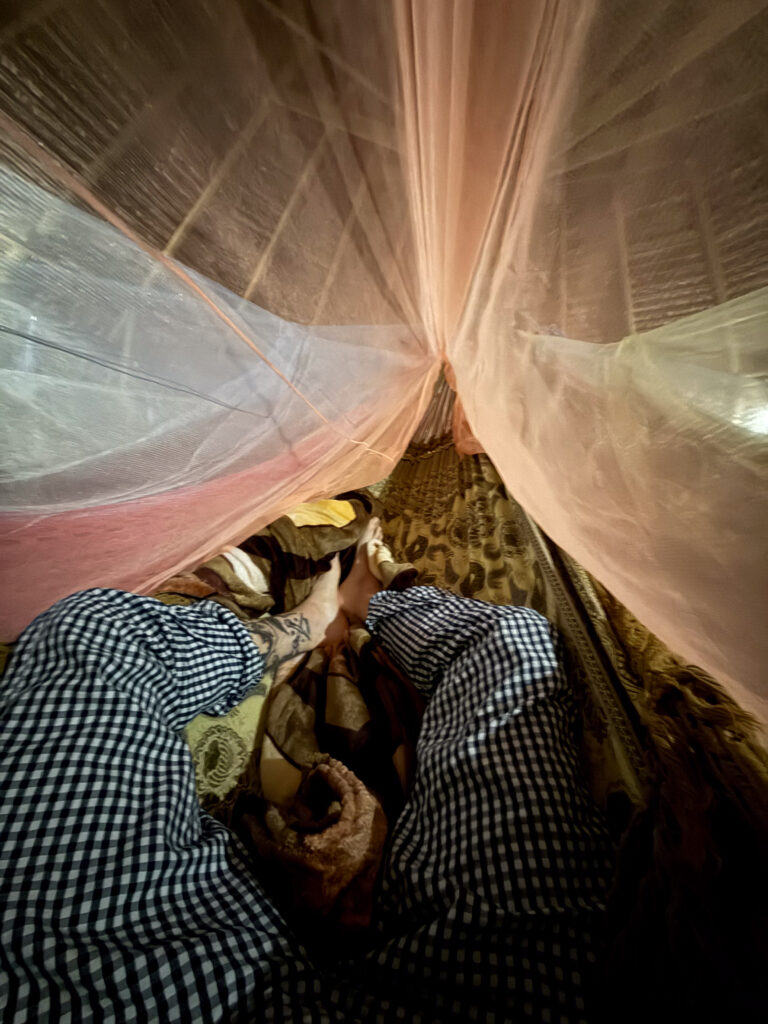 We eat, drink, and jump back into the pick-ups for a 20-minute ride slightly deeper into the trees where we will sleep. The accommodation for the 10 of us: circular, five metres in diameter, with local vegetation as a roof, no walls, dirt floor, and 10 hammocks splaying out from a central supporting mast. I climb into the hammock, pull the mosquito net over, and sleep hits me quick. I’m aware that at some point I’m kicking one of my fellow travellers in the face due to the close proximity of the hammocks, but his snoring suggests I’ve done little to wake him.