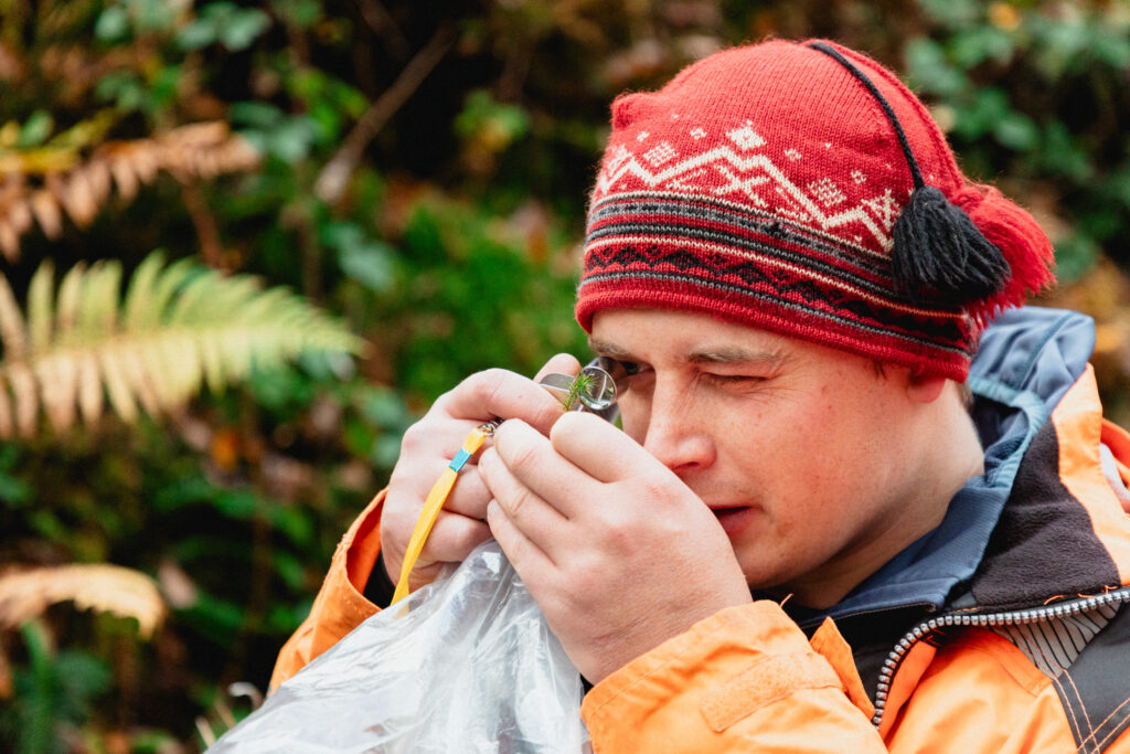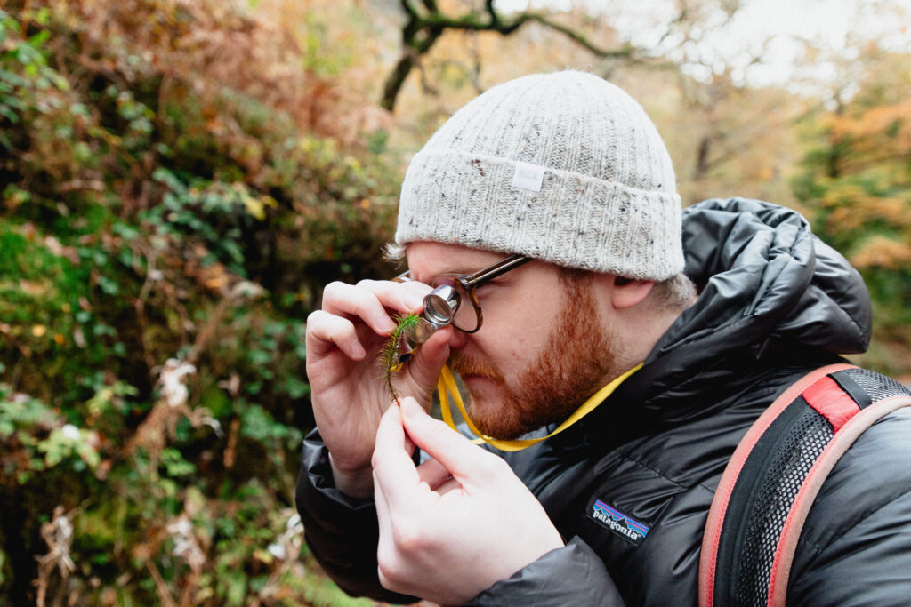 After a quick briefing from Angus we were given a hand lens each in order to view the elements of the mosses and liverworts up close. Using the Plantlife guides, we were tasked with identifying the different species using their identifying elements such as their colours, stem shapes and leaves.