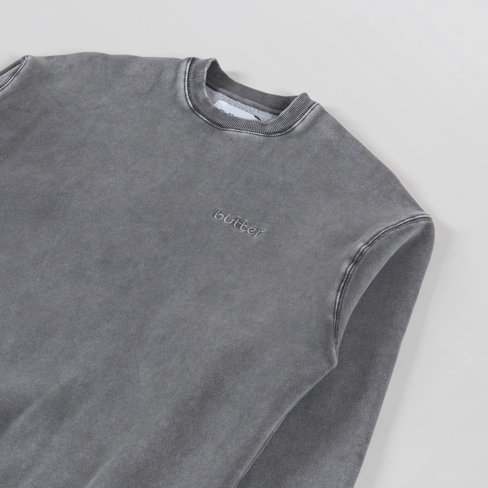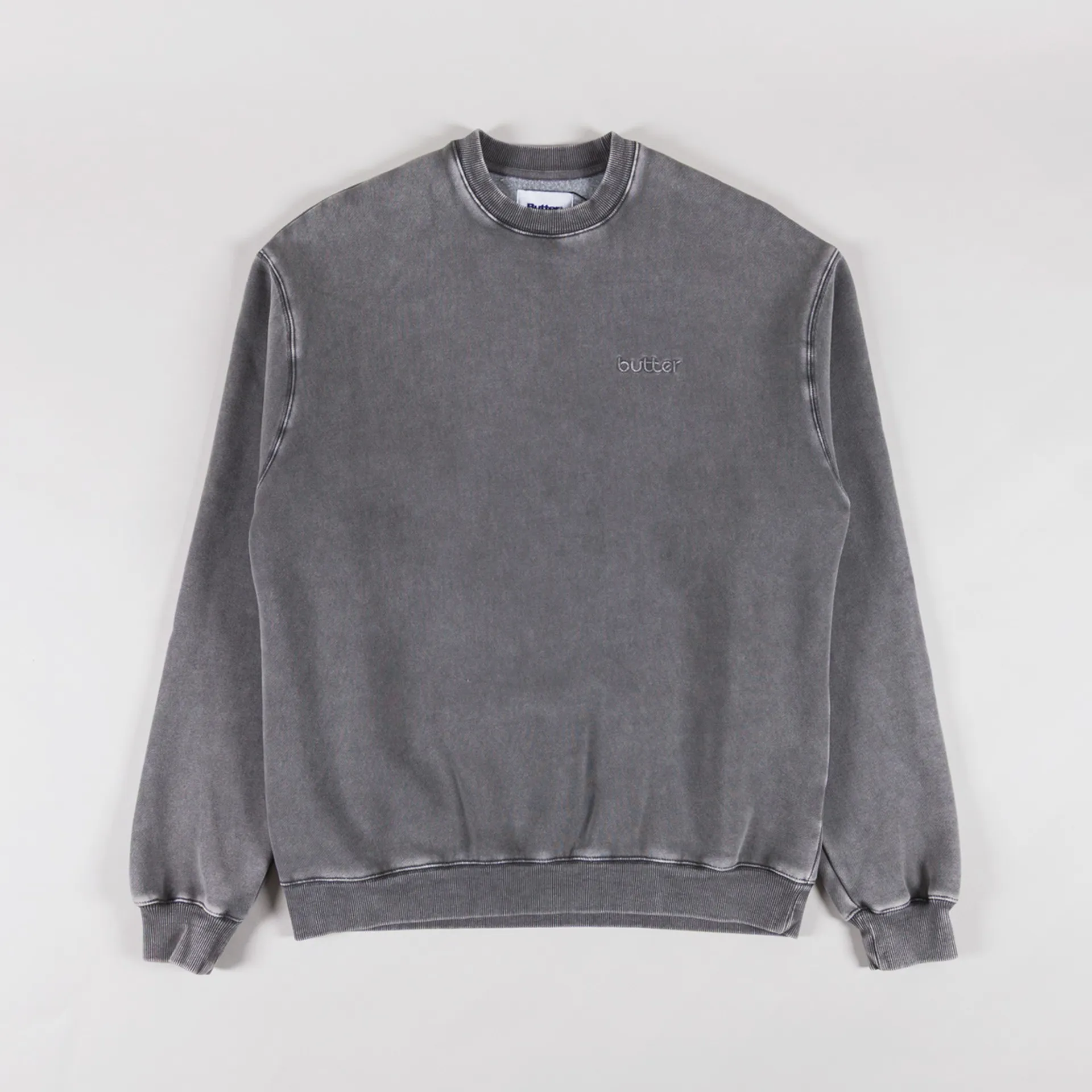 A pigment-dyed sweatshirt from Butter Goods, constructed from a soft cotton-poly blend with a fleece-back lining for comfort. It features a ribbed crewneck, hem and cuffs, finished with a tonal embroidered Butter logo to the chest.