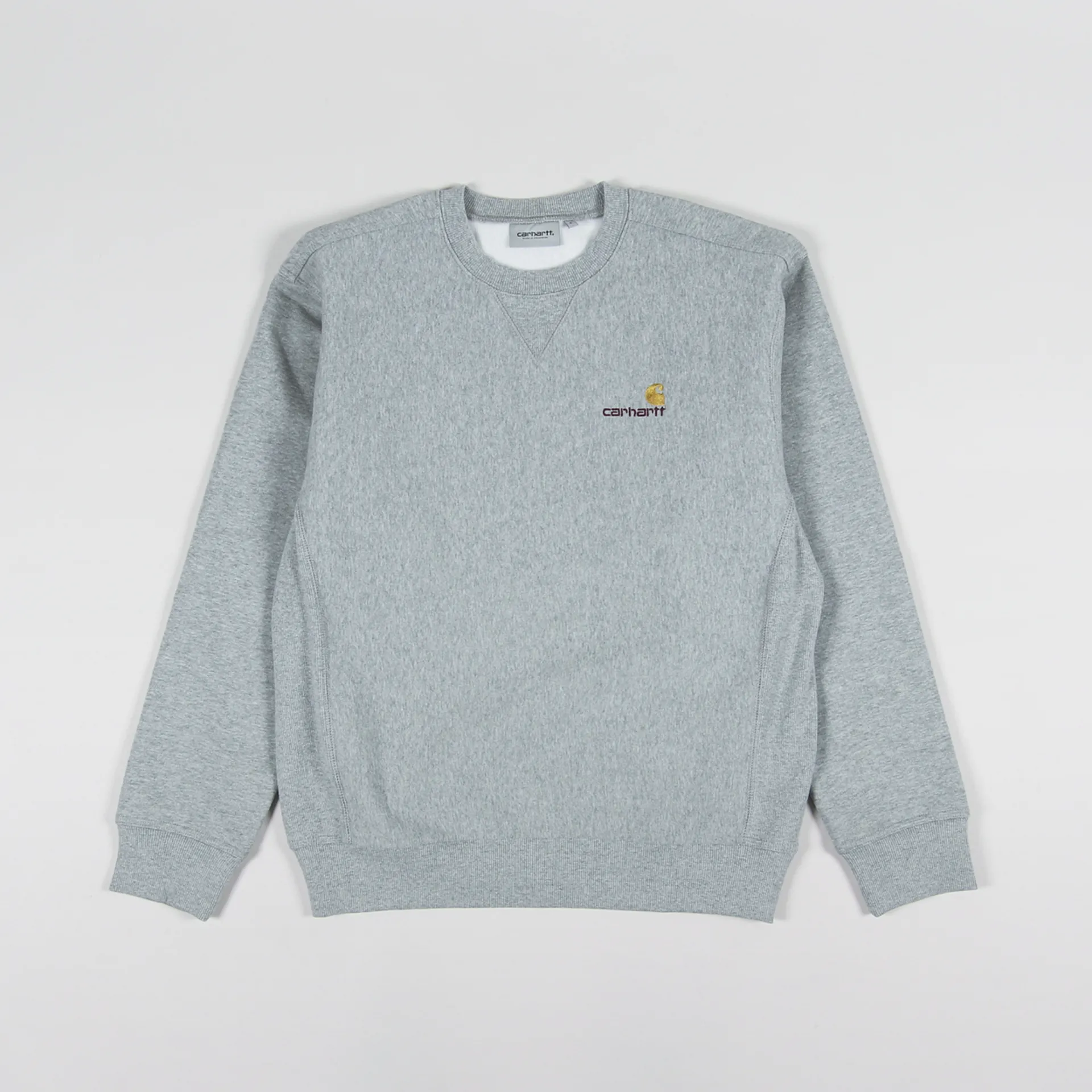 A sweatshirt from Carhartt WIP made from 100% cotton with a warm brushed fleece lining. Has a ribbed crew neck, hem, cuffs and an embroidered American Script logo to the chest.